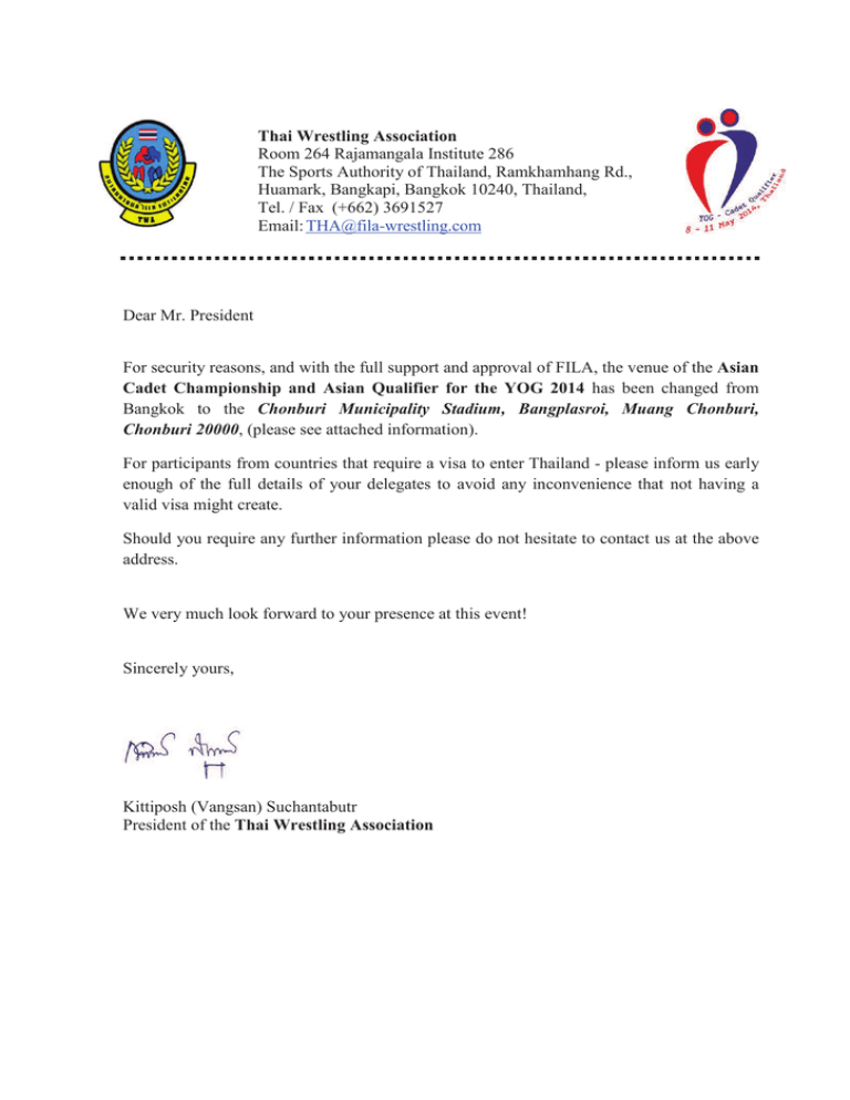 Thai Wrestling Association Room 264 Rajamangala Institute 286 The Sports Authority of Thailand, Ramkhamhang Rd., Huamark, Bangkapi, Bangkok 10240, Thailand, Tel. / Fax (+662) 3691527 Email: [email protected] Dear Mr. President For security reasons, and with the full support and approval of FILA, the venue of the Asian Cadet Championship and Asian Qualifier for the YOG 2014 has been changed from Bangkok to the Chonburi Municipality Stadium, Bangplasroi, Muang Chonburi, Chonburi 20000, (please see attached information). For participants from countries that require a visa to enter Thailand - please inform us early enough of the full details of your delegates to avoid any inconvenience that not having a valid visa might create. Should you require any further information please do not hesitate to contact us at the above address. We very much look forward to your presence at this event! Sincerely yours, Kittiposh (Vangsan) Suchantabutr President of the Thai Wrestling Association CHAMPIONNAT D’ASIE CADET (GR/LL/LF) CADET ASIAN CHAMPIONSHIP (GR/FS/FW) TOURNOI DE QUALIFICATION D’ASIE POUR LES JOJ (GR/LL/LF) ASIAN QUALIFYING TOURNAMENT FOR THE YOG (GR/FS/FW) BANGKOK (THA) – 08-11.05.2014 INFORMATIONS SPECIFIQUES / SPECIFIC INFORMATION Coordonnées du comité d’organisation Details of the organising Committee Coordonnées de la salle de compétition Details of the competition venue Groupe d’âge Age group Catégories de poids / Weight categories (champ.) Nombre de tapis et marque Number of mats and trademark Type de stage pour arbitres Referees’ course type Catégorie d’arbitres Referees’ category Arbitrage pour les Jeux Olympiques de la Jeunesse Refereeing for the Youth Olympic Games Délai pour les inscriptions préliminaires Deadline for the preliminary entries Délai pour les inscriptions nominatives Deadline for the final entries Accueil des équipes Reception of the teams Coordonnées de l’hôtel pour les équipes et arbitres Details of the hotel for the teams et referees Thai Amateur Wrestling Association Room 264, Rajamangala Institute 286 The Sports Authority of Thailand Ramkhamhang Rd., Huamark Bangkapi Bangkok 10240 – Thailand Tel: (66.2) 369 1527 Fax: (66.2) 369 1527 e-mail: [email protected] Chonburi Municipality Stadium Bangplasroi, Muangchonburi, Chonburi 20000 Cadets selon les Règles de Lutte de la FILA Cadet according to the FILA Wrestling Rules Hommes / Men 42-46-50-54-58-63-69-76-85-100 kg Femmes / Women 38-40-43-46-49-52-56-60-65-70 kg ------------------------------------------------------------------------------Qualification JOJ // YOG Qualifier : - LL/FS : 46-54-63-76-100kg - GR : 42-50-58-69-85kg - LF/FW : 46-52-60-70kg Les résultats du championnat continental cadet seront qualificatif pour les JOJ, dans les categories de poids concernées. // The results of the cadet continental championship will be taken into account for the YOG, in the concerned categories. 3 tapis Yurttasspor 3 Yurttasspor mats Type II Catégorie I (ou II et III pour les FN qui n’ont pas de cat. I) Category I (or II and III for the NF that don’t have any cat. I) Les arbitres de moins de 40 ans de catégorie II peuvent participer à cette compétition (qualification pour les Jeux Olympiques de la Jeunesse) The Category II referees (younger than 40 years old) can participate in this competition in order to try to be qualified for the Youth Olympic Games Les meilleurs arbitres (de moins de 40 ans – O, I ou II) seront proposés pour les Jeux Olympiques de la Jeunesse The best referees (younger than 40 years old – O, I or II) will be purposed for the Youth Olympic Games 08 mars 2014 08 March 2014 08 avril 2014 08 April 2014 Aéroport International de Bangkok Bangkok International Airport Bangsaen Heritage Hotel 50,54 Bangsaen Beach 1 Road, Saensuk, Muang Chonburi 20130 Tel. (+66) 38 399 890 – 2, 38 399 899 Fax. (+66) 38 383 239 Email. [email protected] www.bs-heritagehotel.com S.S. Bangsaen Beach Hotel 68 Bangsaen Road, Saensuk, Muang, Chonburi 20130 Tel. (+66) 38 381 670, 381 226, 383 575-6 Fax (+66) 38 381 963 E-mail: [email protected] www.ss-bangsaenbeach.com Bangsaen Villa Hotel 178 Bangsaen Beach 1 Road, Saensuk, Muang, Chonburi 20130 Tel. (+66) 38 191 802-3, 382 118, 382 088 Fax (+66) 38 191-800 E-mail : [email protected] www.bangsaenvilla.com Coordonnées de l’hôtel pour les Membres du Bureau Le Casa Bangsaen Hotel de la FILA 13/14 Soi 1 Long-hard Bang Saen Road, Saen Suk, Details of the hotel for the FILA Bureau Members Muang, Chonburi, 20130 Tel. (+66) 38 399 555 Fax. (+66) 38 399-503 E-mail : [email protected] www.lecasa-bangsaen.com Taxe de séjour par jour par personne Fee per day per person CHF 130.Taxe par jour pour personne supplémentaire Fee per day for extra persons CHF 150.Coordonnées du lieu d’accréditation Details of the accreditation place Bangsaen Villa Hotel Organizer bank account Adresse du site Internet du championnat Address of the championship website Bank name: Thai Military Bank Branch: Royal Air Force Headquarters Bank account: Thai Amateur Wrestling Association Account N°: 0572180263 IBAN: TMBKTHBK www.thai-wrestling.com CHAMPIONNAT D’ASIE CADET (GR/LL/LF) CADET ASIAN CHAMPIONSHIP (GR/FS/FW) TOURNOI DE QUALIFICATION D’ASIE POUR LES JOJ (GR/LL/LF) ASIAN QUALIFYING TOURNAMENT FOR THE YOG (GR/FS/FW) BANGKOK (THA) – 08-11.05.2014 PROGRAMME / PROGRAM Lundi / Monday 05.05.2014 Mardi / Tuesday 06.05.2014 09.00-18.00 10.00-12.00 Till 12.00 13.00-14.00 Mercredi / Wednesday 07.05.2014 14.00-14.45 15.00-15.30 10.00-12.00 Till 12.00 14.00-14.45 Jeudi / Thursday 08.05.2014 15.00-15.30 15.00-16.00 16.00-18.00 10.00-12.00 Till 12.00 Vendredi / Friday 09.05.2014 14.00-14.45 15.00-15.30 Arrivée des arbitres (Type II) Arrival of referees (Type II) Stage pour arbitres / Referees’ course Arrivée des délégations / Arrival of the delegations Stage pour arbitres / Referees’ course Inscriptions définitives GR – cat 42-46-50 kg, LF – cat 38-40 k