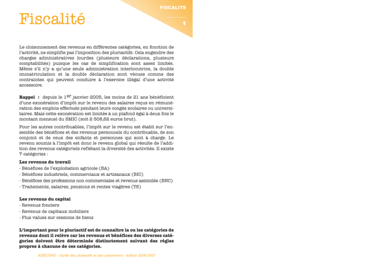 Fiscalité FISCALITE Le cloisonnement des revenus en différentes catégories, en fonction de l’activité, ne simplifie pas l’imposition des pluriactifs. Cela engendre des charges administratives lourdes (plusieurs déclarations, plusieurs comptabilités) puisque les cas de simplification sont assez limités. Même s’il n’y a qu’une seule administration interlocutrice, la double immatriculation et la double déclaration sont vécues comme des contraintes qui peuvent conduire à l’exercice illégal d’une activité accessoire. Rappel : depuis le 1er janvier 2005, les moins de 21 ans bénéficient d’une exonération d’impôt sur le revenu des salaires reçus en rémunération des emplois effectués pendant leurs congés scolaires ou universitaires. Mais cette exonération est limitée à un plafond égal à deux fois le montant mensuel du SMIC (soit 2 508,62 euros brut). Pour les autres contribuables, l’impôt sur le revenu est établi sur l’ensemble des bénéfices et des revenus personnels du contribuable, de son conjoint et de ceux des enfants et personnes qui sont à charge. Le revenu soumis à l’impôt est donc le revenu global qui résulte de l’addition des revenus catégoriels reflétant la diversité des activités. Il existe 7 catégories : Les revenus du travail - Bénéfices de l’exploitation agricole (BA) - Bénéfices industriels, commerciaux et artisanaux (BIC) - Bénéfices des professions non commerciales et revenus assimilés (BNC) - Traitements, salaires, pensions et rentes viagères (TS) Les revenus du capital - Revenus fonciers - Revenus de capitaux mobiliers - Plus values sur cessions de biens L’important pour le pluriactif est de connaître la ou les catégories de revenus dont il relève car les revenus et bénéfices des diverses catégories doivent être déterminés distinctement suivant des règles propres à chacune de ces catégories. ADECOHD - Guide des pluriactifs et des saisonniers - édition 2006-2007 1 1 Chaque catégorie de revenus et de bénéfices fait l’objet d’une définition précise. Dans certains cas, des problèmes de frontières se posent entre revenus catégoriels. Les difficultés proviennent le plus souvent de la prépondérance donnée à une activité par rapport à une autre et de l’existence de liens entre les activités exercées. Des règles particulières sont prévues pour l’imposition de certains revenus perçus à l’occasion d’une activité exercée à titre accessoire. Enfin, l’impôt sur le revenu n’est pas le seul susceptible de concerner les pluriactifs. Les chefs d’entreprise doivent aussi, notamment, s’acquitter de la Taxe sur la Valeur Ajoutée. Les différentes catégories de revenus professionnels Bénéfices Agricoles Il s’agit des revenus tirés de l’exploitation de biens ruraux. Les revenus comprennent : - les produits de la culture (production forestière, agriculture), de l’élevage - les revenus de la propriété lorsque l’exploitation est assurée par le propriétaire (rente du sol, revenus accessoires) - les produits financiers. Les différents régimes d’imposition sont les suivants : Régime du forfait Recettes annuelles inférieures à 76 300 € HT (sauf activités exclues : négociant en bestiaux, boucher). Bénéfice forfaitaire calculé à partir du revenu cadastral en fonction du nombre d’éléments imposables compris dans l’exploitation. Régime réel simplifié Recettes annuelles comprises entre 76 300 et 350 000 €. Il s’applique aux exclus du régime du forfait et aux individuels soumis depuis 5 ans au régime transitoire. Le bénéfice imposable est déterminé selon la règle du bénéfice réel avec des dispositions particulières relatives aux stocks. L’exploitant souscrit une déclaration de résultats comprenant un bilan simplifié. Bénéfices Industriels et Commerciaux Il s’agit du bénéfice réalisé par une personne physique ou morale, agissant pour son propre compte, et provenant d’une profession commerciale, industrielle ou artisanale. Quelques exemples : Pour les activités commerciales : - l’achat de matières ou de marchandises en vue de la revente en l’état ou après transformation - l’achat d’objets en vue de les louer - la fourniture de logement ou de nourriture (hôtellerie, restauration...) - la sous-traitance - les activités financières - les assurances Pour les activité industrielles : - les industries de transformation - les industries extractives ou minières - l’industrie du transport - les entreprises de manutention et de magasinage La profession artisanale se définit comme l’activité manuelle qu’une personne exerce pour son propre compte et dont elle tire un profit qui résulte de la rémunération de son propre travail. Le résultat imposable est le résultat net de l’exercice qui s’obtient par différence entre les produits bruts et les charges supportées dans l’intérêt de l’exploitation. Cette différence peut faire apparaître : - soit un résultat positif : le bénéfice est inclus dans la déclaration d’ensemble des revenus - soit un résultat négatif : le déficit s’imputera sur les autres catégories de revenus. Les différents régimes d’imposition sont les suivants : Régime des micro entreprises Pour les entreprises de vente ou de fournitures de denrées ou de logement : chiffre d’affaires annuel (HT) inférieur à 76 300 € ; bénéfice imposable calculé par application d’un abattement de 72%. Pour les entreprises de prestations de services : chiffre d’affaires annuel (HT) inférieur à 27 000 euros ; bénéfice imposable calculé par application d’un abattement de 52%. Franchise de TVA obligatoire. Régime réel simplifié Chiffre d’affaires annuel (HT) compris entre 76 300 et 763 000 euros pour les entreprises de vente ou de fournitures de denrées ou de logement. Chiffre d’affaires annuel (HT) compris entre 27 000 et 230 000 euros pour les p