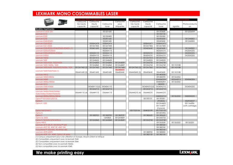 LEXMARK MONO COSOMMABLES LASER Cartouches Return Programme Cartouche Cartouche Haute très haute Cartouche capacité capacité toner Modèles Imprimantes Lexmark E120/E120n Lexmark E210 Lexmark E220 Lexmark E232 Lexmark E240/E240n Lexmark E320/E322 Lexmark E321/E323 Lexmark E330/E332n/E340/E342n/E342tn (1) Lexmark E250d/E250dn Lexmark E350d/E350dn/E352dn Lexmark E450d Lexmark T420d Lexmark T430 Lexmark T520/X520, T522/X522s Lexmark T620/ X620e, T622 Lexmark T630/X630, T632/X632/X632e, T634 Lexmark T640/T642/T644 (1) Lexmark W812 Lexmark W820/X820e Lexmark W840 Lexmark X830e/X832e Lexmark X215 Lexmark X340/X342e Lexmark X422 Lexmark X642e/X644/X644e/ X646/X646e/X646ef/X646dte Lexmark X850e/X852e/X854e Optra™ E310/E312/E312L Optra E Optra K 1220 Cartouche pour étiquettes Cartouches Standard Cartouche Cartouche Haute très haute capacité capacité 0012016SE 0012A7465 (2) 0E352H11E 0E450H11E 0012A7415 0012A8425 0012A6835 0012A6865 0012A7462 0012S0400 0024016SE 0024016SE 0008A0476 0012A7400 0024016SE 0E250A11E 0E250A11E 0E450A11E 0012A7410 0012A8420 0012A6830 0012A6860 0012A7460 0064416XE (3) 0064016HE 0064016SE 0008A0478 0012A7405 0034016HE 0008A0477 0012A7305 0034036HE 0012A6839 0012A6869 0012A7468 0064404XE 0064004HE 0012A7365 (2) 0E352H21E 0E450H21E 0012A7315 0012A8325 0012A6735 0012A6765 0012A7362 0064436XE (3) 0064036HE 0X340H11G(5) 0X340A11G 0012A4715 0012A4710 0X644X11E (4) 0X644H11E 0X644A11E Optra M410/M412 Optra N Optra S 001382925 001382920 Optra Se 3455 12A0825 Optra T/ T610/T612/T614/T616 0012A5845 0012A5840 Optra W810 Lexmark 4019-28-29, WinWriter™ 600 Lexmark 4037-5E, 4047-5E, 4047-5W, ValueWriter™ 300/600, WinWriter 400 Lexmark 4039/4039+ Lexmark 4039 10+, 4049, Optra L/R series (1) Conçus uniquement pour une utilisation en Europe, Moyen-Orient et Afrique (2) Compatible uniquement avec la lexmark T634 (2) Compatible uniquement avec la lexmark T644 (4) Non compatible avec la Lexmark X642e. (5) Non compatible avec la Lexmark X340. We make printing easy 0X644X21E (4) 001382929 0012A0829 0012A5849 Cartouche toner 0012036SE 0010S0150 0012S0300 0024036SE 0024036SE 0008A0475 0012A7300 0024036SE 0E250A21E 0E250A21E 0E250A21E 0012A7310 0012A8320 0012A6730 0012A6760 0012A7360 0064036SE 0014K0050 0012B0090 00W84020H 00X8302KH 18S0090 0X340H21G(5) 0X340A21G 0012A3715 0012A3710 0X644H21E 0013T0101 0017G0154 Autres consommables 004K00199 001382625 0012A5745 001380950 001382150 agrafes Photoconducte urs 0012026XW 0012A8302 0012A8302 0012A8302 0X250X22G 0X250X22G 0X250X22G 0011K3188 0011K3188 0011K3188 0012L0252 0025A0013 0012L0252 00W84030H 0X340H22G 0X644A21E 0X850H21G 0013T0301 69G8256 0012A4605 0011A4097 (2 packs) 0017G0152 00140109A 001382620 0012A0725 0012A5740 0012L0250 001380520 001382760 001382760 001380850 001382100 0012L0252 0X850H22G 0069G8257 0011A4096 (with cartridge) 0012L0252 0012L0251