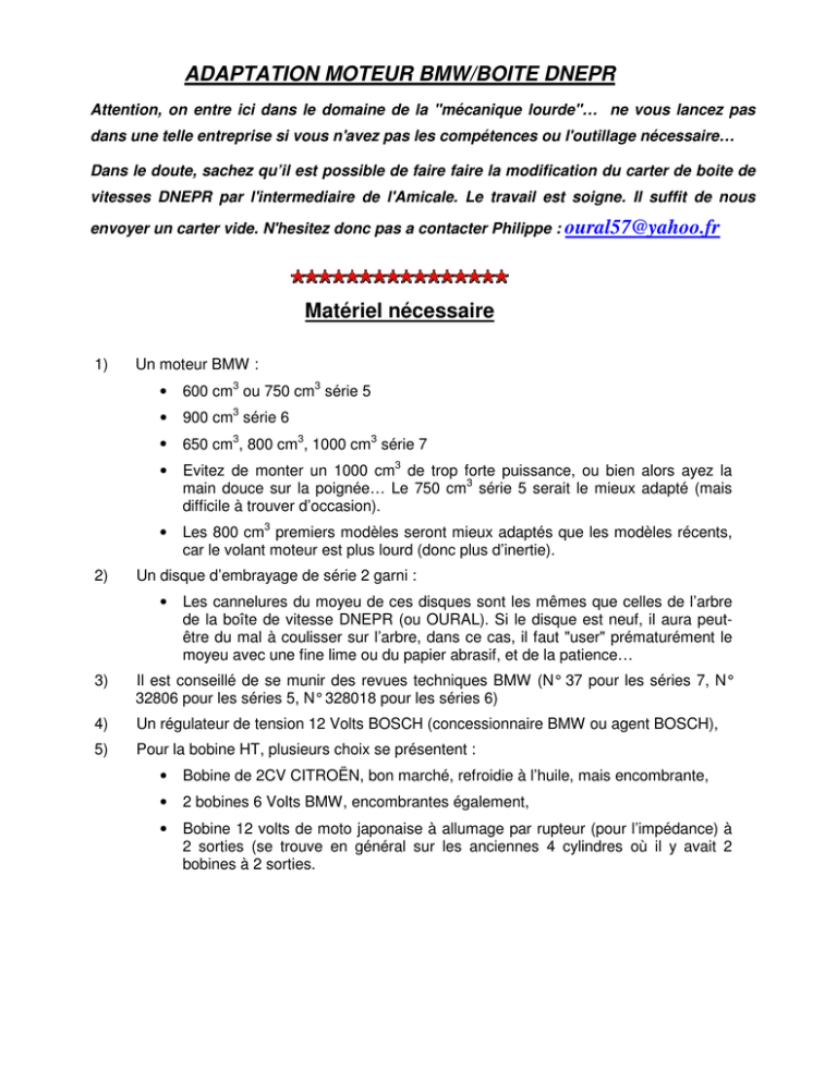ADAPTATION MOTEUR BMW/BOITE DNEPR Attention, on entre ici dans le domaine de la "mécanique lourde"… ne vous lancez pas dans une telle entreprise si vous n'avez pas les compétences ou l'outillage nécessaire… Dans le doute, sachez qu’il est possible de faire faire la modification du carter de boite de vitesses DNEPR par l'intermediaire de l'Amicale. Le travail est soigne. Il suffit de nous envoyer un carter vide. N'hesitez donc pas a contacter Philippe : [email protected] Matériel nécessaire 1) 2) Un moteur BMW : • 600 cm3 ou 750 cm3 série 5 • 900 cm3 série 6 • 650 cm3, 800 cm3, 1000 cm3 série 7 • Evitez de monter un 1000 cm3 de trop forte puissance, ou bien alors ayez la main douce sur la poignée… Le 750 cm3 série 5 serait le mieux adapté (mais difficile à trouver d’occasion). • Les 800 cm3 premiers modèles seront mieux adaptés que les modèles récents, car le volant moteur est plus lourd (donc plus d’inertie). Un disque d’embrayage de série 2 garni : • Les cannelures du moyeu de ces disques sont les mêmes que celles de l’arbre de la boîte de vitesse DNEPR (ou OURAL). Si le disque est neuf, il aura peutêtre du mal à coulisser sur l’arbre, dans ce cas, il faut "user" prématurément le moyeu avec une fine lime ou du papier abrasif, et de la patience… 3) Il est conseillé de se munir des revues techniques BMW (N° 37 pour les séries 7, N° 32806 pour les séries 5, N° 328018 pour les séries 6) 4) Un régulateur de tension 12 Volts BOSCH (concessionnaire BMW ou agent BOSCH), 5) Pour la bobine HT, plusieurs choix se présentent : • Bobine de 2CV CITROËN, bon marché, refroidie à l’huile, mais encombrante, • 2 bobines 6 Volts BMW, encombrantes également, • Bobine 12 volts de moto japonaise à allumage par rupteur (pour l’impédance) à 2 sorties (se trouve en général sur les anciennes 4 cylindres où il y avait 2 bobines à 2 sorties. Montage du moteur Les entraxes de fixation DNEPR et BMW (et URAL) sont exactement identiques, le moteur BMW se place donc dans le cadre DNEPR sans aucun problème. La partie réellement délicate est donc d' accoupler ce moteur avec la boite BMW en assurant un centrage parfait. En effet, si cette condition n' est pas respectée, le disque d' embrayage casse rapidement et il y a également un risque de détérioration de la boite. Au moins 2 solutions s' offrent à vous : • La première, plus rustique, offre l' avantage d' une – relative - simplicité, • La seconde, plus sophistiquée et donc de meilleur aspect, a néanmoins l' inconvénient de nécessiter la destruction d' une boîte de BMW… Dans les 2 cas, le moteur lui-même n' est pas modifié. Méthode 1 Mesurer le diamètre extérieur de la boite Mesurer le diamètre intérieur du moteur BMW Faire usiner un cerceau en acier ordinaire qui compensera cette différence de diamètre : ∅ 236,2 ±0.1 ∅ 227,8 ±0.1 9±1 Emboîter ce cerceau légèrement en force (normalement) dans le carter moteur et le maintenir par des petites vis à teêtes fraisées pour l' empécher de bouger : Confectionner 3 brides dans de la cornière 20 x 20 : Modifier le carter de la boîte pour faire déboucher les trous de fixation sur lemoteur DNEPR en direction des points de fixation sur le moteur BMW : Limer, sur la face extérieure de la boite, les emplacements des brides, de façon à dresser une face parallèlle au plan de joint avec le moteur : On peut alors présenter la boite sur le moteur et la fixer à l' aide des 3 brides en cornières : La tige d' embrayage est celle d' origine trés légèrement meulée. Une tige spécialement usinée est (était ?) vendue par les importateurs Français et Suisses. On peut également en faire tourner une autre : ∅ 9 ∅ 9 ∅ 5 ∅ 5 5 4 .3 1 3 .5 164 5 Echappement : Vous pouvez laisser les coudes DNEPR en ayant au préalable intercalé des rondelles comme explique sur le croquis suivant. Pour une meilleur étanchéite, mettre de la tresse d' amiante (voir magasins de bricolage). Il est possible de monter un échappement BMW complet (silencieux de marque VATIER car de diamètre inferieur.), ou les coudes BMW avec le silencieux DNEPR. A chaque solution correspond une petite adaptation. Branchements électriques : • Si Vous abandonnez le régulateur DNEPR au profit d' un régulateur BMW,qui se branche sur la fiche au dessus du moteur,les branchements se réduisent alors à peu de choses. • Brancher une masse sur le moteur et amener le + de la batterie sur la grosse cosse du pont de diodes.Le démarreur électrique pourra être branché plus tard. • Brancher les fils du voyant de pression d' huile comme celui d' origine. • Pour le témoin de charge, brancher le voyant sur la cosse de l' alternateur BMW, mais dans le tableau de bord, il faut supprimer le fil qui met le voyant à la masse et le remplacer par un fil + . Méthode 2 Cette solution consiste à découper des carters de boîite de vitesses DNEPR et BMW pour n' en conserver que les partie intéressantes – les points de fixation au moteur pour BMW et la partie "boîte de vitesses" elle-même pour DNEPR) et à souder le tout ensemble… Découpage de la boîte DNEPR, 1ère solution : Découpage de la boîte DNEPR, 2eme solution : Découpage de la boîte BMW : 1) On sépare grossièrement la frette de fixation du reste de la boîte : 2) On prépare, dans du plastique ou de l' alu, une rondelle destinée à compenser l' épaisseur d' emboîtage de la frette, ainsi qu' un plateau de tournage, on monte le tout et on alèse : 3) On fixe ensemble les 2 morceaux de boîtes : 4) On soude et on rectifie l' emboîtage :