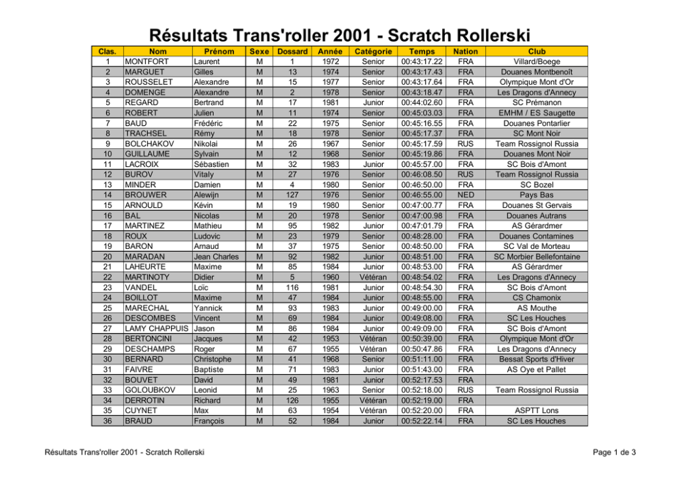 Résultats Trans'roller 2001 - Scratch Rollerski Clas. 1 2 3 4 5 6 7 8 9 10 11 12 13 14 15 16 17 18 19 20 21 22 23 24 25 26 27 28 29 30 31 32 33 34 35 36 Nom MONTFORT MARGUET ROUSSELET DOMENGE REGARD ROBERT BAUD TRACHSEL BOLCHAKOV GUILLAUME LACROIX BUROV MINDER BROUWER ARNOULD BAL MARTINEZ ROUX BARON MARADAN LAHEURTE MARTINOTY VANDEL BOILLOT MARECHAL DESCOMBES LAMY CHAPPUIS BERTONCINI DESCHAMPS BERNARD FAIVRE BOUVET GOLOUBKOV DERROTIN CUYNET BRAUD Prénom Laurent Gilles Alexandre Alexandre Bertrand Julien Frédéric Rémy Nikolai Sylvain Sébastien Vitaly Damien Alewijn Kévin Nicolas Mathieu Ludovic Arnaud Jean Charles Maxime Didier Loïc Maxime Yannick Vincent Jason Jacques Roger Christophe Baptiste David Leonid Richard Max François Résultats Trans'roller 2001 - Scratch Rollerski Sexe M M M M M M M M M M M M M M M M M M M M M M M M M M M M M M M M M M M M Dossard 1 13 15 2 17 11 22 18 26 12 32 27 4 127 19 20 95 23 37 92 85 5 116 47 93 69 86 42 67 41 71 49 25 126 63 52 Année 1972 1974 1977 1978 1981 1974 1975 1978 1967 1968 1983 1976 1980 1976 1980 1978 1982 1979 1975 1982 1984 1960 1981 1984 1983 1984 1984 1953 1955 1968 1983 1981 1963 1955 1954 1984 Catégorie Senior Senior Senior Senior Junior Senior Senior Senior Senior Senior Junior Senior Senior Senior Senior Senior Junior Senior Senior Junior Junior Vétéran Junior Junior Junior Junior Junior Vétéran Vétéran Senior Junior Junior Senior Vétéran Vétéran Junior Temps 00:43:17.22 00:43:17.43 00:43:17.64 00:43:18.47 00:44:02.60 00:45:03.03 00:45:16.55 00:45:17.37 00:45:17.59 00:45:19.86 00:45:57.00 00:46:08.50 00:46:50.00 00:46:55.00 00:47:00.77 00:47:00.98 00:47:01.79 00:48:28.00 00:48:50.00 00:48:51.00 00:48:53.00 00:48:54.02 00:48:54.30 00:48:55.00 00:49:00.00 00:49:08.00 00:49:09.00 00:50:39.00 00:50:47.86 00:51:11.00 00:51:43.00 00:52:17.53 00:52:18.00 00:52:19.00 00:52:20.00 00:52:22.14 Nation FRA FRA FRA FRA FRA FRA FRA FRA RUS FRA FRA RUS FRA NED FRA FRA FRA FRA FRA FRA FRA FRA FRA FRA FRA FRA FRA FRA FRA FRA FRA FRA RUS FRA FRA FRA Club Villard/Boege Douanes Montbenoît Olympique Mont d'Or Les Dragons d'Annecy SC Prémanon EMHM / ES Saugette Douanes Pontarlier SC Mont Noir Team Rossignol Russia Douanes Mont Noir SC Bois d'Amont Team Rossignol Russia SC Bozel Pays Bas Douanes St Gervais Douanes Autrans AS Gérardmer Douanes Contamines SC Val de Morteau SC Morbier Bellefontaine AS Gérardmer Les Dragons d'Annecy SC Bois d'Amont CS Chamonix AS Mouthe SC Les Houches SC Bois d'Amont Olympique Mont d'Or Les Dragons d'Annecy Bessat Sports d'Hiver AS Oye et Pallet Team Rossignol Russia ASPTT Lons SC Les Houches Page 1 de 3 37 38 39 40 41 42 43 44 45 46 47 48 49 50 51 52 53 54 55 56 57 58 59 60 61 62 63 64 65 66 67 68 69 70 71 72 73 74 75 76 BRISSINGER WURTZ BILLET VAXELAIRE VOITOUX BRAND BOURGEOIS-PIN CHOUARD FLOCHON JACQUES JANOD BRAUD GIBERT KRITCHEVSKI NICOT LEGRAND BAILLY-BASIN WURTZ DEMATONS CHARLET JOBARD IBRE VALENZISI GRENARD BAULU ROUSSET VANDEL PERNOT EKTOVA GUILBAUD EMOND VERJUS SMANIOTTO SALVI THOMET GENSSE VOITSEKHOVSKI VIONET TAILLANDIER ROMARY Arnaud PATRICK Benjamin Fabrice Antoine Jacques Elodie Nicolas Jean Michel Brice Etienne Dominique Régis Dmitry Laurent Stéphane Christophe Jean Marie Marc Frédéric Alexandre Christian Nicolas Jean Paul Pierre Yves Eric André Jacques Elena Marie Pierre Patrick Lionel Philippe Antoine Lionel Jérémy Vladimir Nicolas Eric Anne Résultats Trans'roller 2001 - Scratch Rollerski M M M M M M F M M M M M M M M M M M M M M M M M M M M M F F M M M M M M M M M F 54 125 44 117 122 50 155 62 72 81 82 51 76 28 99 88 35 124 66 58 83 80 114 77 38 107 115 101 159 156 70 118 110 108 113 75 30 119 112 152 1984 1984 1981 1982 1984 1948 1982 1971 1968 1978 1960 1965 1982 1971 1967 1965 1963 1954 1963 1969 1944 1958 1984 1964 1966 1957 1936 1943 1981 1963 1953 1980 1957 1981 1965 1984 1959 1979 1963 1971 Junior Junior Junior Junior Junior Vétéran Dames Senior Senior Senior Vétéran Senior Junior Senior Senior Senior Senior Vétéran Senior Senior Vétéran Vétéran Junior Senior Senior Vétéran Vétéran Vétéran Dames Dames Vétéran Senior Vétéran Junior Senior Junior Vétéran Senior Senior Dames 00:52:23.97 00:52:26.00 00:52:27.45 00:52:29.00 00:52:32.00 00:52:39.35 00:52:42.00 00:52:49.21 00:54:06.75 00:54:10.00 00:54:15.00 00:54:27.00 00:54:53.12 00:54:54.00 00:55:26.72 00:55:29.14 00:56:20.30 00:56:31.68 00:56:45.45 00:57:47.00 00:58:39.00 00:58:39.42 00:58:47.16 00:59:01.77 00:59:19.00 00:59:19.97 00:59:59.56 00:59:59.69 01:00:13.16 01:00:39.00 01:02:05.00 01:02:13.90 01:02:25.27 01:02:26.00 01:02:27.00 01:02:34.85 01:03:24.00 01:03:30.00 01:04:06.64 01:05:55.49 FRA FRA FRA FRA FRA FRA FRA FRA FRA FRA FRA FRA FRA RUS FRA FRA FRA FRA FRA FRA FRA FRA FRA FRA FRA FRA FRA FRA RUS FRA FRA FRA FRA FRA FRA FRA RUS FRA FRA FRA SC de la Haute Meurthre CSA de l'E.M.H.M. SC Plateau de Nozeroy Vagney Rochesson SC Plateau de Nozeroy Les Dragons d'Annecy SC Mont Noir SC Plateau de Nozeroy US Cormaranche En Bugey SNAT Langogne SC Morbier Bellefontaine SNAT Langogne Team Rossignol Russia Gaz-Elect Besançon SC Morbier Bellefontaine CSA de l'E.M.H.M. Les Choucas Chamberiens ASPTT Lons US Morez La Mouille ASPTT Nancy Ski Nordique IF FC SOCHAUX FC SOCHAUX Team Rossignol Russia SC Chaux du Dombief SC Sedanais SC Chaux du Dombief US Morez Olympique Mont d'Or AS Oye et Pallet SC Mont Noir Team Rossignol Russia Les Dragons d'Annecy Breizh Ski Roues Page 2 de 3 77 78 79 80 81 82 83 84 85 86 87 88 89 90 91 92 93 94 95 96 97 98 99 100 SOUFFLET WEIBEL VOINET REY CHAUSSARD DELLA-MAURA CANARD LACROIX CARREZ SCHMITT ARNOUX LIARDON BAILLY SALINS ROLLIN BOBILLIER FORCE BLANC LORIER BANHEGYI BÔLE PERRAD PERRIER BIGOTTEAU BONDUELLE Pierre Dominique Bernard Jean François Daniel Bruno Philippe Patrick Jean Claude Thomas Dominique Didier Roland Roger Jean Paul Sylvain Bernard Eric Jérôme Patrice Simon Pierre Yves Edouard Résultats Trans'roller 2001 - Scratch Rollerski M M M M M M M M M M M M M M M M