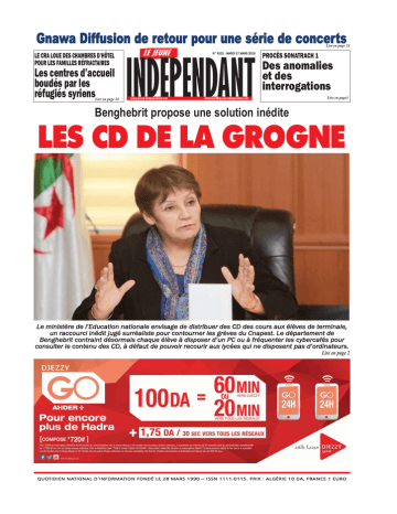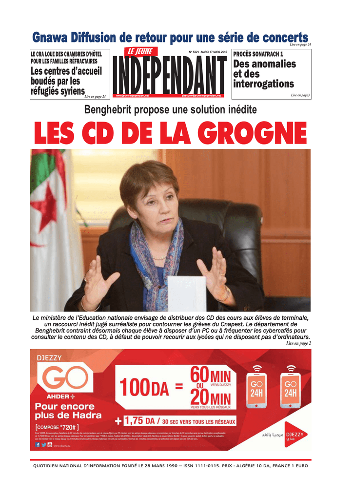 Gnawa Diffusion de retour pour une série de concerts LE CRA LOUE DES CHAMBRES D’HÔTEL POUR LES FAMILLES RÉFRACTAIRES Les centres d’accueil boudés par les réfugiés syriens Lire en page 24 LE JEUNE Lire en page 24 INDEPENDANT www.jeune-independant.net N° 5121 - MARDI 17 MARS 2015 PROCÈS SONATRACH 1 Des anomalies et des interrogations [email protected] Lire en page3 Benghebrit propose une solution inédite LES CD DE LA GROGNE Le ministère de l’Education nationale envisage de distribuer des CD des cours aux élèves de terminale, un raccourci inédit jugé surréaliste pour contourner les grèves du Cnapest. Le département de Benghebrit contraint désormais chaque élève à disposer d’un PC ou à fréquenter les cybercafés pour consulter le contenu des CD, à défaut de pouvoir recourir aux lycées qui ne disposent pas d’ordinateurs. Lire en page 2 QUOTIDIEN NATIONAL D’INFORMATION FONDÉ LE 28 MARS 1990 – ISSN 1111-0115. PRIX : ALGÉRIE 10 DA, FRANCE 1 EURO RÉACTION DES PARENTS D’ÉLÈVES À PROPOS DU CD ÉTABLI PAR LE MINISTÈRE DE L’EDUCATION «C’est ridicule ! Nos enfants ne sont pas des cobayes» LA DÉCISION du ministère de l’Education de mettre un CD à la disposition des élèves dont les professeurs sont en grève depuis le 16 février écoulé n’a pas fait l’unanimité chez les parents d’élèves de la wilaya de Blida. Les réactions de ces derniers sont mitigées et cette décision est qualifiée même par certains de ridicule : «C’est ridicule nous dit la mère d’un lycéen. On s’attendait que la ministre nous propose des solutions plus réalistes.» Elle enchaîne : «Les élèves travaillent en classe avec leurs professeurs, suivent des cours de soutien en dehors des établissements scolaires, et ils arrivent difficilement à suivre. Alors comment vont-ils faire lorsqu’ils se trouveront en face d’un CD ? Et puis nos enfants ne sont pas des cobayes. Si elle (ndlr : Benghebrit) veut lancer une expérience, ce n’est pas sur le dos de nos enfants» Quant à un père que nous avons accosté devant une école primaire dont aucun enseignant ne fait grève, il n’a pas hésité à nous faire cette remarque : «Il faut que la ministre sache que l’Algérie ce n’est pas Hydra !» Développant son idée, il poursuit : «Benghebrit a-t-elle pensé aux enfants qui habitent au fin fond de l’Algérie ? Ce n’est pas tout le monde qui a un ordinateur chez lui, et ce n’est pas tout le monde qui a la connexion Internet à la maison.» Cette décision d’utiliser des CD pour pallier la grève des enseignants observée depuis un mois dans les trois paliers de l’éducation fait l’objet de discussions très tendues au sein de la population blidéenne. Certains disent que c’est mieux que rien, d’autres ne sont pas du tout de cet avis. Ces derniers font le reproche à la ministre de ne citer que les élèves de terminal, lorsqu’elle évoque la grève. «Il n’y a pas que les lycéens qui vont passer le bac. Il y a les élèves du primaire qui passeront l’examen de sixième et ceux la 4e année moyenne pour le BEM», lance un groupe d’hommes. Une enseignante de philosophie a dit ironiquement qu’elle se sentait fière que la ministre ait tenu de tels propos au sujet des avancements dans la réalisation des programmes des élèves de 3e année secondaire. «C’est honorable lorsque la ministre dit que les cours sont assurés à 70 % ou 75 % dans les lycées. Simplement, il faut qu’elle nous dise si ce chiffre est réalisé grâce aux enseignants ou bien aux CD. Et de là vient ma fierté». Cette même enseignante se dit déterminée à continuer à faire grève jusqu’à la satisfaction totale des revendications. Yazid B. 2 À LA UNE QUALIFIANT LA SITUATION DE GRAVE Le ministère de l’Education accuse le Cnapest de prendre en otage les élèves Le conflit opposant le département de Benghebrit au Cnapest semble se durcir, puisque le ministère de l’Education nationale accuse le syndicat des enseignants de prendre en otage les élèves. «J e ne parlerai pas de bras de fer entre le ministère de l’Éducation nationale et le Cnapest, mais plutôt de chantage», a déclaré Nedjadi Messeguem lors de son passage sur les ondes de la Chaîne III de la radio algérienne. S’en prenant vertement au syndicat du Cnapest, dont la persistance de la grève est en train de perturber la période d’examens, il l’a accusé de n’être pas dans son rôle d’organisation socioprofessionnelle mais dans celui d’un «acteur politique». Dans ce contexte, il appelle les associations des parents d’élèves à réagir. Par ailleurs, Messeguem a déclaré que la situation est «grave». «L’école est en danger», a-t-il affirmé, soulignant que les élèves se trouvent «disqualifié » des suites de la régression du niveau scolaire constaté au cours des dix dernières d’années. Il rappelle que son ministère avait engagé des négociations, 10 heures durant, avec les syndicats du secteur autour de 14 revendications «auxquelles, nous avons répondu favorablement». Il dit ne pas comprendre qu’en plus de réclamer un départ à la retraite au bout de 25 années d’activité, le Cnapest revendique un avancement Les cours télévisés et sur CD rejetés par les syndicats Les dernières mesures prises par la ministre de tutelle quant à la mise à la disposition des élèves des cours télévisés ou sur CD, n’ont pas été du goût des syndicats autonomes activant dans le secteur de l’éducation. Rejetant ces mesures, ils estiment que les cours télévisés ou sur CD remettent en cause la relation pédagogique entre l’élève et l’enseignant. Joint par téléphone, le chargé de la communication du Conseil national autonome de l’enseignement secondaire et technique (Cnapest- Elargi), qui poursuit son mouvement de grève illimitée depuis le 16 février dernier, rejette catégoriquement ces mesures prises par l