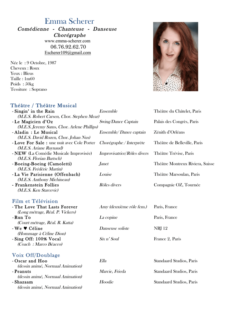 Emma Scherer Comédienne - Chanteuse - Danseuse Chorégraphe www.emma-scherer.com 06.76.92.62.70 [email protected] Née le : 9 Octobre, 1987 Cheveux : Roux Yeux : Bleus Taille : 1m60 Poids : 50kg Tessiture : Soprano Théâtre / Théâtre Musical - Singin’ in the Rain Ensemble (M.E.S. Robert Carsen, Chor. Stephen Mear) - Le Magicien d’Oz Swing/Dance Captain (M.E.S. Jeremy Sams, Chor. Arlene Phillips) - Aladin : Le Musical Ensemble/ Dance captain (M.E.S. David Rozen, Chor. Johan Nus) - Love For Sale : une nuit avec Cole Porter Chorégraphe / Interprète (M.E.S. Ariane Raynaud) - NEW (La Comédie Musicale Improvisée) Improvisatrice/Rôles divers (M.E.S. Florian Bartsch) - Boeing-Boeing (Camoletti) Janet (M.E.S. Frédéric Martin) - La Vie Parisienne (Offenbach) Louise (M.E.S. Anthony Michineau) - Frankenstein Follies Rôles divers (M.E.S. Ken Starcevic) Théâtre du Châtelet, Paris Palais des Congrès, Paris Zénith d’Orléans Théâtre de Belleville, Paris Théâtre Trévise, Paris Théâtre Montreux Riviera, Suisse Théâtre Marsoulan, Paris Compagnie OZ, Tournée Film et Télévision - The Love That Lasts Forever (Long métrage, Réal. P. Vickers) - Run To (Court métrage, Réal. R. Katta) - We ♥ Céline (Hommage à Céline Dion) - Sing Off: 100% Vocal (Coach : Marco Béacco) Amy (deuxième rôle fem.) Paris, France La copine Paris, France Danseuse soliste NRJ 12 Six n’ Soul France 2, Paris Ella Standaard Studios, Paris Marcie, Frieda Standaard Studios, Paris Hoodie Standaard Studios, Paris Voix Off/Doublage - Oscar and Hoo (dessin animé, Normaal Animation) - Peanuts (dessin animé, Normaal Animation) - Shazaam (dessin animé, Normaal Animation) Jeux Vidéos - Watch Dogs (jeu vidéo, Réal. A. Labaronne) Rôles divers Ubisoft Chorégraphie - Love For Sale (M.E.S. Ariane Raynaud) - Nuit d’Ivresse (M.E.S. Dominique Guillo) - So In Love (Comédie musicale M.E.S. Emmanuel Suarez) - Ils Vécurent Heureux (Le Chœur de Pierre Dir. Pierre Babolat) Théâtre de Belleville, Paris En tournée Vingtième Théâtre, Paris MPAA St. Germain, Paris Pedagogie - Coach de danse improvisée (NEW- la comédie musicale improvisée) - Professeure de danse Jazz/Comédie Musicale (Atelier Juliette Moltes, Centre de Danse du Marais – Paris et Académie Temps Danse – Rouen - Professeur d’improvisation (AtelierS FLO) Formation Artistique : Thé â tre - Cours avec Guillaume Bouchède, Sébastien Azzopardi, et Anne Bouvier - Improvisation avec Florian Bartsch et Peter Corser Chant - Cours avec Amy Lavietes, Laure Balon, Marina Albert, - Chant lyrique avec Arlene Thiel - Masterclass avec Nikki Snelson (Legally Blonde, A Chorus Line), Carmel Dean (American Idiot, 25th Annual Putnam County Spelling Bee), Adam Kantor (Rent, Avenue Q), Allan Wright (technique belt) Danse - E.A.T. danse jazz - Assistante pédagogique/chorégraphique de Linda Faoro (moderne jazz) - Studio Harmonic : Classique avec Wayne Byars, Contemporain avec Bea Buffin et Nathalie Pubellier - SwingTap : Claquettes avec Victor Cuno - Ménagerie de Verre : Formation et stages pluridisciplinaires - Ballet Arts Academy : Fondations en danse moderne, contemporaine, et classique - Notions de salsa, rock, tango, Fosse, africaine, breaking, oriental Divers Langues : Bilingue Français/Anglais, Espagnol (courant), Italien, Allemand, et Chinois (notions) Instruments : Piano, Flûte à Bec/Traversière, Hautbois Sports : Escrime, Athlétisme, Arts Martiaux, Natation, Football, Gymnastique, Plongé