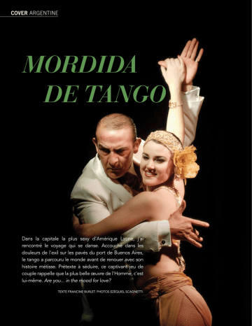 cover argentine Mordida de tango Dans la capitale la plus sexy d'Amérique Latine, j'ai rencontré le voyage qui se danse. Accouché dans les douleurs de l'exil sur les pavés du port de Buenos Aires, le tango a parcouru le monde avant de renouer avec son histoire métisse. Prétexte à séduire, ce captivant jeu de couple rappelle que la plus belle œuvre de l'Homme, c'est lui-même. Are you... in the mood for love? Texte Francine Burlet. Photos EzEquiel Scagnetti. 29 voyages voyages 144 • Février 2010 cover argentine L Le tango, c'est d'abord un son. Et puis il y a ce couple qui s'enlace. Un corps à deux têtes, torses parallèles aimantés pour mieux libérer un jeu de jambes qui s'affole, tel un compas endiablé défiant l'apesanteur, sans jamais s'effondrer. Quick, slow, quick, slow. Huit pas de danse sont de rigueur, rythmant le bal, codifiant les émois. Ses pieds à lui semblent hésiter, aussi directifs qu'impulsifs, puis soudain ils séduisent, enserrent la jambe et renversent les talons aiguilles, acculés à se soumettre, ou transgresser. La mordida. Mais déjà l'étau masculin se desserre et une main ferme emporte la captive plus loin encore, vers une autre figure -nouveau défi d'équilibre- alors que les visages, à un souffle l'un de l'autre, s'ignorent, hermétiquement fermés. Et quand les joues s'épousent enfin, leurs cils se ferment dans un ultime frisson de pudeur alors qu'autour d'eux, sur les banquettes de la milonga, le public a le cœur qui flanche... Mauvais garçons Ce soir, sur la piste de la milonga El Beso, Antonio dit 'El flaco' (le maigre) est la star. À son bras, une jeune morocha, magnifique brunette, se laisse guider dans un abandon à demi maîtrisé. Il ne vient pas à l'esprit du danseur quinquagénaire de jouer les petits coqs. Il cultive la sobriété, dans sa tenue, ses paroles ou ses pas, fidèle à la règle non écrite du tango. Issue des bas quartiers de Buenos Aires au XIXe siècle, cette danse naît dans le monde obscur des 'tangueiros', marins peu fréquentables, fraî- 30 voyages voyages 144 • Février 2010 chement débarqués d'Europe. La poésie sensuelle du tango s'est frottée aux pavés sales et humides du port de La Boca: c'est la danse des «mauvais garçons». Il témoigne de la souffrance des migrants. Il est la culture de l'instant, le bonheur volé. Fin XIXe siècle, il s'installe sur le plan musical au bord du Rio de la Plata, dans les quartiers les plus populaires. Le soldat démobilisé, le paysan sans terre et l'immigré européen dansent alors sur des habaneras, polkas, mazurkas et des valses. Quant aux noirs, ils bougent au rythme du candomblé, marqué par les percussions. De ce creuset de cultures va naître une musique poignante. Son instrument fétiche, le bandonéon, ne joindra l'orchestre qu'après 1900, remplaçant peu à peu la flûte. Taudis et lupanars sont donc les berceaux du tango. Prostituées et femmes de chambres en sont les bonnes fées. En 1905, il y avait dix hommes pour une femme à La Boca! Et si l'on danse alors souvent entre hommes, tout écart tendancieux se règle au couteau. Patrimoine de l'Unesco Inscrit depuis octobre 2009, au 'patrimoine culturel immatériel de l'humanité', le tango prend sa revanche. Jugé indécent et obscène par le pape Pie X, l'empereur d'Allemagne et l'Europe, il y a 100 ans à peine, il fera vaciller Paris, Tokyo et le monde, au début du XXe siècle. Comment ce courant musical a-t-il franchi les mers? Grâce à la Frégate École Sarmiento de la Marine argentine, entre 1905 et 1910, selon diverses sources. Quelques partitions cover argentine de La Morocha d'Enrique Saborido auraient été laissées par des matelots au port de Marseille, d'où elles firent leur chemin jusqu'à Paris. Cette musique qui encense la libération des sens va faire fureur dans les capitales européennes. Pour revenir enfin auréolée de gloire, dans les salons mondains de la bourgeoisie argentine, fraîchement émancipée de la tutelle espagnole (1816) et désireuse de faire de leur capitale le Paris de l'Amérique. Et lorsque Rudolf Valentino se fait gaucho et danse une milonga sensuelle dans le film 'Les quatre cavaliers de l'apocalypse' en 1921, c'est la consécration. Carlos Gardel et Astor Piazolla n'auront qu'à attiser la légende vivante du tango... est doté de quatre jambes qui doivent se coordonner tout en rehaussant leur différence. De la soumission à la suggestion, il n'y a qu'un pas... de tango. Mais une milonga n'est pas un lieu de gymkhanas. Le «code de conduite» du tango est précis: le sens du bal est contraire aux aiguilles d'une montre et la marche arrière est à proscrire en cas d'affluence. L'extrémité de la piste est réservée aux meilleurs danseurs. Attention aux changements de direction intempestifs et interdiction de doubler! Pas question de 'planter' sa partenaire sur la piste sans explication, même si la prestation fut un véritable calvaire! Le cavalier la raccompagne à sa table, sourire aux lèvres, accompagné d'un mot aimable: 'La soirée n'aurait pas été aussi belle sans toi...'. Dans les différentes milongas où El Flaco fera son apparition au fil de la nuit, les favorites potentielles guetteront le cabeceo, ce petit signe de la tête qui a valeur d'invitation. Et si ce n'est celui du maestro, ce sera celui d'un autre homme, quel qu'il soit, pourvu qu'il les propulse dans le cercle lumineux de la milonga, le temps d'une tanda, suite de 4 à 6 morceaux lancée par le DJ. Pas question de devenir une planchadora, usant davantage le fond de robe que les chaussures: une attitude engageante est donc de rigueur. Attention toutefois à ne pas répondre par mégarde au cabeceo Le tango est la culture de l'instant, le bonheur volé, la peur du lendemain suspendue à une paire de bras. Pour un Cabeceo Le temps où les hommes dansaient entre eux faute de femmes est bien révolu. Aujourd'hui, entre les stucs jaunis, colonnes et lustres art nouveau de 