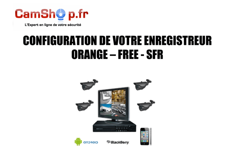 CONFIGURATION DE VOTRE ENREGISTREUR ORANGE – FREE - SFR CONFIGURER SON ENREGISTREUR POUR OBTENIR UNE CONNEXION À DISTANCE 1. Brancher un câble Ethernet entre votre enregistreur et votre box internet. 2. Entrer une adresse IP dans votre enregistreur (partie réseau). Ex : 192.168.0.21 ATTENTION : si votre box est de type Free ou Livebox, il se peut que votre base d’adresse IP soit de type : 192.168.1.1, alors l’adresse IP à entrer dans votre enregistreur sera : 192.168.1.21. 3. Vérifier dans Config port que le port http est 80 4. Configurer votre box internet. CONFIGURER VOTRE BOX INTERNNET 1. Avec une LIVEBOX ORANGE 2. Avec FREE 3. Avec SFR BOX 1. LIVEBOX CONFIGURER VOTRE BOX INTERNET 1. Vérifier que votre Livebox détecte bien votre équipement. Réseaux et services > Equipement > Visualiser. 2. Vérifier que l’adresse Mac correspond bien avec celle que vous trouverez en faisant clic droit sur la page des caméras de l’enregistreur, plus info. 3. Vérifier que le statut soit bien connecté. 4. Changer le nom de l’équipement et inscrire DVR. 1. LIVEBOX CONFIGURER VOTRE BOX INTERNET 1. Aller dans Livebox > Paramètres avancés > DHCP 2. Ajouter une adresse IP Statique en sélectionnant votre appareil (DVR) et entrer l’IP 192.168.1.21 3. Ajouter 4. Sauver 1. LIVEBOX CONFIGURER VOTRE BOX INTERNET 1. Aller dans Livebox > Paramètres avancés > NAT/PAT 2. Entrer le port http tel qu’il est indiqué sur l’écran 3. Entrer les autres ports, tel qu’il est indiqué sur l’écran en sélectionnant « Nouvelle règle » dans la liste déroulante. 4. Sauver 1. LIVEBOX CONFIGURER VOTRE BOX INTERNET 1. Aller dans Livebox > Paramètres avancés > DMZ 2. Ajouter une DMZ en cliquant sur « Créer la DMZ » 2. FREE CONFIGURER VOTRE BOX INTERNET 1. Connectez-vous à votre compte Free.fr 2. Allez dans la rubrique « Internet ». 3. Cliquez sur « Configurez mon routeur freebox » 4. Entrez les informations suivantes et « Envoyer » 3. SFR BOX CONFIGURER VOTRE BOX INTERNET 1. Après avoir branché correctement le DVR, sur l’ordinateur connecté à la Neufbox, rendez-vous à l’adresse suivante à l’aide de votre navigateur habituel : http://192.168.1.1/ 2. Cliquez sur l’onglet « Réseau ». 3. SFR BOX CONFIGURER VOTRE BOX INTERNET 1. Après l’identification, vous arrivez sur la page suivante. 2. Cliquez sur l’onglet NAT 3. SFR BOX CONFIGURER VOTRE BOX INTERNET 1. Ajouter le port vidéo en suivant les étapes suivantes: - - - - - Entrer le nom (ex: VideoDVR), Choisissez les deux types de protocole, plage, Entrez 3356 et 3360 dans les champs « ports externes » et « ports de destination », Indiquez l’adresse IP du DVR configuré précédemment Puis cliquez sur le + 3. SFR BOX CONFIGURER VOTRE BOX INTERNET 1. Ajouter le port de contrôle en suivant les étapes suivantes: - - - - - Entrer le nom (ex: InterneDVR), Choisissez les deux types de protocole, port, Entrez 80 dans les champs « ports externes » et « ports de destination », Indiquez l’adresse IP du DVR configuré précédemment Puis cliquez sur le + ainsi que sur le bouton « Déconnexion » 3. SFR BOX CONFIGURER VOTRE BOX INTERNET 1. Votre box est configurée, il vous suffit de taper: - votre adresse IP : 192.168.1.21 lorsque vous êtes connecté en local - Votre adresse IP public (obtenue en allant sur www.monip.com) lorsque vous êtes à l’extérieur. 2. Connectez-vous UNIQUEMENT depuis Internet Explorer 3. Entrer votre code et nom d’utilisateur d’enregistreur et vous pourrez visionner vos images. L’INSTALLATION DE VOTRE PACK DE VIDÉOSURVEILLANCE EST TERMINÉE Si vous n’arrivez pas à installer votre pack vidéo, malgré les consignes précédentes, n’hésitez pas appeler le 01 83 64 67 00