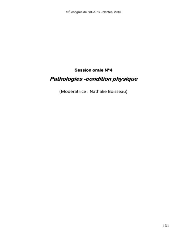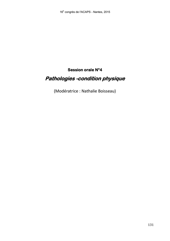 e 16 congrès de l'ACAPS - Nantes, 2015 Session orale N°4 Pathologies -condition physique (Modératrice : Nathalie Boisseau) 131 e 16 congrès de l'ACAPS - Nantes, 2015 Effets d’un entraînement en sprints sur les aptitudes aérobie et anaérobie de sujets obèses Laëtitia Raut Le Gallic1, Sophie Lemoine-Morel1, Ahmed Berriri2, Wiem Kebsi1, Hela Adela3, Morad Hambli2, Saïd Ahmaidi2 & Hassane Zouhal1 1 Laboratoire Mouvement Sport Santé (M2S), Université de Rennes 2-ENS Rennes, Av. Charles Tillon, 35044 Rennes, France. 2 Laboratoire EA-3300 : APERE, Adaptation Physiologiques à l'Exercice et Réadaptation à l'Effort, UFR des Sciences du Sport, Université de Picardie Jules Verne, F-80025 Amiens, France. 3 Centre national de la médecine et des sciences du sport (CNMSS) Tunis, Tunisie. Introduction L’entraînement en endurance induit une perte pondérale, améliore la composition corporelle et augmente les capacités physiques des sujets obèses. Malgré leurs avantages, les exercices longs sont perçus comme fastidieux et non attrayants, avec des effets modestes au regard du volume de travail fourni (Janiszewski et Ross, 2010). C’est pourquoi l’entraînement de haute intensité, avec des effets très souvent comparables voire meilleurs comparés à ceux obtenus suite à l’entrainement continu, (Gibala et coll. 2006) est à présent recommandé pour cette population. Malgré cela, les études ayant vérifié les bénéfices de l’entrainement en sprints chez le sujet obèse sont quasi inexistantes, avec des périodes d’intervention très courtes (2-3 minutes) ; les résultats sont par ailleurs controversés (Whyte et coll. 2010, Skleryk et coll.2013). L’objectif de notre étude est alors de vérifier les effets d’un programme d’entraînement en sprints de 10 semaines sur la condition physique de jeunes hommes obèses. Nous supposons qu'un entraînement en sprints augmente l’aptitude aérobie et anaérobie des sujets. Méthodes 9 hommes âgés de 24,1 ± 4,3 ans dont l’indice de masse corporelle (IMC) était supérieur à 32 Kg/m2 ont suivi 10 semaines d’entraînement en sprints [3 à 4 séances de 30 min par semaine; initialement : 3 x (3 x 8sec) avec une intensité de 75 à 90% PPic, R = 2min] avec une augmentation progressive de l’intensité et du nombre de répétitions. Les indicateurs anthropométriques (poids corporel et pourcentages de masse grasse et de masse maigre, déterminés par DEXA), et la condition physique [VO2pic, consommation pic d’oxygène ; PPic, puissance développée lors du test charge/vitesse (CV) ; Pmax et Pmoy, puissances maximale et moyenne développées lors du test de sprints répétés (CST) (7x10sec, R=1min50sec)] des sujets ont été mesurés en début et en fin d’entrainement. Résultats/discussion Nos résultats montrent une diminution significative du poids corporel des sujets (107±13,7 vs. 97,2±6,3 kg, p<0,05), associée à une diminution du pourcentage de masse grasse (-6,46%, p<0,05). Le pourcentage de masse maigre tend à augmenter (+2,5%). L’entrainement ne modifie pas les valeurs absolues et relatives de VO2pic. Néanmoins, la fréquence cardiaque à VO2pic a diminué significativement (182±7,9 vs. 168,3±15,7 bpm, p<0,05). Les puissances maximales et moyennes, absolues et relatives, développées lors du CV et du CST augmentent en réponse à l'entraînement en sprints (tableau 1). 132 e 16 congrès de l'ACAPS - Nantes, 2015 Tableau 1: Les puissances développées lors du CV et CST Pré-entraînement Ppic (w) 754,5±159,5 CV Ppic/MC (w/kg) 6,8±1,2 Ppic/MM (w/kg) 12,8±2,1 CST Pmoy (w) 745,8±215,3 Post-entraînement 906,6±113,1* 9,3±1,3* 15,7±2,3* 863,1±130,86* CV: Charge-vitesse; CST: sprint répétés sur ergocycle; Ppic: puissance maximale; Pmoy: puissance moyenne; MC: masse corporelle; MM: masse maigre; *:p<0.05 Discussion Cette étude montre pour la première fois qu’un entrainement en sprints de 10 semaines augmente la condition physique de sujets souffrant d’obésité. Ces bénéfices montrent un intérêt dans la prise en charge de ce public qui est très souvent caractérisé par une faible condition physique, favorisant ainsi l'inactivité et le développement de la maladie. Références : Gibala, M.J., Little, J.P., van Essen, M., Wilkin, G.P., Burgomaster, K.A., Safdar, A., et al. Shortterm sprint interval versus traditional endurance training: similar initial adaptations in human skeletal muscle and exercise performance. J. Physiol.,2006 ; 575: 901–911. Janiszewski PM., Ross R. Effects of weight loss among metabolically healthy obese men and women. Diabetes Care, 2010 ; 33(9):1957-9. Skleryk J.R., Karagounis L.G., Hawley J.A., Sharman M.J., Laursen P.B., Watson G.Two weeks of reduced-volume sprint interval or traditional exercice training does not improve metabolic functioning in sedentary obese man. DiabetesObesMetab., 2013 ; 15(12):1146-53. Whyte L.J., Gill J.M.R., Cathcart A.J. Effect of 2 weeks of sprint interval training on health-related outcomes in sedentary overweight/obese men. MetabolismClinical and experimental, 2010 ; 59 : 1421-1428. 133 e 16 congrès de l'ACAPS - Nantes, 2015 Effet d’un programme intermittent de haute intensité sur la perte de masse grasse abdominale chez des femmes ménopausées diabétiques de type 2 Florie Maillard 1, Justine Tépinier 1, Lore Metz 1, Jessica Lavigne 1, Stéphanie Derkaoui 1, Stéphane Penando 2, Nathalie Boisseau 1. 1 : Université Clermont Auvergne, Université Blaise Pascal, EA 3533, Laboratoire des Adaptations Métaboliques à l’Exercice en Conditions Physiologiques et Pathologiques (AME2P), BP 80026, F-63171 Aubière Cedex, France. 2 : Université de Clermont-Ferrand, Hôpital Gabriel Montpied (CHU), France. [email protected] Introduction Le diabète de type 2 (DT2) est corrélé à un pourcentage élevé de masse grasse (MG) et aux risques de développement de maladies cardiovasculaires (MCV) (de Koning et al. 2007). Ce ris