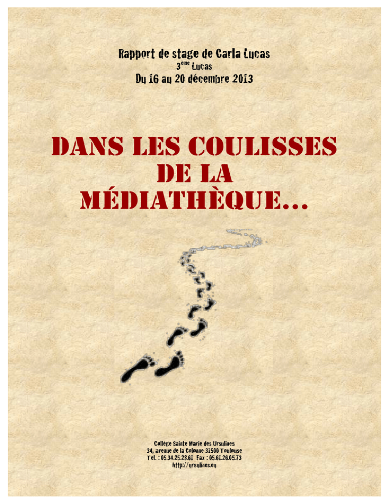 Rapport de stage de Carla Lucas ème 3 Lucas Du 16 au 20 décembre 2013 DANS LES COULISSES DE LA MÉDIATHÈQUE… Collège Sainte Marie des Ursulines 34, avenue de la Colonne 31500 Toulouse Tel. : 05.34.25.28.61 Fax : 05.61.26.05.73 http://ursulines.eu Avant tout, je tiens à remercier Wilma Fasan, Jacques Courdy, Barbara Debiais, Charlotte Valat, Maryline Gini, Sophie Grabielle, Françoise Milhorat, Jean-Michel Ramos, Adeline Pinet, Amélie Castan-Roi, Murièle Modély et les autres employés pour m’avoir fait découvrir leurs métiers qui permettent le bon fonctionnement de la Médiathèque José Cabanis. 2 Sommaire Introduction ...................................................... p.4 Présentation ..................................................... p.5 Situation géographique ...................................................................................... p.5 Horaires .......................................................................................................... p.5 Zoom sur l’établissement .................................................................................... p.6 Organigramme .................................................................................................. p.6 Déroulement de la semaine ..................................... p.8 Atelier de reliure .............................................................................................. p.8 Service entretien, lecture de contes, Circuit du document ..................................... p.10 Pôle Jeunesse ................................................................................................. p.11 L’æil et la lettre, le Magasin central, Intermezzo ................................................. p.13 Action culturelle, Communication, Bibliothèque d’Etude et du Patrimoine ................. p.15 Journée type d’un(e) bibliothécaire .......................... p.18 Mon activité durant le stage .................................. p.19 Conclusion ....................................................... p.20 Annexes 3 Introduction Lors de la recherche du stage, je n’avais encore aucune idée du secteur vers lequel je souhaitais me diriger. Aimant bien le design, la création et la culture, je me tourne d’abord vers des agences de graphisme et de rédaction, mais malheureusement celles-ci ne peuvent pas me prendre. Déçue, je poursuis mes recherches avant de tomber sur un lieu correspondant parfaitement à mes critères et situé juste sous mon nez : la Médiathèque José Cabanis. Pour l’avoir fréquentée de nombreuses fois, je pensais tout connaître de ce temple du livre et de la culture. Et pourtant… Une fois ma demande acceptée, c’est de l’emploi du temps qu’il faut s’occuper ! Et c’est bien là que l’on se rend compte de tous les secteurs à visiter : atelier de reliure, circuit du document, action culturelle, graphisme… Et bien d’autres ! J’ai même la chance de découvrir les entrailles de la Bibliothèque d’Etude et du Patrimoine. Il me faut cependant être bien organisée, car je n’ai pas qu’un tuteur, mais bien 11 ! Alors, vous me suivez ? 4 Présentation Situation géographique : La Médiathèque José Cabanis se situe au nord-est du centre ville de Toulouse (1 allée Jacques Chaban-Delmas), dans le quartier Marengo, près de la gare SNCF. Sur ce plan : - Le point A représente mon domicile Le point B localise la Médiathèque José Cabanis Le point C symbolise le collège Sainte Marie des Ursulines Horaires d’ouverture : Jours Horaires Lundi Fermeture hebdomadaire Mardi 10h-19h Mercredi 10h-19h Jeudi 14h-19h Vendredi 10h-19h Samedi 10h-19h Dimanche 14h-18h 5 Zoom sur l’établissement : La Médiathèque José Cabanis va fêter ses 10 ans cette année, puisqu’elle a vu le jour en mai 2004 à la suite d’une décision prise par le maire pour créer un nouveau pôle urbain dans le quartier Marengo. La Médiathèque porte le nom d’un écrivain académicien toulousain, M. José Cabanis. Sous le nom de « Bibliothèque de Toulouse », un réseau de bibliothèques couvre le territoire toulousain. Celui-ci est constitué de : - la Médiathèque José Cabanis, en tête de groupe, - la Bibliothèque d’Etude et du Patrimoine, qui conserve les collections historiques de la ville, - 19 bibliothèques de quartier, - la Bibliothèque nomade, avec ses 2 bibliobus qui s’occupent des quartiers dépourvus de bibliothèque. Organigramme : Voici un schéma qui résume de façon hiérarchique l’organisation du personnel de la Bibliothèque de Toulouse. Administratrice territoriale La Directrice Conservateur territorial L'équipe de direction Les responsables de pôles/services Bibliothécaire Les agents Agent du patrimoine Conservateur d'Etat Bibliothécaire Assistant du patrimoine Assistant du patrimoine Agent du patrimoine Agent du patrimoine Attaché Rédacteur Adjoint administratif 6 Il y a plusieurs catégories d’employés : • des conservateurs (catégorie A) qui peuvent diriger une bibliothèque ou une équipe au sein de cette bibliothèque. Ils ont des responsabilités à la fois scientifiques (développement des collections, recherche et publications) et administratives (proposition de budgets, de tarifs d’abonnements…) • des bibliothécaires (catégorie A) qui supervisent la constitution, l’enrichissement et l’évaluation des collections de la bibliothèque. • des assistants et assistants qualifiés du patrimoine (catégorie B) qui ont des responsabilités en matière d’acquisition de documents (sélection d’ouvrages, commandes) et de leur mise en valeur (animations...) • des agents et agents qualifiés du patrimoine (catégorie C) qui s’occupent de la réception des documents commandés, de leur équipement (pose des adhésifs, codes barres, cotes) et de leur rangement dans la bibliothèque. Ces emplois, qui font partie de la filière culturelle de la fonction publique territoriale (FPT), sont