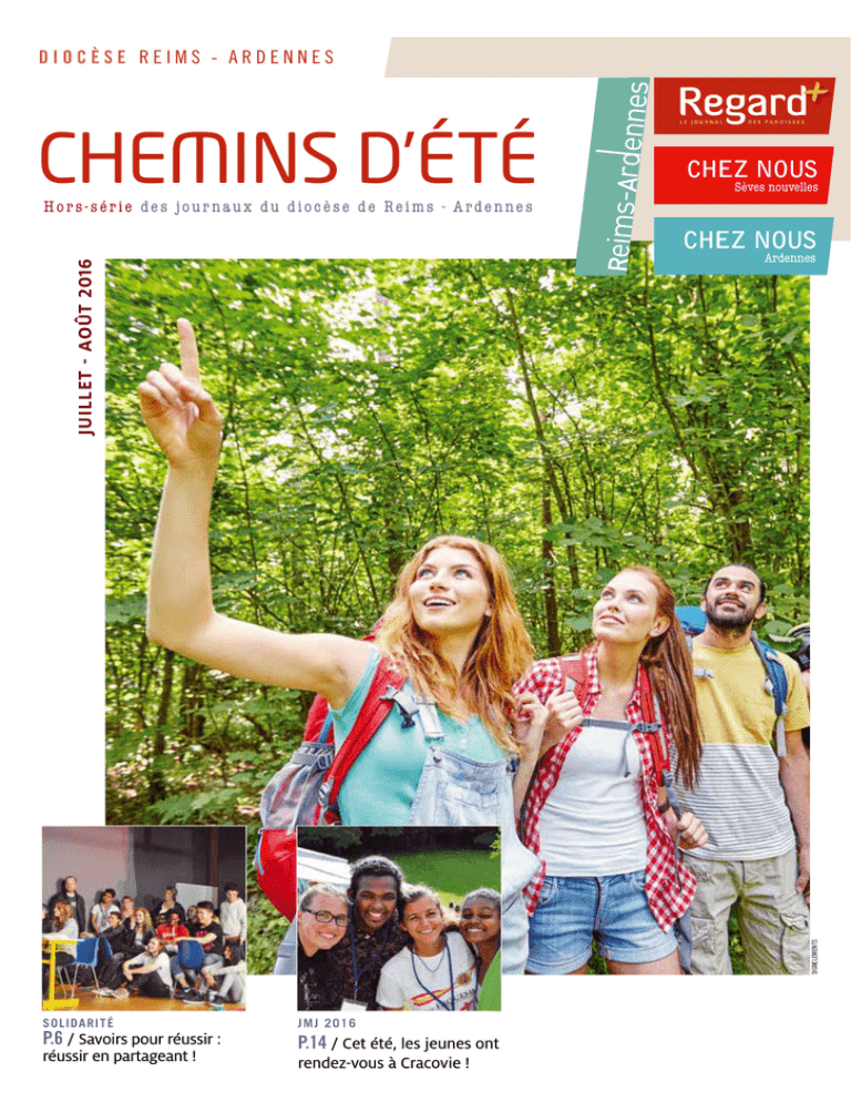 DIOCÈSE REIMS - ARDENNES CHEMINS D’ÉTÉ LE JOURNAL D E S PA R O I S S E S CHEZ NOUS Sèves nouvelles Hors-série des journaux du diocèse de Reims - Ardennes CHEZ NOUS SIGNELEMENTS Juillet - août 2016 Ardennes SOLIDARITÉ P.6 / Savoirs pour réussir : réussir en partageant ! JMJ 2016 P.14 / Cet été, les jeunes ont rendez-vous à Cracovie ! 2 ÉDITORIAL P È R E B R U N O F E I L L E T, ÉVÊQUE AUXILIAIRE DU DIOCÈSE DE REIMS-ARDENNES LA FRATERNITÉ MET DE L’HUILE DANS LES ROUAGES ˢˢRCF S avons-nous que ce n’est qu’en 1848, plus de cinquante ans après la Révolution française, que la «fraternité» a été heureusement introduite dans la devise nationale, aux côtés de la «liberté» et de l’«égalité » ? Sans cela, le système était bloqué. En effet, la liberté la plus absolue ne peut que s’opposer à l’égalité la plus radicale. La fraternité met de l’huile dans les rouages. En particulier, c’est tout le tissu associatif qui réalise cet équilibre dans notre pays. Les religions qui visent le bien commun aussi. Nous le savons tous, la fraternité est un élément majeur de la vie des chrétiens. Parce que Jésus nous invite à prier Dieu comme un Père. Mais également parce que, dans cette même prière – le Notre Père –, nous nous regardons comme des frères. Si nous prenons au sérieux la prière des chrétiens, nous devons prendre au sérieux le regard que nous portons sur les hommes et femmes de notre temps. Certains pensent que l’on pourrait remplacer la fraternité par son effet le plus manifeste : la solidarité. Ce serait regrettable d’oublier la source. Les membres de l’humanité ont quelque chose en commun qui dépasse et transcende sa rationalité. C’est au moment de la gestion des conflits que les valeurs fondamentales entrent en action. Que ferons-nous lorsque le « goût de la solidarité » nous aura quittés ? Qu’est-ce qui nous aidera à le retrouver ? Puissent les chemins que nous parcourrons cet été nous conduire au cœur de l’Évangile, à la source de toute fraternité. VIVEZ L’ÉTÉ EN DIRECT AVEC RCF Du 4 juillet au 28 août, RCF Reims-Ardennes vous propose d’emprunter des chemins d’été avec la visite d’églises accueillantes, les Flâneries musicales et les concerts commentés par Jean-Louis Henry ou le pianiste Jean-Philippe Collard, les musiques variées avec Marie-Françoise Gagne ou Gérard Marie Henry... Les JMJ seront à suivre en direct depuis Cracovie, sans oublier les découvertes touristiques avec Michel Feck, les informations locales à 8h et 18h30, les balades en Ardennes avec Catherine Squevin, le pèlerinage diocésain de Lourdes, les moments de prière et de bible, les parcours de philosophes avec Robert Reverger... Sur RCF, la joie se partage ! Jean-Pierre Benoit LE DIOCÈSE DE REIMS EN QUELQUES CHIFFRES Géographie : le diocèse comprend l’arrondissement de Reims, une partie de celui d’Epernay ainsi que tout le département des Ardennes. Superficie : 6900 Km2 Population : 600 000 habitants Paroisses : le diocèse est divisé en 76 paroisses qui regroupent les 692 communes qui le composent. Archevêque : Monseigneur Thierry Jordan. Evêque auxiliaire : Monseigneur Bruno Feillet. Prêtres : 116 Diacres : 35 Un site diocésain : http://catholique-reims.cef.fr Le site internet du diocèse fait peau neuve. En cours de rénovation, il propose une nouvelle plateforme, un nouveau graphisme et de nouvelles fonctionnalités qui rendront cet outil d’information plus riche et plus attractif. Dès à présent, retrouvez le journal en ligne : http://www.catholique-reims.cef.fr/cheminsete/index.html Données 01/16 Chemins d’été HORS-SÉRIE | 6, rue du Lt-Herduin - 51100 Reims - Tél. : 03 26 82 72 50 Hors série des journaux Chez nous - Ardennes, Chez nous - Sèves nouvelles, Regard+ et Reims-Ardennes. Equipe de coordination : Elisabeth Joubert, Céline Larousse, Yves Malot, Joël Colot, Geneviève Grasset, Bernard Hourlier et Daniel Huvet. Textes et photos, droits réservés. Réalisation : Bayard Service Edition - Nord - Parc d’activité du Moulin, allée Hélène-Boucher, 59874 Wambrechies Cedex [email protected] - Tél.: 03 20 13 36 60 - Fax : 03 20 13 36 89 - Imprimerie : Roto Champagne (Chaumont, 52) LA JOIE SE PARTAGE partout : rcf.fr ˢˢLe coin des lecteurs «FRANÇOIS, LE PAPEgrâce VERT» gratuitement, au soutien des auditeurs Découvrez un livre qui analyse en profondeur le contenu et la portée de l’encyclique Laudate si’ et, de façon plus large, les positions du pape sur la nature et l’écologie. Onze personnalités de tous horizons livrent leurs analyses parmi lesquels Guy Aurenche, ancien président du CCFD-Terre solidaire, Nicolas Hulot, Jean-Marie Pelt ou encore Mgr Marc Stenger, évêque de Troyes, président de Pax Christi – France. Publié par Tempsprésent éditions, 2015. CHEMINS D’ÉTÉ HORS-SÉRIE | Juillet - août 2016 3 AGENDA ˢBienvenue ˢ chez les clarisses de Cormontreuil ˢL’église ˢ d’Ecueil, un joli détour Pour les jeunes de 18 à 35 ans, entre le 8 et le 15 août. Portes ouvertes, les dimanches jusqu’au 18 septembre, de 15h à 18h. Venez vivre un temps en famille franciscaine. D’abord sur place, à Cormontreuil, du 8 au 11 août, pour prier, partager, créer et célébrer sainte Claire… Ensuite, du 11 au 15 août, pour marcher en harmonie avec la création à la manière de saint François : départ de Reims (passage de la porte de la miséricorde à la cathédrale) et arrivée chez les clarisses de Vermand. ˢ«Marche ˢ des réconciliations» Dimanche 10 juillet, à partir de 9h30, à Hautvillers. Cette année, la Mission coteaux, maisons et caves de Champagne a retenu l’idée d’une marche de vignes en villages. Une marche destinée à promouvoir des valeurs de paix et de réconciliation. Au programme de cette première édition : deux boucles de marche de 11 et 21 kilomètres, au départ d’Hautvillers, ponctuées 