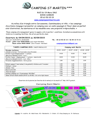 CAMPING ST MARTIN *** RUE DU 19 Mars 1962 81540 SOREZE 05 63 50 20 19 www.campingsaintmartin.com Au milieu d’un triangle entre Carcassonne, Castelnaudary et Albi, « les campings d’occitanie s’engage à presenter un camping avec un cadre paysagé et fleuri dans un parfait etat d’entretien, les sanitaires et les meublés avec une propreté irréprochable. » Those camping site management agree to supply a site in perfect conditions, furnished accomadations with toilets so to washing facilities, the all are perfectly clean. Ouverture du 04/04/2015 au 30/09/2015 Open until 01/04/2015 to 30/09/2015 Acceuil : juillet-Aout 8h00/20h00 –(july-August 8am/8pm) Basse saison 9h00/18h00 - (Out of season : 9am/6pm) TEL : 05 63 50 20 19 / 06 59 10 73 31 [email protected] TARIFS CAMPING 2015-TARIFF/PREISLISTE Camping saint Martin 04/04 – 03/07 04/07 – 21/08 22/08 – 30/09 14.30 19,30 14,30 18.00 23.00 18,00 Personne Supplementaire / Extra person 3,90 5,20 3,90 Enfant jusqu’a 7 ans inclus (-1 an gratuit) /Children until 7 included Visiteur / Visitor Animal / Pets Electricité 10A Taxe de sejour Parking camping-car /2 personnes /40-50m² 2ème voiture haute saison (04/07 au 29/08) / Car extra High Season 2,40 3,20 2,40 2,00 2,00 2,00 1,00 1,50 1,00 3,70 3,70 3,70 Périodes tarifaires Calendar of prices / Tarif periodem /prijs Periodem Forfait 2 pers.Emplacement – 1 voiture Base price (2people/1 pitch – 1 car ) Forfait 2 pers – Emplacement – 1 voiture – electricité Base price (2people/1 pitch – 1 car – Elec) 0,55 0,55 0,55 11,50 12,00 11,50 4,00 4,00 4,00 Ouverture de la piscine (en fonction de la meteo) et du snack le 1er Mai. Wi Fi gratuit. Légende : R = roulotte ; M = Mobil home ; RS = Résidentiel ; C = Chalet ; CC =Stop Camping-car ; B = Barbecue. Taxe de sejour (dayly tax) : 0.55€ ; chiens/chats dans hebergements : 1.50€/jour hors saison (by day out of season) et 2€/jour juillet et aout (July and August) Hors saison : 01/01 -04/07 et du 29/08 au 31/12 : Jour d’arrivée et horaires libres (a fixer au prealable avec la direction) Out of season : Arrivals and departures free. Haute saison : 04/07 au 29/08 : (uniquement pour les locations) : jour d’arrivée le samedi et le mercredi. Horaire d’arrivée : 15h - départ 10h00 On season : Arrivals day on Saturday or wednesday , minimum 7 nights. Hours of arrival : from 4.00 pm for the first day, from 10h00 am from the last day. Inclus : eau, gaz, electricité, acces piscine, animations et Mini- club (11/07 au 23/08), 1 voiture, Wifi gratuit dans tout le camping. Non inclus : les draps, linge de maison, nettoyage final (forfait possible sur demande : chalet 80€, roulotte 50€) ,Taxe de sejour, Caution Materiel 150€. Included : water, gas, electricity, car park for 1, access to the swimming pool, activities & mini-club (11/07 au 23/08), free Wifi. Not included : bed linen, towels….etc final cleanin is a part of duty (cleaning fees on request : chalet 80€, rolling house : 50€), tourist tax, Déposit 150€ for the locations. Prestations para-hôtelières/linen to rent/ diensten in Option/ hotel diesten Draps à usage unique (par lit/sem)/Bed sheets to rent (per bed/per week)/ Bettwasche zu mieten (pro Bett/woche : 7.00€ Pack bebe (chaise haute, lit bebe) par semaine/baby pack (baby chair, baby bed), per week/ baby Pack (kinderbett, babywanne ) pro Woche/ Baby Pack (kinderbad, babybed), per week : 18.00€ CONDITIONS GENERALES DE VENTE POUR LE CAMPING L'emplacement camping est à votre disposition à partir de 12h00 le jour du début de la réservation. Vous devez le libérer à 12h00 au plus tard le dernier jour de la réservation. L'acompte à verser est de 25% du montant du séjour. L'acompte est déductible au paiement du séjour réservé. Une réservation en ligne ne devient effective qu’après encaissement de votre acompte. Au cas où nous ne pourrions pas satisfaire votre demande, nous n'encaisserions pas cet acompte. Vous recevrez une confirmation de votre achat en ligne par courrier électronique. Courrier que vous devrez compléter et signer avant de nous le renvoyer. Il appartient au client de s'assurer. La direction décline toutes responsabilités en cas de vol, incendies, intempéries etc. Toute location est nominative et ne peut être cédée, sauf accord de la direction. Tout campeur est tenu de se conformer aux dispositions du règlement intérieur du camping En l’absence de message du client précisant qu’il a dû différer la date de son arrivée, l’emplacement devient disponible 24 heures après la date d’arrivée mentionnée sur le contrat de location et le règlement intégral des prestations demeure exigé. - Annulation : Les annulations en cas d’un empêchement majeur : maladie, décès, accident, licenciement…, doivent parvenir 45 jours avant la date d’arrivée, votre acompte vous sera remboursé(déduction de frais de dossier de 16 €) . Pour les annulations à plus de 15 jours avant la date d’arrivée, l’acompte sera retenu pour une indemnité de rupture de contrat. Pour les annulations à moins de 16 jours avant la date d’arrivée, une indemnité de rupture de contrat restera dûe, correspondant à l’intégralité du séjour. - ASSURANCE ANNULATION: 8.50 € pour une réservation. Cette assurance facultative mais conseillée, vous permet d’être remboursé de l’acompte et de ne pas être redevable de l’indemnité de rupture de contrat quelque soit la date de l’annulation. Les shorts de bain sont interdits à la piscine. Aucune réduction ne sera consentie dans le cas d'arrivée retardée ou départ anticipé.