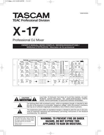» X-17 Professional DJ Mixer PUSH OWNER’S MANUAL/ MODE D’EMPLOI / BEDIENUNGSANLEITUNG / MANUALE D'ISTRUZIONI / Mezclador de DJ profesional D00676200A Important Safety Precautions English IMPORTANT (for U.K. Customers) DO NOT cut off the mains plug from this equipment. If the plug fitted is not suitable for the power points in your home or the cable is too short to reach a power point, then obtain an appropriate safety approved extension lead or consult your dealer. If nonetheless the mains plug is cut off, remove the fuse and dispose of the plug immediately, to avoid a possible shock hazard by inadvertent connection to the mains supply. If this product is not provided with a mains plug, or one has to be fitted, then follow the instructions given below: IMPORTANT. DO NOT make any connection to the larger terminal which is marked with the letter E or by the safety earth symbol ç or coloured GREEN or GREEN-and-YELLOW. The wires in the mains lead on this product are coloured in accordance with the following code: BLUE BROWN : NEUTRAL : LIVE For U.S.A TO THE USER Block diagram / Schéma synoptique / Blockschaltbild / Schema a blocchi / Diagrama de bloques Block diagram / Schéma synoptique / Blockschaltbild / Schema a blocchi / Diagrama de bloques This equipment has been tested and found to comply with the limits for a Class A digital device, pursuant to Part 15 of the FCC Rules. These limits are designed to provide reasonable protection against harmful interference when the equipment is operated in a commercial environment. This equipment generates, uses, and can radiate radio frequency energy and, if not installed and used in accordance with the instruction manual, may cause harmful interference to radio communications. Operation of this equipment in a residental area is likely to cause harmful interference in which case the user will be required to correct the interference at his own expense. CAUTION Changes or modifications to this equipment not expressly approved by TEAC CORPORATION for compliance could void the user's authority to operate this equipment. As these colours may not correspond with the coloured markings identifying the terminals in your plug proceed as follows: The wire which is coloured BLUE must be connected to the terminal which is marked with the letter N or coloured BLACK. The wire which is coloured BROWN must be connected to the terminal which is marked with the letter L or coloured RED. For the consumers in Europe WARNING This is a Class A product. In a domestic environment, this product may cause radio interference in which case the user may be required to take adequate measures. Pour les utilisateurs en Europe When replacing the fuse only a correctly rated approved type should be used and be sure to re-fit the fuse cover. IF IN DOUBT ELECTRICIAN. — CONSULT A COMPETENT AVERTISSEMENT Il s’agit d’un produit de Classe A. Dans un environnement domestique, cet appareil peut provoquer des interférences radio, dans ce cas l’utilisateur peut être amené à prendre des mesures appropriées. Für Kunden in Europa Warnung Dies is eine Einrichtung, welche die Funk-Entstörung nach Klasse A besitzt. Diese Einrichtung kann im Wohnbereich Funkstörungen versursachen ; in diesem Fall kann vom Betrieber verlang werden, angemessene Maßnahmen durchzuführen und dafür aufzukommen. 2 TASCAM X-17 TASCAM X-17 51 Sheet 2 of 26 IMPORTANT SAFETY INSTRUCTIONS 1) Read these instructions. 2) Keep these instructions. 3) Heed all warnings. 4) Follow all instructions. 5) Do not use this apparatus near water. 6) Clean only with dry cloth. English • Do not expose this apparatus to drips or splashes. • Do not place any objects filled with liquids, such as vases, on the apparatus. • Do not install this apparatus in a confined space such as a book case or similar unit. • The apparatus draws nominal non-operating power from the AC outlet with its POWER switch in the off position. 7) Do not block any ventilation openings. Install in accordance with the manufacturer's instructions. 8) Do not install near any heat sources such as radiators, heat registers, stoves, or other apparatus (including amplifiers) that produce heat. 9) Do not defeat the safety purpose of the polarized or grounding-type plug. A polarized plug has two blades with one wider than the other. A grounding type plug has two blades and a third grounding prong. The wide blade or the third prong are provided for your safety. If the provided plug does not fit into your outlet, consult an electrician for replacement of the obsolete outlet. 10)Protect the power cord from being walked on or pinched particularly at plugs, convenience receptacles, and the point where they exit from the apparatus. 11)Only use attachments/accessories specified by the manufacturer. 12)Use only with the cart, stand, tripod, bracket, or table specified by the manufacturer, or sold with the apparatus. When a cart is used, use caution when moving the cart/apparatus combination to avoid injury from tip-over. 13) Unplug this apparatus during lightning storms or when unused for long periods of time. 14) Refer all servicing to qualified service personnel. Servicing is required when the apparatus has been damaged in any way, such as power-supply cord or plug is damaged, liquid has been spilled or objects have fallen into the apparatus, the apparatus has been exposed to rain or moisture, does not operate normally, or has been dropped. TASCAM X-17 3 Introduction English Table of contents Introduction ................................................................... 4 Some notes and precautions .................................... 4 Serial number, etc.................................................... 4 Rack-mounting the unit........................................... 4 Features and controls ..................................................... 5 Top panel................................................................. 6 How to replace the fader ....