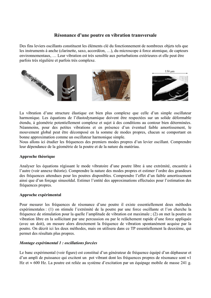 Résonance d’une poutre en vibration transversale Des fins leviers oscillants constituent les éléments clé du fonctionnement de nombreux objets tels que les instruments à anche (clarinette, saxo, accordéon, …), du microscope à force atomique, de capteurs environnementaux, … Leur vibration est très sensible aux perturbations extérieures et elle peut être parfois très régulière et parfois très complexe. La vibration d’une structure élastique est bien plus complexe que celle d’un simple oscillateur harmonique. Les équations de l’élastodynamique doivent être respectées sur un solide déformable étendu, à géométrie potentiellement complexe et sujet à des conditions au contour bien déterminées. Néanmoins, pour des petites vibrations et en présence d’un éventuel faible amortissement, le mouvement global peut être décomposé en la somme de modes propres, chacun se comportant en bonne approximation comme un oscillateur harmonique simple. Nous allons ici étudier les fréquences des premiers modes propres d’un levier oscillant. Comprendre leur dépendance de la géométrie de la poutre et de la nature du matériau. Approche théorique Analyser les équations régissant le mode vibratoire d’une poutre libre à une extrémité, encastrée à l’autre (voir annexe théorie). Comprendre la nature des modes propres et estimer l’ordre des grandeurs des fréquences attendues pour les poutres disponibles. Comprendre l’effet d’un faible amortissement ainsi que d’un forçage sinusoïdal. Estimer l’entité des approximations effectuées pour l’estimation des fréquences propres. Approche expérimental Pour mesurer les fréquences de résonance d’une poutre il existe essentiellement deux méthodes expérimentales : (1) on stimule l’extrémité de la poutre par une force oscillante et l’on cherche la fréquence de stimulation pour la quelle l’amplitude de vibration est maximale ; (2) on met la poutre en vibration libre en la sollicitant par une percussion ou par le relâchement rapide d’une force appliquée (avec un doit), on mesure alors directement la fréquence de vibration spontanément acquise par la poutre. On décrit ici les deux méthodes, mais on utilisera dans ce TP essentiellement la deuxième, qui permet des résultats plus propres. Montage expérimental 1 : oscillations forcées Le banc expérimental (voir figure) est constitué d’un générateur de fréquence équipé d’un déphaseur et d’un ampli de puissance qui excitent un pot vibrant dont les fréquences propres de résonance sont 1 Hz et 600 Hz. La poutre est reliée au système d’excitation par un équipage mobile de masse 241 g. La mesure de l’amplitude s’effectue à l’aide d’un accéléromètre (l’accélération étant proportionnelle à l’amplitude), dont on compare le signal de sortie avec le signal du générateur sur un oscilloscope. Il n’est pas utile (et même dangereux pour le matériel) d’imposer (via l’amplificateur) un courant trop élevé dans la bobine du pot vibrant, seule la visualisation de l’amplitude de vibration de la poutre étant nécessaire. Un réglage d’un quart de tour sur le bouton de gain de l’amplificateur suffit à détecter les résonances des différentes poutres. Amplificateur de charge Accéléromètr Oscilloscope Générateur de fréquence Pot vibrant Amplificateur de puissance Montage expérimental 2 : oscillations libres Les poutres sont simplement encastrées sur une base stable de grande masse (à l’aide de la fixation à vis si la poutre est percée, ou simplement en entreposant la poutre entre deux parties plates de la base et en resserrant les vis si la poutre est plate). On mettra la poutre en vibration en la percutant sèchement avec un objet raide (clé Allen.. ?) ou alors en appuyant fortement avec un doit et en relâchant brusquement. Vous êtres libres d’améliorer la technique de stimulation pour produire un meilleur son de vibration ! Ceci parce que la mesure de l’oscillation de la poutre se fera justement par enregistrement à l’aide d’un microphone des ondes sonores produites dans l’aire par la vibration de la poutre. Le signal sonore sera enregistré à l’aide de la carte son de l’ordinateur et d’un logiciel d’enregistrement et d’analyse des signaux. Détermination expérimentale des fréquences de résonance Etude préliminaire sur un réglet métallique Un réglet métallique encastré entre les deux parties du mors constitue un prototype très simple pour étudier les fréquences de résonnance des modes propres d’une poutre élancée en fonction de la longueur de la poutre. Il suffit pour cela de faire avancer progressivement le réglet entre les mors. La forme aplatie du réglet et la nature peut dissipative du métal permettent à la fois des oscillations durables de forte amplitude et la production efficace d’ondes sonores (même si peu audibles, les intenses variations de pression sont bien enregistrés par un microphone ordinaire). Avant de commencer la manipulation, estimer le module d’Young du métal en question à l’aide d’une mesure de flexion statique. Après avoir optimisé les conditions de stimulation et d’enregistrement sur une longueur de poutre d’environ 10 cm, procéder à un enregistrement systématique pour une dizaine de longueurs différentes. En utilisant les outils d’analyse de Fourier inclus dans le logiciel fourni, identifier dans les spectres de puissance les fréquences des premiers modes propres de la poutre. Vérifier l’accord avec la théorie en appendice : êtes-vous en mesure d’identifier tous les pics observés ? Déterminer pour chaque longueur autant de fréquences propres que possible et vérifier si leur dépendance de la longueur de la poutre est en accord avec les lois théoriques. Influence de la géométrie et du matériau En utilisant les sets de poutres an Dural et PMMA mises à votre disposition (po