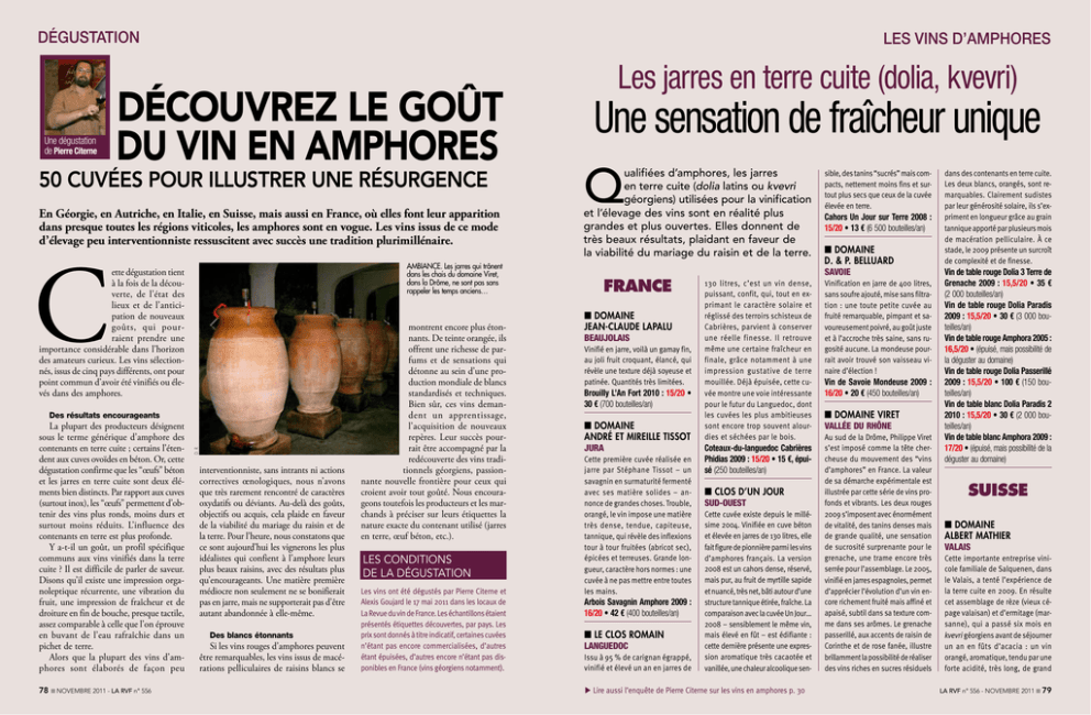 DÉGUSTATION Une dégustation de Pierre Citerne les vins d’AMPHORES DÉCOUVREZ LE GOÛT DU VIN EN AMPHORES 50 cuvées pour illustrer une résurgence En Géorgie, en Autriche, en Italie, en Suisse, mais aussi en France, où elles font leur apparition dans presque toutes les régions viticoles, les amphores sont en vogue. Les vins issus de ce mode d’élevage peu interventionniste ressuscitent avec succès une tradition plurimillénaire. C AMBIANCE. Les jarres qui trônent dans les chais du domaine Viret, dans la Drôme, ne sont pas sans rappeler les temps anciens… ette dégustation tient à la fois de la découverte, de l’état des lieux et de l’anticipation de nouveaux goûts, qui pourraient prendre une importance considérable dans l’horizon des amateurs curieux. Les vins sélectionnés, issus de cinq pays différents, ont pour point commun d’avoir été vinifiés ou élevés dans des amphores. La plupart des producteurs désignent sous le terme générique d’amphore des contenants en terre cuite ; certains l’étendent aux cuves ovoïdes en béton. Or, cette dégustation confirme que les “œufs” béton et les jarres en terre cuite sont deux éléments bien distincts. Par rapport aux cuves (surtout inox), les “œufs” permettent d’obtenir des vins plus ronds, moins durs et surtout moins réduits. L’influence des contenants en terre est plus profonde. Y a-t-il un goût, un profil spécifique communs aux vins vinifiés dans la terre cuite ? Il est difficile de parler de saveur. Disons qu’il existe une impression organoleptique récurrente, une vibration du fruit, une impression de fraîcheur et de droiture en fin de bouche, presque tactile, assez comparable à celle que l’on éprouve en buvant de l’eau rafraîchie dans un pichet de terre. Alors que la plupart des vins d’amphores sont élaborés de façon peu 78 ■ NOVEMBRE 2011 - LA RVF n° 556 D. R. Des résultats encourageants interventionniste, sans intrants ni actions correctives œnologiques, nous n’avons que très rarement rencontré de caractères oxydatifs ou déviants. Au-delà des goûts, objectifs ou acquis, cela plaide en faveur de la viabilité du mariage du raisin et de la terre. Pour l’heure, nous constatons que ce sont aujourd’hui les vignerons les plus idéalistes qui confient à l’amphore leurs plus beaux raisins, avec des résultats plus qu’encourageants. Une matière première médiocre non seulement ne se bonifierait pas en jarre, mais ne supporterait pas d’être autant abandonnée à elle-même. Des blancs étonnants Si les vins rouges d’amphores peuvent être remarquables, les vins issus de macérations pelliculaires de raisins blancs se montrent encore plus étonnants. De teinte orangée, ils offrent une richesse de parfums et de sensations qui détonne au sein d’une production mondiale de blancs standardisés et techniques. Bien sûr, ces vins demandent un apprentissage, l’acquisition de nouveaux repères. Leur succès pourrait être accompagné par la redécouverte des vins traditionnels géorgiens, passionnante nouvelle frontière pour ceux qui croient avoir tout goûté. Nous encourageons toutefois les producteurs et les marchands à préciser sur leurs étiquettes la nature exacte du contenant utilisé (jarres en terre, œuf béton, etc.). LES CONDITIONS DE la DÉGUSTATION Les vins ont été dégustés par Pierre Citerne et Alexis Goujard le 17 mai 2011 dans les locaux de La Revue du vin de France. Les échantillons étaient présentés étiquettes découvertes, par pays. Les prix sont donnés à titre indicatif, certaines cuvées n’étant pas encore commercialisées, d’autres étant épuisées, d’autres encore n’étant pas disponibles en France (vins géorgiens notamment). Les jarres en terre cuite (dolia, kvevri) Une sensation de fraîcheur unique Q ualifiées d’amphores, les jarres en terre cuite (dolia latins ou kvevri géorgiens) utilisées pour la vinification et l’élevage des vins sont en réalité plus grandes et plus ouvertes. Elles donnent de très beaux résultats, plaidant en faveur de la viabilité du mariage du raisin et de la terre. FRANCE ■■Domaine Jean-Claude Lapalu Beaujolais Vinifié en jarre, voilà un gamay fin, au joli fruit croquant, élancé, qui révèle une texture déjà soyeuse et patinée. Quantités très limitées. Brouilly L’An Fort 2010 : 15/20 • 30 € (700 bouteilles/an) ■■Domaine André et Mireille Tissot Jura Cette première cuvée réalisée en jarre par Stéphane Tissot – un savagnin en surmaturité fermenté avec ses matière solides – annonce de grandes choses. Trouble, orangé, le vin impose une matière très dense, tendue, capiteuse, tannique, qui révèle des inflexions tour à tour fruitées (abricot sec), épicées et terreuses. Grande longueur, caractère hors normes : une cuvée à ne pas mettre entre toutes les mains. Arbois Savagnin Amphore 2009 : 16/20 • 42 € (400 bouteilles/an) ■■Le Clos Romain Languedoc Issu à 95 % de carignan égrappé, vinifié et élevé un an en jarres de 130 litres, c’est un vin dense, puissant, confit, qui, tout en exprimant le caractère solaire et réglissé des terroirs schisteux de Cabrières, parvient à conserver une réelle finesse. Il retrouve même une certaine fraîcheur en finale, grâce notamment à une impression gustative de terre mouillée. Déjà épuisée, cette cuvée montre une voie intéressante pour le futur du Languedoc, dont les cuvées les plus ambitieuses sont encore trop souvent alourdies et séchées par le bois. Coteaux-du-languedoc Cabrières Phidias 2009 : 15/20 • 15 €, épuisé (250 bouteilles/an) ■■Clos d’un Jour Sud-Ouest Cette cuvée existe depuis le millésime 2004. Vinifiée en cuve béton et élevée en jarres de 130 litres, elle fait figure de pionnière parmi les vins d’amphores français. La version 2008 est un cahors dense, réservé, mais pur, au fruit de myrtille sapide et nuancé, très 