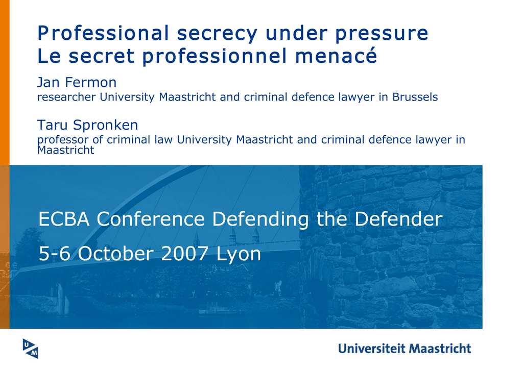 P rofessional secrecy under pressure Le secret professionnel menacé Jan Fermon researcher University Maastricht and criminal defence lawyer in Brussels Taru Spronken professor of criminal law University Maastricht and criminal defence lawyer in Maastricht ECBA Conference Defending the Defender 56 October 2007 Lyon I ntroduction • Academic perspective? • Perspective académique ? • Three major threats to professional secrecy • Trois menaces qui pèsent sur le secret professionnel • Preliminary ruling Court of Justice on the money laundring Directive • Arrêt de la Cour de Justice de l’Union européenne concernant blanchiment • Comparative research on • Recherche comparative sur the protection of la protection du secret professional privilege within professionnel au sein de the EU l’UE Attorneyclient privilege: three threats Secret professionnel: trois menaces • Development of • Développement des investigative methods méthodes d’enquête • Crime Control is in! Safeguards are out! • Weak position of the bars • La lutte contre la criminalité gagne du terrain, les droits fondamentaux reculent • Position faible des barreaux M ethods of investigation: examples from the Netherlands • Special Investigative Methods Act 1 February 2000: no exception for lawyers • Loi sur les méthodes particulières de recherche 1 février 2000: pas d’exception pour les avocats. • Telephonetapping – ECtHR 25.11.2004 Aalmoes e.a. v. Netherlands nr. 16269/02 • Ecoutes téléphoniques: – CEDH 25.11.2004 Aalmoes E.A c/ Pays Bas 16269/02 Emphasis on crime control • Exceptions on • Exceptions sur la confidentiality because of confidentialité en fonction the severeness of the crime de la gravité du délit • The lawyer as an • L’avocat comme une source interesting source of d’information: information: – Lawyers as (co) suspects – Avocats comme (co) suspects – Lawyers as witnesses – Avocats comme témoins against their clients contre leurs clients – Lawyers as assistant prosecutors (money laundring) – Avocats comme auxiliaires du Ministère Public (blanchiment W hat is the position of the Bar? • Position of the local dean during searches of lawyers offices • Intervention du bâtonnier pendant des perquisitions dans cabinet d’avocat • What about the other • Quid des autres méthodes de investigative methods? recherche? • Absence of regulations • Absence de règles Court of J ustice EC 26 J une 2007 nr. C305/ 05 • Judgment of the Court in case C 305/ 05 – REFERENCE for a preliminary ruling from the Cour d’arbitrage (now the Cour constitutionnelle) (Belgium) • l’arrêt C305/ 05 du 26 juin 2007 de la Cour de J ustice de l’Union Européenne – Question préjudicielle posée par Cour Constitutionnelle Belge. Court of J ustice EC 26 J une 2007 nr. C305/ 05 • Case before the Constitutional Court: – Action brought by several Belgian Bars – seeking the annulment of certain Articles of the Law which transposes into the national legal system Directive 2001/97 relating to the prevention of the use of the financial system for the purpose of money laundering. • Litige devant la Cour Constitutionnelle: – Demande formulée par barreaux belges – Annulation de la loi transposant directive 2001/97/CE du 4 décembre 2001 relative à la prévention de l'utilisation du système financier aux fins du blanchiment de capitaux Court of J ustice EC 26 J une 2007 nr. C305/ 05 • Directive: • Directive: • • • • • • • • • Member States shall ensure that the obligations laid down in this Directive are imposed on members of independent legal professionals, when they participate, whether: (a) by assisting in the planning or execution of transactions for their client concerning the (i) buying and selling of real property or business entities; (ii) managing of client money, securities or other assets; (iii) opening or management of bank, savings or securities accounts; (iv) organisation of contributions necessary for the creation, operation or management of companies; (v) creation, operation or management of trusts, companies or similar structures; (b) or by acting on behalf of and for their client in any financial or real estate transaction; • • • • • • • Impose obligation de signaler transaction suspectes aux membres de professions juridiques indépendantes, lorsqu’ils participent, a) en assistant leur client dans la préparation ou la réalisation de transactions concernant: i) l’achat et la vente de biens immeubles ou d’entreprises commerciales; ii) la gestion de fonds, de titres ou d’autres actifs, appartenant au client; iii) l’ouverture ou la gestion de comptes bancaires ou d’épargne ou de portefeuilles; iv) l’organisation des apports nécessaires à la constitution, à la gestion ou à la direction de sociétés; v) la constitution, la gestion ou la direction de fiducies, de sociétés ou de structures similaires; b) ou en agissant au nom de leur client et pour le compte de celuici dans toute transaction financière ou immobilière». Court of J ustice EC 26 J une 2007 nr. C305/ 05 • Question referred to the Court for a preliminary ruling: – ‘Does Directive 2001/97 … infringe the right to a fair trial which is guaranteed by Article 6 of the ECHR and, as a consequence, Article 6(2) EU • Question préjudicielle: – Compatibilité de la directive avec « droit à un procès équitable tel qu’il est garanti par l’article 6 de la Convention de sauvegarde des droits de l’homme et des libertés fondamentales, et par conséquent l’article 6, paragraphe 2, du Traité sur l’Union européenne » Court of J ustice EC 26 J une 2007 nr. C305/ 05 • Judgment of the Court: • Arrêt de la Cour: • No violation because • Pas de violation car reservations in the dans la Directive Directive for all réserve pour toute activities of lawyers activité liée à un relating to proceedi