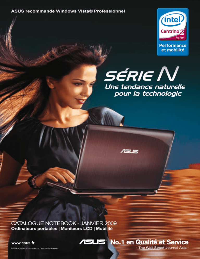 ASUS recommande Windows Vista® Professionnel Une tendance naturelle pour la technologie CATALOGUE NOTEBOOK - JANVIER 2009 Ordinateurs portables | Moniteurs LCD | Mobilité www.asus.fr A propos d’ASUS : Créé en 1989, ASUS est un acteur majeur sur les marchés de l’informatique, des appareils de télécommunications et d’électronique grand public. Le constructeur compte parmi ses produits des ordinateurs portables, des cartes mères, des cartes graphiques, des lecteurs optiques, des PDA et agendas électroniques, des ordinateurs de bureau, des serveurs, des solutions sans fil, des téléphones mobiles et des produits de connectique réseau. Leader historique sur le marché des cartes mères et celui des cartes graphiques, la société figure en outre parmi les quatre premiers constructeurs d’ordinateurs portables. Grâce à ses 8000 collaborateurs et à une équipe de designers de niveau international, ASUS a réalisé un chiffre d’affaires de 6,9 milliards de dollars américains. La renommée d’ASUS repose également sur les 4 points suivants : La qualité ASUS La doctrine “ASUS Way of Total Quality Management” vise à offrir la meilleure qualité possible. Les ordinateurs portables ASUS sont soumis aux tests les plus durs afin de vérifier que chacun d’entre eux soit parfait. Une série de tests rigoureux dont les standards ont été volontairement élevés par rapport à ceux des concurrents pour s’assurer que les portables ASUS sont construits pour offrir d’excellentes performances et une stabilité durable. Un portefeuille complet ASUS offre plusieurs séries d’ordinateurs portables intégrant les technologies les plus avancées. Des minuscules ordinateurs ultra-portables 12 pouces aux confortables modèles à écran 17 pouces en passant par les moniteurs LCD et téléphones portables, ASUS dispose d’un éventail complet capable de répondre à divers besoins de mobilité, de loisirs ou professionnels. Garantie internationale de 2 ans La gamme complète des ordinateurs portables ASUS est couverte par une garantie internationale de deux ans (Cette garantie concerne uniquement le circuit de distribution de revendeurs spécialisés). Contrairement aux autres constructeurs d’ordinateurs portables proposant plusieurs années de garantie, mais facturant les composants et le coût de réparation au delà de la première année, la garantie internationale de deux ans d’ASUS comprend la gratuité de la réparation ou de l’échange de composant. Des concepts de design incomparables Le style ASUS c’est la simplicité et le confort quotidien. Les ordinateurs portables ASUS ont une apparence nette et stylisée les rendant parfaits dans toutes les situations . Parmi les caractéristiques uniques on compte : Touchpad - le touchpad sans rebords permet d’éviter les accumulations de poussière sur le repose paumes. Touches semi visibles - les touches de fonction sont situées sur le côté du portable pour un environnement de travail dépourvu de nuisances. Surface brossée - la surface des ordinateurs portables adopte une fintion brossée pour une apparence élégante et robuste. Matériaux innovants - du léger et solide alliage aluminium-magnésium à la fibre de carbone en passant par le cuir véritable, les portables, moniteurs et téléphones mobiles ASUS continuent à innover et à vous offrir l’émotion d’un design hors-norme. Garantie 2 ans* avec enlèvement et retour atelier.** Tous les portables Asus sont livrés avec sacoche de transport et souris.*** * garantie internationale. (Retrouvez nos sites de réparation sur : http://support.asus.com/ ** enlèvement uniquement en France métropolitaine. *** uniquement dans le circuit de distribution des revendeurs spécialisés. ASUS - 2 www.asus.fr ORDINATEURS PORTABLES. . . . . . . . . . . . . . . . . . . . . . . . . . . . . . . . . . . . . . P4 EeePC. . . . . . . . . . . . . . . . . . . . . . . . . . . . . . . . . . . . . . . . . . . . . . . . . . . . . . . . . . . . . . . . . . . P 5 > S101 > 1000H Ultra portable. . . . . . . . . . . . . . . . . . . . . . . . . . . . . . . . . . . . . . . . . . . . . . . . . . . . . . . . . . . . P 6 > N10J > N20A > U6V Bambou > F6V Professionnel. . . . . . . . . . . . . . . . . . . . . . . . . . . . . . . . . . . . . . . . . . . . . . . . . . . . . . . . . . . . . . P 8 > F80Q > M51A > X71SL > X71Q Multimédia. . . . . . . . . . . . . . . . . . . . . . . . . . . . . . . . . . . . . . . . . . . . . . . . . . . . . . . . . . . . . . . P 10 > N80VN > N50VC > M50VN > M70VN Gaming. . . . . . . . . . . . . . . . . . . . . . . . . . . . . . . . . . . . . . . . . . . . . . . . . . . . . . . . . . . . . . . . . . P 12 > G50V > G70SG MOBILITÉ. . . . . . . . . . . . . . . . . . . . . . . . . . . . . . . . . . . . . . . . . . . . . . . . . . . . . . . . . . . . . P 13 PDA / Phones / GPS > P320 > P750 > A696 > M930 > P552W ÉCRANS LCD. . . . . . . . . . . . . . . . . . . . . . . . . . . . . . . . . . . . . . . . . . . . . . . . . . . . . . . . P 14 > VW246H & VW266H > VK246H & VK266H > Série VH EeePC S101 ASUS - 3 ACCÈS INSTANTANÉ À INTERNET ET AU CONTENU MULTIMÉDIA DE VOTRE ORDINATEUR Allumez votre ordinateur et accédez à Internet et vos applications multimédias en moins de 10 secondes* grâce à la fonctionnalité ASUS Express Gate présente sur les ordinateurs portables ASUS, équipés de la technologie processeur Intel® Centrino® 2. Vos sites Internet préférés, musiques, photos, msn et skype sont accessibles rapidement, facilement, d’un simple clic sur le bouton de démarrage Express Gate. Pourquoi attendre alors que les loisirs numériques sont à portée de main ? A présent, votre musique, vos photos, MSN, Skype et vos sites Internet favoris (messagerie électronique, etc.) sont accessibles en moins de 10 secondes ! La fonctionnalité ASUS Express Gate présente sur les ordinateurs portables ASUS vous permet d’accéder en un clin d’œil à vos applicat