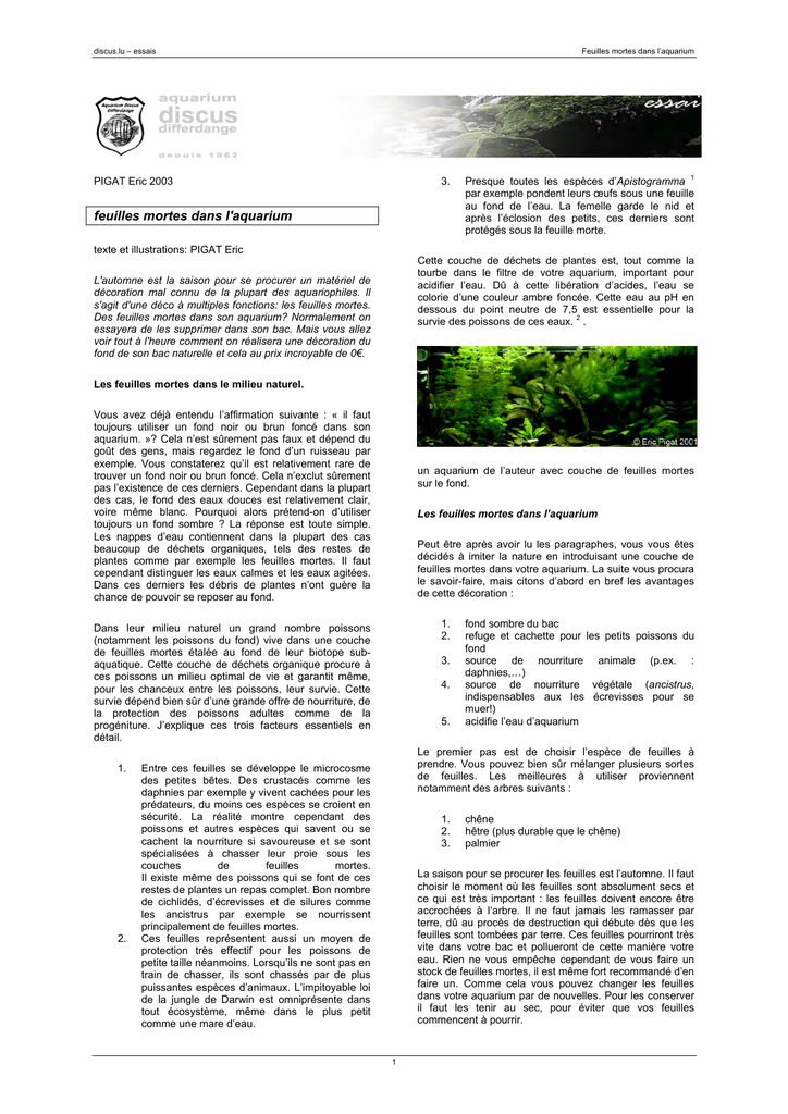 discus.lu – essais Feuilles mortes dans l’aquarium PIGAT Eric 2003 3. feuilles mortes dans l'aquarium 1 Presque toutes les espèces d’Apistogramma par exemple pondent leurs œufs sous une feuille au fond de l’eau. La femelle garde le nid et après l’éclosion des petits, ces derniers sont protégés sous la feuille morte. texte et illustrations: PIGAT Eric Cette couche de déchets de plantes est, tout comme la tourbe dans le filtre de votre aquarium, important pour acidifier l’eau. Dû à cette libération d’acides, l’eau se colorie d’une couleur ambre foncée. Cette eau au pH en dessous du point neutre de 7,5 est essentielle pour la 2 survie des poissons de ces eaux. . L'automne est la saison pour se procurer un matériel de décoration mal connu de la plupart des aquariophiles. Il s'agit d'une déco à multiples fonctions: les feuilles mortes. Des feuilles mortes dans son aquarium? Normalement on essayera de les supprimer dans son bac. Mais vous allez voir tout à l'heure comment on réalisera une décoration du fond de son bac naturelle et cela au prix incroyable de 0€. Les feuilles mortes dans le milieu naturel. Vous avez déjà entendu l’affirmation suivante : « il faut toujours utiliser un fond noir ou brun foncé dans son aquarium. »? Cela n’est sûrement pas faux et dépend du goût des gens, mais regardez le fond d’un ruisseau par exemple. Vous constaterez qu’il est relativement rare de trouver un fond noir ou brun foncé. Cela n’exclut sûrement pas l’existence de ces derniers. Cependant dans la plupart des cas, le fond des eaux douces est relativement clair, voire même blanc. Pourquoi alors prétend-on d’utiliser toujours un fond sombre ? La réponse est toute simple. Les nappes d’eau contiennent dans la plupart des cas beaucoup de déchets organiques, tels des restes de plantes comme par exemple les feuilles mortes. Il faut cependant distinguer les eaux calmes et les eaux agitées. Dans ces derniers les débris de plantes n’ont guère la chance de pouvoir se reposer au fond. un aquarium de l’auteur avec couche de feuilles mortes sur le fond. Les feuilles mortes dans l’aquarium Peut être après avoir lu les paragraphes, vous vous êtes décidés à imiter la nature en introduisant une couche de feuilles mortes dans votre aquarium. La suite vous procura le savoir-faire, mais citons d’abord en bref les avantages de cette décoration : 1. 2. Dans leur milieu naturel un grand nombre poissons (notamment les poissons du fond) vive dans une couche de feuilles mortes étalée au fond de leur biotope subaquatique. Cette couche de déchets organique procure à ces poissons un milieu optimal de vie et garantit même, pour les chanceux entre les poissons, leur survie. Cette survie dépend bien sûr d’une grande offre de nourriture, de la protection des poissons adultes comme de la progéniture. J’explique ces trois facteurs essentiels en détail. 1. 2. 3. 4. 5. fond sombre du bac refuge et cachette pour les petits poissons du fond source de nourriture animale (p.ex. : daphnies,…) source de nourriture végétale (ancistrus, indispensables aux les écrevisses pour se muer!) acidifie l’eau d’aquarium Le premier pas est de choisir l’espèce de feuilles à prendre. Vous pouvez bien sûr mélanger plusieurs sortes de feuilles. Les meilleures à utiliser proviennent notamment des arbres suivants : Entre ces feuilles se développe le microcosme des petites bêtes. Des crustacés comme les daphnies par exemple y vivent cachées pour les prédateurs, du moins ces espèces se croient en sécurité. La réalité montre cependant des poissons et autres espèces qui savent ou se cachent la nourriture si savoureuse et se sont spécialisées à chasser leur proie sous les couches de feuilles mortes. Il existe même des poissons qui se font de ces restes de plantes un repas complet. Bon nombre de cichlidés, d’écrevisses et de silures comme les ancistrus par exemple se nourrissent principalement de feuilles mortes. Ces feuilles représentent aussi un moyen de protection très effectif pour les poissons de petite taille néanmoins. Lorsqu’ils ne sont pas en train de chasser, ils sont chassés par de plus puissantes espèces d’animaux. L’impitoyable loi de la jungle de Darwin est omniprésente dans tout écosystème, même dans le plus petit comme une mare d’eau. 1. 2. 3. chêne hêtre (plus durable que le chêne) palmier La saison pour se procurer les feuilles est l’automne. Il faut choisir le moment où les feuilles sont absolument secs et ce qui est très important : les feuilles doivent encore être accrochées à l‘arbre. Il ne faut jamais les ramasser par terre, dû au procès de destruction qui débute dès que les feuilles sont tombées par terre. Ces feuilles pourriront très vite dans votre bac et pollueront de cette manière votre eau. Rien ne vous empêche cependant de vous faire un stock de feuilles mortes, il est même fort recommandé d’en faire un. Comme cela vous pouvez changer les feuilles dans votre aquarium par de nouvelles. Pour les conserver il faut les tenir au sec, pour éviter que vos feuilles commencent à pourrir. 1 discus.lu – essais Feuilles mortes dans l’aquarium bac, les feuilles ne se gardent pas aussi longtemps (un mois ou un peu plus), mais une nouvelle source d’alimentation pour les occupants de votre aquarium n’est pas un désavantage. Que pensez-vous ? Maintenant que vous avez vos feuilles mortes, il faut les faire bouillir à l’eau. Cela a deux raisons : d’une part tous les bactéries et champignons sont tués à 100 %, d’autre part les feuilles se gonflent d’eau et ne flottent pas dans l’aquarium comme le feraient des feuilles secs. 1. 2. petit cichlidé provenant d’Amérique du sud 3. silures qui mangent en grattant leur nourriture à l’aide d’une bouche aplatie. le pH de l’eau dans ces biotopes tropicaux peut descendre jusqu’à 4 ! Aquarium Discus Differdange 1962