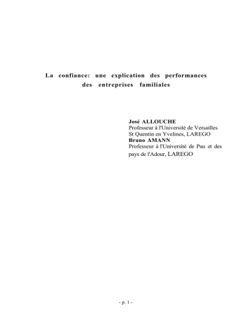 La confiance: une explication des performances des entreprises familiales José ALLOUCHE Professeur à l'Université de Versailles St Quentin en Yvelines, LAREGO Bruno AMANN Professeur à l'Université de Pau et des pays de l'Adour, LAREGO - p. 1 - Depuis le milieu des années 80, l'attention tant des professionnels que du monde universitaire s'est portée sur le phénomène "entreprise familiale". Les recherches sur les entreprises familiales ont connu ces dernières années un regain sensible d'intérêt, en particulier dans la littérature anglo-saxonne1. Récemment, la presse économique et financière française s'est largement fait l'écho d'un renouveau d'intérêt pour l'entreprise familiale2, se manifestant également dans des travaux de vulgarisation sur la question (Catry B. et Buff A. 1995; Gélinier O. 1996 ), voire même la création de FCP spécialisé3. La communauté scientifique française apparaît néanmoins singulièrement à l'écart de ce mouvement, même s'il est possible de relever quelques études dont certaines sont déjà anciennes et économiques (Morin 1973, Hirigoyen 1982, 1984) et d'autres plus récentes et gestionnaires (Allouche et Amann 1995,1998a, 1998b, Charreaux 1990, Maherault 1998, Viviani 1998), sociologiques (Bauer et Bertin -Mourot 1991) ou encore juridiques (Couret 1993). Essentiellement dans la sphère anglo-saxonne, depuis quelques années, les professionnels, comme les milieux académiques se sont organisés afin de mener des investigations dans le domaine de l'entreprise familiale. Ces groupes rassemblent généralement des universitaires émanant des sciences de gestion, de l'économie, de la sociologie, des juristes mais également des consultants, des dirigeants d'entreprise ou encore des thérapeutes de la famille. Sans prétendre à l'exhaustivité, on peut citer pour les plus représentatifs the Family Firm Institute (FFI), Family Owned Business Educators (FOBE), et the International Family Business Program Association (IFBPA), et au Canada, the Canadian Association of Family Enterprises (CAFE) Aux États-Unis, plus de 60 universités offrent de réels programmes sur l'entreprise familiale (Vinturella, Elstrott, et Galiano, 1993). Par ailleurs, un certain nombre d'universités comme Harvard University, Cornell University, Baylor University, University of Southern California, University of St. Louis, et the University of St. Thomas ont organisé des conférences sur le domaine et participent à des groupes de recherche. L'intérêt croissant pour ce domaine (Selz, 1994) se manifeste également par l'implication d'institutions financières importantes oeuvrant le plus généralement comme sponsor: Ernst and Young, MassMutual, Arthur Andersen, U.S. Trust, Bankers Trust, Cooper's and Lybrand, Boston Company and the Mellon Group en sont les plus représentatifs. L'Europe dans ce domaine et la France en particulier semblent singulièrement en retard. ErnestAntoine Seillère vient de financer la création d'une chaire spécialisée à l'INSEAD. L'industriel suisse Stephan Schmidheiny a suivi la même démarche à l'IMD de Lausanne. Au niveau universitaire, la recherche sur les entreprises familiales constitue une part importante des activités du LAREGO (laboratoire de recherches en économie et gestion des organisations) à l'Université de Versailles St Quentin en Yvelines. Une initiative bordelaise récente (Université de Bordeaux IV) vient conforter cette voie de recherche. En Espagne, le centre de la recherche sur l'entreprise familiale se situe à l'Université de Navarre (El Instituto de la Empresa Familiar). L'implication des professionnels se manifeste dans l'étude menée par la charge ODDO (supra) mais également par la création de l'ASMEP (Association Syndicale des Moyennes Entreprises Familiales) présidée par Yvon Gattaz. La majeure partie de ce courant de recherche (tant en Europe qu'aux États-Unis) s'accorde à constater une supériorité des entreprises familiales sur les entreprises non-familiales. 1 Pour un état de la recherche sur les entreprises familiales, voir le site internet de Bruno Amann, largement consacré à l'entreprise familiale: http://www.univ-pau.fr/~amann 2 Les Échos 24/2/97 "l'entreprise familiale, une valeur en hausse", 25/02/97 "Entreprise familiale, la loi des dynasties" 26/02/97 "Entreprise familiale, pas de rentiers chez les héritiers", 27/02/97 "Entreprise familiale: la prochaine étape"; l'Usine Nouvelle 23/01/97 "Entreprises familiales: le nouveau modèle" , le Revenu Français 17/01/97 "Affaires: vive les familles"; Valeurs Actuelles 11/01/97 "Le retour triomphant du capitalisme familial" 3 Le fonds Oddo génération créé par Oddo Gestion est une Sicav composée d'actions de sociétés familiales - p. 2 - Une supériorité en termes de performances au sens général du terme, les déclinaisons étant nombreuses. Cette réalité constatée (1) demeure toutefois assez mal - ou peu- expliquée (2). Un courant émergeant (Allouche et Amann 1998a, Chami 1997, Fukuyama 1995) introduit dans l'analyse la notion de confiance comme explication possible (3). 1. Entreprises familiales et performances: une réalité constatée Les définitions de l'entreprise familiale sont diverses et nombreuses. Trois grands types ont pu être retenus par le passé (Allouche et Amann 1998a): - Certains auteurs retiennent comme critère le degré de détention du capital par la famille (Alcorn 1982; Barnes et Hershon 1976; Barry 1975; Landsberg, Perrow et Roglosky 1988). - Pour d'autres, c'est le degré d'implication de la famille dans le management qui est le critère déterminant (Beckhard R., Dyer J. 1983; Keppner 1983) - L'intention de transmettre l'entreprise à la génération suivante est parfois retenue comme critère (Churchill et Hatten 1987; Ward 1987). A l'heure actuelle, la tendance est semble t'il plutôt à une approche multi-critères (Rosenblatt et alii 1985; Handler 1989) avec une prédominance du 