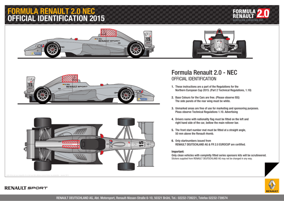 FORMULA RENAULT 2.0 NEC OFFICIAL IDENTIFICATION 2015 15 M. Müller 15 Formula Renault 2.0 - NEC OFFICIAL IDENTIFICATION 15 M. Müller 1. These instructions are a part of the Regulations for the Northern European Cup 2015. (Part 2 Technical Regulations, 1.10) 2. Base Colours for the Cars are free. (Please observe ISG) The side panels of the rear wing must be white. 3. Unmarked areas are free of use for marketing and sponsoring purposes. Pleas observe Technical Regulations 1.10. Advertising 4. Drivers name with nationality flag must be fitted on the left and right hand side of the car, bellow the main rollover bar. 15 5. The front start number mat must be fitted at a straight angle, 50 mm above the Renault rhomb. 6. Only startnumbers issued from RENAULT DEUTSCHLAND AG & FR 2.0 EUROCUP are certified. Important: Only clean vehicles with completly fitted series sponsors kits will be scrutineered. Stickers supplied from RENAULT DEUTSCHLAND AG may not be changed in any way. Cette fiche est une maquette et ne doit pas être utilisée comme fichier de production - Janvier 2015 RENAULT DEUTSCHLAND AG, Abt. Motorsport, Renault-Nissan-Straße 6-10, 50321 Brühl, Tel.: 02232-739221, Telefax 02232-739574 FORMULA RENAULT 2.0 NEC OFFICIAL IDENTIFICATION 2015 Cette fiche est une maquette et ne doit pas être utilisée comme fichier de production - Janvier 2015 RENAULT DEUTSCHLAND AG, Abt. Motorsport, Renault-Nissan-Straße 6-10, 50321 Brühl, Tel.: 02232-739221, Telefax 02232-739574