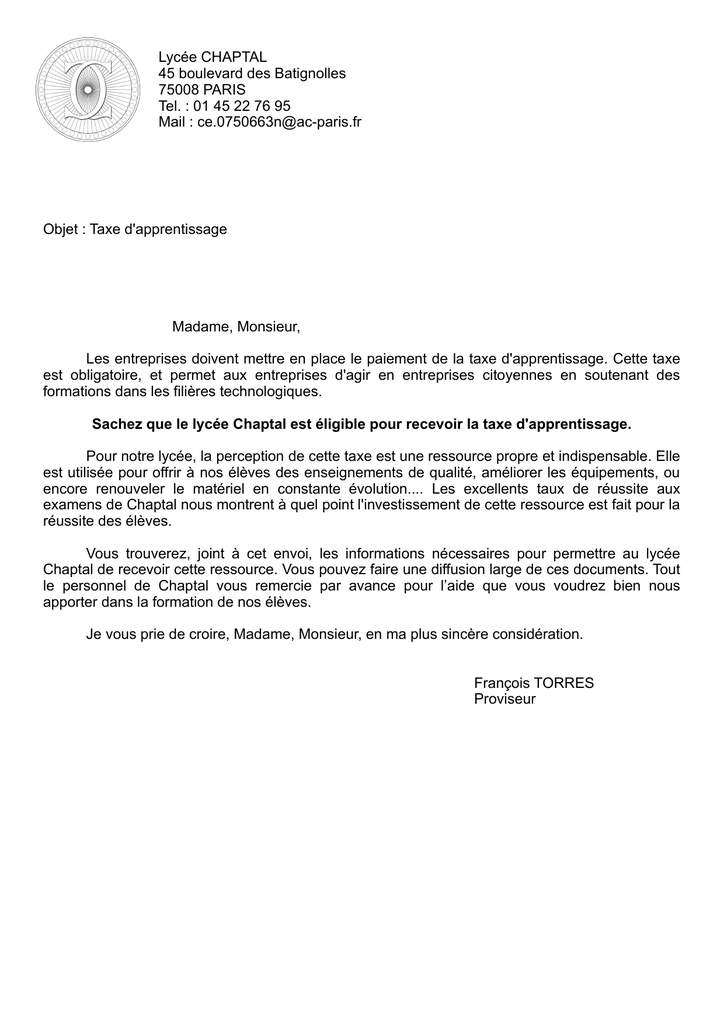 Lycée CHAPTAL 45 boulevard des Batignolles 75008 PARIS Tel. : 01 45 22 76 95 Mail : [email protected] Objet : Taxe d'apprentissage Madame, Monsieur, Les entreprises doivent mettre en place le paiement de la taxe d'apprentissage. Cette taxe est obligatoire, et permet aux entreprises d'agir en entreprises citoyennes en soutenant des formations dans les filières technologiques. Sachez que le lycée Chaptal est éligible pour recevoir la taxe d'apprentissage. Pour notre lycée, la perception de cette taxe est une ressource propre et indispensable. Elle est utilisée pour offrir à nos élèves des enseignements de qualité, améliorer les équipements, ou encore renouveler le matériel en constante évolution.... Les excellents taux de réussite aux examens de Chaptal nous montrent à quel point l'investissement de cette ressource est fait pour la réussite des élèves. Vous trouverez, joint à cet envoi, les informations nécessaires pour permettre au lycée Chaptal de recevoir cette ressource. Vous pouvez faire une diffusion large de ces documents. Tout le personnel de Chaptal vous remercie par avance pour l’aide que vous voudrez bien nous apporter dans la formation de nos élèves. Je vous prie de croire, Madame, Monsieur, en ma plus sincère considération. François TORRES Proviseur Lycée CHAPTAL 45 boulevard des Batignolles 75008 PARIS Tel. : 01 45 22 76 95 Mail : [email protected] Document à communiquer à l'entreprise TAXE D'APPRENTISSAGE Campagne 2016 (au titre des salaires de 2015) Versement à effectuer avant le 1er mars 2016 Pour verser la taxe d'apprentissage, vous devez passer par le biais d'un OCTA (organisme collecteur de la taxe d'apprentissage). Si vous souhaitez attribuer la taxe au lycée Chaptal, il faut bien spécifier par écrit la somme que vous désirez verser. Dans ce cas, nous vous prions de bien vouloir renseigner les informations suivantes : Entreprise : ……………………………………………………………………………………………….. Activité : ………………………………………………………………………………………………….. Adresse du siège : ………………………………………………………………………………………. …………………………………………………………………………………………………………….. Téléphone : ….......................................... Code NAF : …..................... E-mail ..................................................................... N°SIRET : …………………………………….......................... Nombre de salariés : …………… Personne à contacter : …………………………………………… Je vous informe que je demande à l'organisme collecteur ………………………………………...... De faire verser au Lycée Chaptal la somme de ………………………………….. euros. Dès réception du versement, il vous sera adressé un reçu libératoire fiscal. Pour tout complément d'information, vous pouvez contacter M. Hervé RIOU, directeur délégué aux enseignements technologiques, au 06.89.56.37.86., ou par mail à [email protected] Document à retourner à Lycée CHAPTAL Service gestion - taxe d'apprentissage 45 boulevard des Batignolles 75008 PARIS Taxe d'apprentissagIN e VESTISSEZ DANS LE SAVOIR LA JEUNESS E L'EXCELLEN CE LA FORMAT ION BENEFICIEZ DE L'AIDE DE PROFESSIO NNELS L'ASSURAN CE INVESTISSE D'UN BON MENT Lycée CHAPTAL L'EXCELLENCE AU COEUR DE PARIS LYCEE CHAPTAL 45 BVD DES BATIGNOLLES 75008 PARIS ACCES METRO www.lycee-chaptal-paris.fr 2 Station Rome 3 Station Villiers Qu’est ce que Taxe d'Apprentissage ? La Taxe d'Apprentissage (TA) est un impôt versé avant le 1er mars de chaque année par un employeur. Il est obligatoire et permet aux entreprises d'agir en entreprises-citoyennes, en soutenant des formations dans les filières technologiques. Cet impôt présente deux particularités : 1 - chaque entreprise a la liberté de choisir et de désigner le ou les bénéficiaires de son versement 2 - le versement de la Taxe d'Apprentissage se fait obligatoirement auprès d'un Organisme Collecteur de la Taxe d'Apprentissage (OCTA) qui sert d'intermédiaire. Cette année, la date limite de versement est fixée au 1 mars 2016. Entreprises assujetties à la TA Sont assujettis au paiement de cette taxe : les personnes physiques, sociétés de personnes et groupements d'intérêts économiques exerçant une activité relevant un caractère industriel, commercial ou artisanal ; les sociétés, les associations et organismes redevables de l'impôt sur les sociétés ; les coopératives agricoles ; les caisses de crédit agricole ; les entreprises nationalisées. La Taxe est due dès la première année de création de l'entreprise, dès lors qu'elle a au moins un salarié. La Taxe d'Apprentissage 2016 est calculée sur la masse salariale versée en 2015. Son taux est de 0,68% de la masse salariale. Lycée CLe HAPTA L est éligible pour re cevoir la Taxe d'Appre ntissag e La justification des dépenses Toute formation qui s'engage à percevoir la Taxe d'Apprentissage doit, à tout moment, justifier les dépenses qu'elle a engagées au cours de l'année. La nature des dépenses susceptibles d'être financées par les fonds reçus de la Taxe d'Apprentissage doit être en rapport avec les besoins spécifiques des formations pour lesquels la Taxe est versée : achat, location et entretien de matériel et de biens d'équipement pédagogiques, rémunération de conférenciers ou d'intervenants apportant aux élèves un complément de formation, location de salles destinées à la formation prestation de service par les entreprises, ... Choisir son OCTA La loi du 18 janvier 2005 impose à toutes les entreprises de verser leur taxe d'apprentissage par l'intermédiaire d'un OCTA. Il vous faudra donc choisir un OCTA parmi deux habilités à collecter