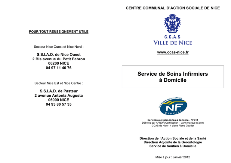 CENTRE COMMUNAL D’ACTION SOCIALE DE NICE POUR TOUT RENSEIGNEMENT UTILE Secteur Nice Ouest et Nice Nord : S.S.I.A.D. de Nice Ouest 2 Bis avenue du Petit Fabron 06200 NICE 04 97 11 40 76 Secteur Nice Est et Nice Centre : www.ccas-nice.fr Service de Soins Infirmiers à Domicile S.S.I.A.D. de Pasteur 2 avenue Antonia Augusta 06000 NICE 04 93 80 57 35 Services aux personnes à domicile - NF311 Délivrée par AFNOR Certification – www.marque-nf.com CCAS de Nice - 4 place Pierre Gautier Direction de l’Action Sociale et de la Santé Direction Adjointe de la Gérontologie Service de Soutien à Domicile Mise à jour : Janvier 2012 Ses missions Le Service de Soins Infirmiers à Domicile fonctionne 7 jours sur 7 de 7h30 à 19h30 Sur prescription médicale, des soins d’hygiène quotidiens sont dispensés par des aides soignants, soins individualisés et adaptés à chacun. En fonction de vos besoins, votre infirmier libéral peut intervenir après accord du responsable de service. Ce Service a pour objectif de permettre aux personnes âgées ou handicapées de demeurer à leur domicile dans les meilleures conditions possibles d’environnement, avec une prise en charge spécifique adaptée à leur situation de dépendance. Il s’adresse aux assurés sociaux domiciliés sur la commune de Nice : Chaque Service est composé de : - deux Infirmiers Diplômés d’Etat (Responsable de Service et son Adjoint) - un agent administratif - une équipe d’aides soignants diplômés - de plus de 60 ans - de personnes adultes de moins de 60 ans atteintes de pathologies chroniques, - de personnes adultes de moins de 60 ans présentant un handicap Aucune participation financière n’est demandée. L’organisme d’Assurance Maladie attribue aux Services de Soins Infirmiers à Domicile une somme forfaitaire qui couvre le montant des soins.