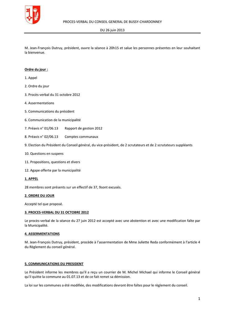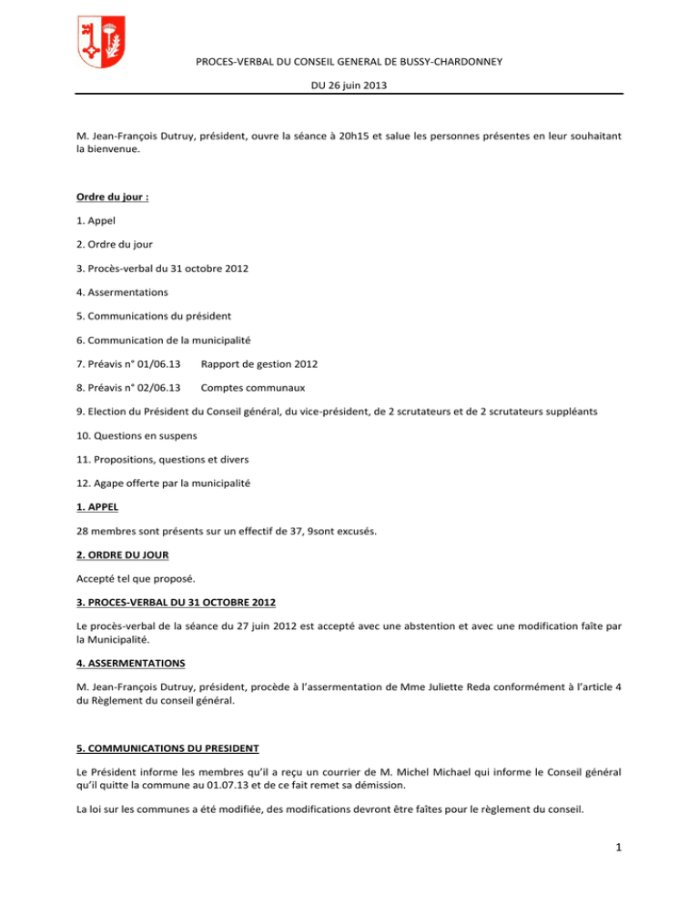 PROCES-VERBAL DU CONSEIL GENERAL DE BUSSY-CHARDONNEY DU 26 juin 2013 M. Jean-François Dutruy, président, ouvre la séance à 20h15 et salue les personnes présentes en leur souhaitant la bienvenue. Ordre du jour : 1. Appel 2. Ordre du jour 3. Procès-verbal du 31 octobre 2012 4. Assermentations 5. Communications du président 6. Communication de la municipalité 7. Préavis n° 01/06.13 Rapport de gestion 2012 8. Préavis n° 02/06.13 Comptes communaux 9. Election du Président du Conseil général, du vice-président, de 2 scrutateurs et de 2 scrutateurs suppléants 10. Questions en suspens 11. Propositions, questions et divers 12. Agape offerte par la municipalité 1. APPEL 28 membres sont présents sur un effectif de 37, 9sont excusés. 2. ORDRE DU JOUR Accepté tel que proposé. 3. PROCES-VERBAL DU 31 OCTOBRE 2012 Le procès-verbal de la séance du 27 juin 2012 est accepté avec une abstention et avec une modification faîte par la Municipalité. 4. ASSERMENTATIONS M. Jean-François Dutruy, président, procède à l’assermentation de Mme Juliette Reda conformément à l’article 4 du Règlement du conseil général. 5. COMMUNICATIONS DU PRESIDENT Le Président informe les membres qu’il a reçu un courrier de M. Michel Michael qui informe le Conseil général qu’il quitte la commune au 01.07.13 et de ce fait remet sa démission. La loi sur les communes a été modifiée, des modifications devront être faîtes pour le règlement du conseil. 1 6. COMMUNICATIONS DE LA MUNICIPALITE Mme Laurence Cretegny, syndique : Pas de communication. M. Michel Berger, municipal : Pas de communication. M. Daniel Geinoz, municipal : 1. L’inauguration de la nouvelle place de jeux aura lieu le 4 juillet 2013 à 18h30. 2. ASIC : les travaux à entreprendre pour la porte et le sol à Chaniaz ont été acceptés. Le 8 juillet 2013, un chauffage à gaz sera installé à la place de chaudière à mazout. 3. Un plan de quartier va être établi pour la croisée. M. Jean-Pierre Counet, municipal : 1. Les 4 cantines scolaires mises sur pied fonctionnent bien. 2. Les communes de Reverolle, Clarmont, Vaux et Bussy-Chardonney étudient la facture sociale. Mme Marie-Jeanne Cavin, municipale : 1. Le site internet de la RCP sera bientôt fonctionnel. 2. AVM : une conduite a dû être déplacée. Les finances s’améliorent. 3. PC : la réorganisation a été acceptée. 4. Un escalier en bois va être posé pour l’accès au banc du 50 ème anniversaire. 5. Des systèmes ECO fontaines vont être installés dans les fontaines de l’église et de la place du village. L’eau ne sera toutefois toujours pas potable. 6. Mme Cavin remercie le Conseil général pour les années passées à travailler ensemble. 7. PREAVIS N° 01/06.13 RAPPORT DE GESTION 2012 M. Thierry Chevillat lit le rapport rendu par la commission Gestion et finances. Les explications de la Municipalité, le rapport de la commission Gestion et finances ne suscitent aucunes remarques. Le préavis est accepté avec 2 abstentions. 8. PREAVIS 02/06.13 COMPTES COMMUNAUX M. Cédric Schneider lit le rapport rendu par la commission Gestion et finances. Les explications de la Municipalité, le rapport de la commission Gestion et Finances ne suscitent aucunes remarques. Le préavis est accepté avec 3 abstentions. 9. ELECTION DU PRESIDENT DU CONSEIL GENERAL, DU VICE-PRESIDENT, DE 2 SCRUTATEURS ET DE 2 SCRUTATEURS SUPPLEANTS M. Jean-François Dutruy, Président cède sa place à Mme Juliette Reda pour l’élection du président du conseil. M. Jean-François Dutruy se représente, il est élu à l’unanimité. 2 M. Jacques Estoppey propose M. Sébastien Freymond comme vice-président, il est élu à l’unanimité. M. Yvan di Natale et M. Cyril Besson se représentent comme scrutateurs, ils sont élus à l’unanimité. M. Daniel Aubord se représente comme scrutateur suppléant, il est élu à l’unanimité. Mme Sandra Bovey se propose pour le 2 ème scrutateur suppléant, elle est élue à l’unanimité. 10. QUESTIONS EN SUSPENS Pas de questions. 11. PROPOSITION, QUESTIONS ET DIVERS M. Nicolas Daïna demande combien coûte l’enlèvement des déchets verts, des déchets indésirables et le prix de la nouvelle clôture métallique. Mme Laurence Cretegny, syndique l’informe que la clôture a coûté CHF 2'000.-, pour l’enlèvement de la ferraille CHF 900.-, le carton CHF 3'000.-, le verre CHF 2'000.- l’huile CHF 1'200.-, CHF 4'000.pour les déchets inertes. Et CHF 12'000.- pour les déchets verts. Le tout réparti pour les 4 communes. M. Nicolas Daïna trouve que cela cher pour les déchets verts car les personnes extérieures aux 4 communes peuvent venir déposer leurs déchets verts. M. Joseph Rempe relate qu’à l’époque il n’y avait pas de déchetterie et que les déchets verts étaient mis au talus. Mme Francine Jeanprêtre trouve dommage que la démission de Mme Marie-Jeanne Cavin et l’élection de Mme Juliette Reda n’ont pas été annoncé au pilier public. M. Michel Berger, municipal informe le conseil qu’une étude est actuellement en cours par un bureau d’ingénieur pour la vitesse excessive de certain véhicule dans le village. Une intervention a eu lieu dernièrement par la gendarmerie. Mme Sandra Bovey demande ce que va devenir la station-service maintenant que le garage est fermé. Mme Laurence Cretegny, syndique lui répond que malheureusement la commune ne peut faire car il s’agit d’un immeuble privé. Elle sait que la citerne va être assainie. Elle précise également que 2 m du mur quand on arrive depuis Yens va être cassé. M. Edward Atkinson revient sur le fait que la route de Bussy est dangereuse et trouve pas normal que le trottoir ne soit que d’un côté de la route. Mme Laurence Cretegny, syndique l’informe que le service des routes ne veut pas rentrer en matière. M. Jacques Estoppey demande s’il serait possible de mettre un miroir sur la route de l’Etraz et du Chêne quand on vient depuis Cos
