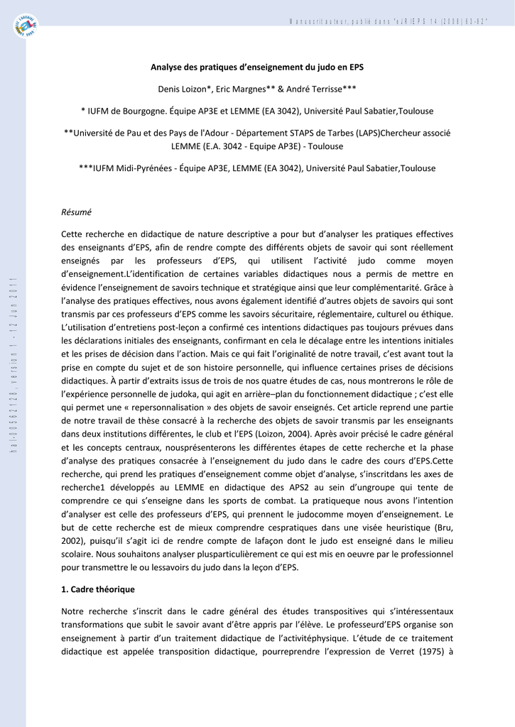 Manuscrit auteur, publié dans "eJRIEPS 14 (2008) 63-82" Analyse des pratiques d’enseignement du judo en EPS Denis Loizon*, Eric Margnes** & André Terrisse*** * IUFM de Bourgogne. Équipe AP3E et LEMME (EA 3042), Université Paul Sabatier,Toulouse **Université de Pau et des Pays de l'Adour - Département STAPS de Tarbes (LAPS)Chercheur associé LEMME (E.A. 3042 - Equipe AP3E) - Toulouse ***IUFM Midi-Pyrénées - Équipe AP3E, LEMME (EA 3042), Université Paul Sabatier,Toulouse hal-00562128, version 1 - 12 Jun 2011 Résumé Cette recherche en didactique de nature descriptive a pour but d’analyser les pratiques effectives des enseignants d’EPS, afin de rendre compte des différents objets de savoir qui sont réellement enseignés par les professeurs d’EPS, qui utilisent l’activité judo comme moyen d’enseignement.L’identification de certaines variables didactiques nous a permis de mettre en évidence l’enseignement de savoirs technique et stratégique ainsi que leur complémentarité. Grâce à l’analyse des pratiques effectives, nous avons également identifié d’autres objets de savoirs qui sont transmis par ces professeurs d’EPS comme les savoirs sécuritaire, réglementaire, culturel ou éthique. L’utilisation d’entretiens post-leçon a confirmé ces intentions didactiques pas toujours prévues dans les déclarations initiales des enseignants, confirmant en cela le décalage entre les intentions initiales et les prises de décision dans l’action. Mais ce qui fait l’originalité de notre travail, c’est avant tout la prise en compte du sujet et de son histoire personnelle, qui influence certaines prises de décisions didactiques. À partir d’extraits issus de trois de nos quatre études de cas, nous montrerons le rôle de l’expérience personnelle de judoka, qui agit en arrière–plan du fonctionnement didactique ; c’est elle qui permet une « repersonnalisation » des objets de savoir enseignés. Cet article reprend une partie de notre travail de thèse consacré à la recherche des objets de savoir transmis par les enseignants dans deux institutions différentes, le club et l’EPS (Loizon, 2004). Après avoir précisé le cadre général et les concepts centraux, nousprésenterons les différentes étapes de cette recherche et la phase d’analyse des pratiques consacrée à l’enseignement du judo dans le cadre des cours d’EPS.Cette recherche, qui prend les pratiques d’enseignement comme objet d’analyse, s’inscritdans les axes de recherche1 développés au LEMME en didactique des APS2 au sein d’ungroupe qui tente de comprendre ce qui s’enseigne dans les sports de combat. La pratiqueque nous avons l’intention d’analyser est celle des professeurs d’EPS, qui prennent le judocomme moyen d’enseignement. Le but de cette recherche est de mieux comprendre cespratiques dans une visée heuristique (Bru, 2002), puisqu’il s’agit ici de rendre compte de lafaçon dont le judo est enseigné dans le milieu scolaire. Nous souhaitons analyser plusparticulièrement ce qui est mis en oeuvre par le professionnel pour transmettre le ou lessavoirs du judo dans la leçon d’EPS. 1. Cadre théorique Notre recherche s’inscrit dans le cadre général des études transpositives qui s’intéressentaux transformations que subit le savoir avant d’être appris par l’élève. Le professeurd’EPS organise son enseignement à partir d’un traitement didactique de l’activitéphysique. L’étude de ce traitement didactique est appelée transposition didactique, pourreprendre l’expression de Verret (1975) à l’origine de ce concept. Celui-ci est devenu unoutil théorique indispensable (Terrisse, Léziart, 1997), dans la mesure où il permet decomprendre les différentes transformations que subit le savoir depuis son origine jusqu’àson acquisition par l’élève. Quel est donc le savoir enseigné dans ce cadre scolaire ?Quelles sont les transformations que subit ce savoir ? Comment peut-on expliquer cestransformations ? Autant de questions qui vont devenir centrales dans cette analyse despratiques d’enseignement. hal-00562128, version 1 - 12 Jun 2011 1. 1. Contexte théorique Pour mieux comprendre cette première étape de la transposition didactique, nous utilisonscomme champ de référence du savoir ce que Martinand (1986) appelle « les pratiques sociales de référence » dans le sens où l’activité physique et sportive est porteuse d’unsavoir de référence. Dans ce cas précis, il nous semble plus pertinent de parler deréférence experte plutôt que référence savante. Il est alors possible de retrouver cetteréférence experte dans les documents réalisés par la fédération française de judo (FFJ).Cette mise en texte du savoir expert est visible dans les deux méthodes d’enseignement réalisées par la FFJ, l’une en 1967, et l’autre plus récente en 1990, avec le concours desplus hauts gradés. Deux savoirs spécifiques au judo sont ainsi présentés dans ces deuxméthodes : d’un côté le savoir technique et de l’autre le savoir stratégique ; ilsreprésentent ce que Terrisse (2000) appelle le savoir pour la pratique. Ces deux objets desavoirs relèvent selon nous, des savoirs fondamentaux qui caractérisent cette pratiquesportive.Le savoir technique peut être défini comme l’ensemble des techniques qui relèvent del’activité judo, techniques codifiées au fil du temps par les experts ; il correspond dans laméthode de 1967 (FFJDA, 1967) à une description formelle essentiellement temporelle (ledéséquilibre, le placement du corps de l’attaquant et la projection). Ce savoir techniquecomposé des techniques de projection (judo debout) et des techniques de contrôle au sol(immobilisations, étranglements et clés de bras) constitue la base du judo permettant dereconnaître et d’identifier ce sport parmi les différents sports de combat (Janicot, Pouillart,1997). Pour ces experts, cette base techniq