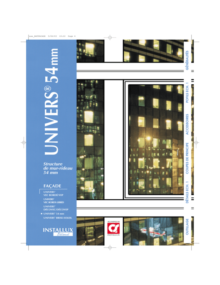 5/06/03 10:22 Page 4 COUPES DE PRINCIPE ACCESSOIRES ® POFILS ECH. 1 GÉNÉRALITÉS UNIVERS 54 mm exe_BATFACADE DÉTAILS ECH. 1 Structure de mur-rideau 54 mm FAÇADE UNIVERS® VEC BORDÉ/VEP UNIVERS® VEC BORDS LIBRES UNIVERS® DÉCOVEC/DÉCOVEP • UNIVERS ® 54 mm UNIVERS BRISE-SOLEIL ALUMINIUM INSTALLUX OUTILLAGE ® XP. UNIVERS DECO54_2003 Début 3/06/03 9:36 Page 1 GÉNÉRALITÉS GÉNÉRALITÉS UNIVERS® DÉCOFACE 54mm Structure de mur-rideau 54 mm DESCRIPTIF TECHNIQUE OSSATURE En aluminium extrudé (6060T5), composée de montants et traverses ( type échelle ou grilles ) avec raccordement sur gros œuvre par pattes de fixation réglables. Les sections sont déterminées suivant exposition et hauteur de la façade (limite d'utilisation définie par abaque sur H et L). Serreur avec capot largeur 53 pouvant recevoir un remplissage de 1 à 32 mm. OUVRANT Tous types d'ouvrant de la gamme ESPACE ® , COMÈTE®, GALAXIE® et à l'italienne type UNIVERS® VEC, masqué de l'extérieur. ACCESSOIRES Façade Mur rideau et habillage de façade. POFILS ECH. 1 APPLICATION - ANODISATION: classe 20 (argent satiné) qualité QUALANOD-EWAA-EURAS,coloration dans la fourchette de teinte correspondante au grade n°3 de l'échelle des gris (selon ISO 105 AOZ) - LAQUAGE: 80 microns label QUALICOAT - Visserie en acier inoxydable. PARTICULARITÉS Adaptable sur profils montants traditionnels, différents types de capots permettent de moduler l'esthétique extérieure. 5/06/03 10:22 Page 4 UNIVERS® 54 mm exe_BATFACADE 31/01/03 Structure de mur-rideau 54 mm FAÇADE UNIVERS® VEC BORDÉ/VEP UNIVERS® VEC BORDS LIBRES UNIVERS® DÉCOVEC/DÉCOVEP • UNIVERS ® 54 mm UNIVERS® BRISE-SOLEIL ALUMINIUM INSTALLUX 1 DÉTAILS ECH. 1 TRAITEMENT DE SURFACE Esthétique extérieure et intérieure modulable. OUTILLAGE Par joint EPDM sur ossature et serreur. Joint à la pompe (1 ère cat. SNJF) pour étanchéité des assemblages et le raccordement au gros œuvre. Rupture thermique entre profils intérieurs et extérieurs à l'aide d'une barrière EPDM hauteur 6 ou 11mm. COUPES DE PRINCIPE ÉTANCHÉITE 3/06/03 9:36 Page 2 UNIVERS® DÉCOFACE 54mm Structure de mur-rideau 54 mm LIMITE D’UTILISATION : GÉNÉRALITÉS DÉTAILS ECH. 1 COUPES DE PRINCIPE ACCESSOIRES POFILS ECH. 1 VENT : CARTE DES RÉGIONS GÉNÉRALITÉS XP. UNIVERS DECO54_2003 Début Zone 1 Zone 2 Zone 3 5/06/03 10:22 Page 4 UNIVERS® 54 mm exe_BATFACADE 2 Structure de mur-rideau 54 mm FAÇADE UNIVERS® VEC BORDÉ/VEP UNIVERS® VEC BORDS LIBRES UNIVERS® DÉCOVEC/DÉCOVEP • UNIVERS ® OUTILLAGE Zone 4 54 mm UNIVERS® BRISE-SOLEIL ALUMINIUM INSTALLUX 31/01/03 UNIVERS® DÉCOFACE 54mm Structure de mur-rideau 54 mm LIMITE D’UTILISATION : GÉNÉRALITÉS VENT - DÉCOUPAGE DES ZONES SUIVANT LES DÉPARTEMENTS DÉPARTEMENT 97-1 Guadeloupe 97-2 Martinique 97-3 Guyane 2 2 2 2 2 2 2 2 2 2 2/3/4 2 3/4 3 2 2 2 2 2 3/4 3/4 1/2 3/4 2 2 1 2 2/3 2 4 2 2 2 2 2/3 2/3 2 2 2 1 2 2 1 2 2/3 2 2 2 48-Lozère 49-Maine et Loire 50-Manche 51-Marne 52-Marne (haute) 53-Mayenne 54-Meurthe et Moselle 55-Meuse 56-Morbihan 57-Moselle 58-Nièvre 59-Nord 60-Oise 61-Orne 62-Pas de Calais 63-Puy de Dôme 64-Pyrénnées-Atlantique 65-Pyrénnées (hautes) 66-Pyrénnées Orientales 67-Rhin (bas) 68-Rhin (haut) 69-Rhône 70-Saône (haute) 71-Saône et Loire 72-Sarthe 73-Savoie 74-Savoie (haute) 75-Paris 76-Seine Maritime 77-Seine et Marne 78-Yvelines 79-Sèvres (deux) 80-Somme 81-Tarn 82-Tarn et Garonne 83-Var 84-Vaucluse 85-Vendée 86-Vienne 87-Vienne (haute) 88-Vosges 89-Yonne 90-Territoire de Belfort 91-Essonne 92-Hauts de Seine 93-Seine-Saint-Denis 94-Val de Marne 95-Val d'Oise ZONE(S) DÉPARTEMENT 5 5 1 97-4 Réunion 97-5 St-Pierre & Miquelon 98-5 Mayotte ZONE(S) 2 2 3/4 2 2 2 2 2 3/4 2 2 2/3 2 2 2/3 2 2 2 2/3/4 1/2 1 1 1 1 2 2 2 2 2/3 2 2 2 2/3 2 2 2/3/4 2/3/4 2/3 2 2 1 2 1 2 2 2 2 2 ZONE(S) 5 4 5 DÉCOUPAGE DES ZONES SUIVANT LES CANTONS DÉPARTEMENT ZONES 11-Aude 4 3 13-Bouches du Rhône 2 3 2B-Haute Corse 4 4 3 3 21-Côte d'Or 4 2 22-Côtes d'Armor 1 4 27-Eure 3 3 34-Hérault 2 3 35-Ille & Vilaine 2 2 44-Loire Atlantique 3 2 50-Manche 3 4 2A-Corse du Sud 59-Nord 3 4 3 3 62-Pas-de-Calais 2 3 56-Morbihan 66-Pyrénées Orientales 2 2 3 67- Bas-Rhin 4 2 76-Seine Maritime 1 3 80-Somme 2 3 83-Var 2 2 3 84-Vaucluse 85-Vendée 4 2 3 4 3 2 5/06/03 10:22 Page 4 UNIVERS® 54 mm exe_BATFACADE 31/01/03 Structure de mur-rideau 54 mm FAÇADE UNIVERS® VEC BORDÉ/VEP UNIVERS® VEC BORDS LIBRES UNIVERS® DÉCOVEC/DÉCOVEP • UNIVERS ® CANTONS Coursan, Durban-Corbières, Ginestas, LézignanCorbières, Narbonne (tous les cantons), Sigean Capendu, Lagrasse, Mouthoumet, Peyriac-Minervois, Tuchan Tous les autres cantons Arles (tous les cantons), Châteaurenard, Peyrolles-enProvence, Saintes-Maries-de-la-Mer, Saint-Rémy-deProvence, Tarascon Tous les autres cantons Bonifacio, Figari, Levie, Porto-Vecchio Tous les autres cantons Belgodère, Calenzana, Calvi, Castifao-Morosaglia, Corte, L'Ile-Rousse, Niolu-Omessa, Venaco Tous les autres cantons Aignay-le-Duc, Baigneux-les-Juifs, Châtillon-sur-Seine, Laignes, Montbard, Montigny-sur-Aube, Précy-sous-Thil, Recey-sur-Ource, Saulieu, Semur-en-Auxois, Venareyles-Laumes, Vitteaux Tous les autres cantons Bégard, Belle-Isle-en-Terre, Bourbriac, Callac, Gouarec, Guingamp, Lannion, Lanvollon, Lézardrieux, Maël-Carhaix, Paimpol, Perros-Guirec, Plestin-les-Grèves, Plouagat, Plouaret, Plouha, Pontrieux, La Roche-Derrien, Rostrenen, Saint-Nicolas-du-Pélem, Trégu Tous les autres cantons Beuzeville, Cormeilles, Pont-Audemer, Quillebeuf-surSeine, Saint-Georges-du-Vièvre, Thiberville Tous les autres cantons Béziers (tous les cantons), Capestang, Olonzac, SaintChinian, Saint-Pons-de-Thomières Tous les autres cantons Argentré-du-Plessis, Bain-de-Bretagne, Châteaubourg, Grand-Fougeray, La Guerche-de-Bretagne, Janzé, Retiers, Le Sel-de-Bretagne, Vitré (tous les cantons) Tous les autres cantons Aigrefeuille-sur-Maine, Ancenis, Châteaubriant, Clisson, Derval, Ligné, Moisdo