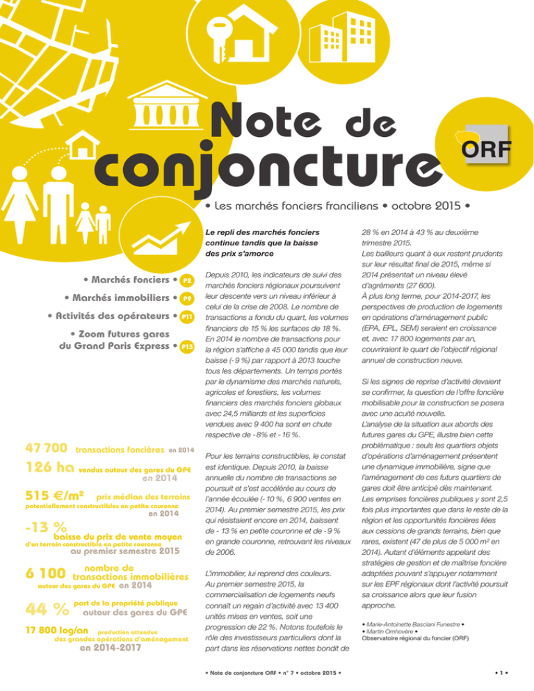 Note de conjoncture • Les marchés fonciers franciliens • octobre 2015 • Le repli des marchés fonciers continue tandis que la baisse des prix s’amorce • Marchés fonciers • P2 • Marchés immobiliers • P9 • Activités des opérateurs • P11 • Zoom futures gares du Grand Paris Express • P13 47 700 transactions foncières en 2014 126 ha vendus autour des gares du GPE en 2014 515 e/m² prix médian des terrains potentiellement constructibles en petite couronne en 2014 -13 % baisse du prix de vente moyen d’un terrain constructible en petite couronne au premier semestre 2015 6 100 nombre de transactions immobilières autour des gares du GPE 44 % en 2014 part de la propriété publique autour des gares du GPE 17 800 log/an production attendue des grandes opérations d’aménagement en 2014-2017 Depuis 2010, les indicateurs de suivi des marchés fonciers régionaux poursuivent leur descente vers un niveau inférieur à celui de la crise de 2008. Le nombre de transactions a fondu du quart, les volumes financiers de 15 % les surfaces de 18 %. En 2014 le nombre de transactions pour la région s’affiche à 45 000 tandis que leur baisse (- 9 %) par rapport à 2013 touche tous les départements. Un temps portés par le dynamisme des marchés naturels, agricoles et forestiers, les volumes financiers des marchés fonciers globaux avec 24,5 milliards et les superficies vendues avec 9 400 ha sont en chute respective de - 8% et - 16 %. Pour les terrains constructibles, le constat est identique. Depuis 2010, la baisse annuelle du nombre de transactions se poursuit et s’est accélérée au cours de l’année écoulée (- 10 %, 6 900 ventes en 2014). Au premier semestre 2015, les prix qui résistaient encore en 2014, baissent de - 13 % en petite couronne et de - 9 % en grande couronne, retrouvant les niveaux de 2006. L’immobilier, lui reprend des couleurs. Au premier semestre 2015, la commercialisation de logements neufs connaît un regain d’activité avec 13 400 unités mises en ventes, soit une progression de 22 %. Notons toutefois le rôle des investisseurs particuliers dont la part dans les réservations nettes bondit de • Note de conjoncture ORF • n° 7 • octobre 2015 • 28 % en 2014 à 43 % au deuxième trimestre 2015. Les bailleurs quant à eux restent prudents sur leur résultat final de 2015, même si 2014 présentait un niveau élevé d’agréments (27 600). À plus long terme, pour 2014-2017, les perspectives de production de logements en opérations d’aménagement public (EPA, EPL, SEM) seraient en croissance et, avec 17 800 logements par an, couvriraient le quart de l’objectif régional annuel de construction neuve. Si les signes de reprise d’activité devaient se confirmer, la question de l’offre foncière mobilisable pour la construction se posera avec une acuité nouvelle. L’analyse de la situation aux abords des futures gares du GPE, illustre bien cette problématique : seuls les quartiers objets d’opérations d’aménagement présentent une dynamique immobilière, signe que l’aménagement de ces futurs quartiers de gares doit être anticipé dès maintenant. Les emprises foncières publiques y sont 2,5 fois plus importantes que dans le reste de la région et les opportunités foncières liées aux cessions de grands terrains, bien que rares, existent (47 de plus de 5 000 m² en 2014). Autant d’éléments appelant des stratégies de gestion et de maîtrise foncière adaptées pouvant s’appuyer notamment sur les EPF régionaux dont l’activité poursuit sa croissance alors que leur fusion approche. • Marie-Antoinette Basciani Funestre • • Martin Omhovère • Observatoire régional du foncier (ORF) •1• Marchés fonciers Suivi des marchés à l’échelle régionale Le marché global en net recul Nombre de transactions foncières en Île-de-France Volume financier des transactions foncières en Île-de-France Le marché foncier global comprend l’ensemble des ventes réalisées à titre onéreux pour lesquelles une surface de terrain a été déclarée aux services fiscaux : il s’agit donc aussi bien de terrains agricoles que de terrains à bâtir, mais aussi d’immeubles accompagnés de leur terrain d’assiette ou de fonds bâtis destinés au recyclage urbain. Depuis 2011, le nombre de transactions foncières recule inéluctablement. Alors que l’année 2013 présentait une stabilisation des ventes juste au-dessous de la barre des 50 000, celles-ci accusent un nouveau recul en 2014. Avec 44 700 transactions réalisées en 2014, le nombre de ventes se contracte de - 9 % par rapport à 2013 et s’affiche en retrait de - 26 % par rapport à 2010. À elle seule, la grande couronne représente les trois quarts des transactions réalisées en 2014 avec 12 600 ventes en Seine-et-Marne, 8 000 dans les Yvelines, 7 400 en Essonne et 6 300 dans le Val-d’Oise. Sur un an, la baisse du nombre de transactions affecte l’ensemble des départements, et plus sensiblement ceux du Val-d’Oise (- 15 %), de l’Essonne (- 12 %) et du Val-deMarne (- 11 %). Pour la deuxième année consécutive, le volume financier global des marchés fonciers est lui aussi orienté à la baisse : totalisant 24,5 milliards d’euros en 2014, il se contracte de - 8 % par rapport à 2013, - 17 % par rapport à 2012. Autre indicateur de suivi du marché foncier global, les superficies totales échangées affichent un net repli (- 16 % par rapport à 2013). Sur la période étudiée, avec 9 400 ha ayant changé de main au cours de l’année 2014, le marché est à son étiage. Nombre de transactions par départements en 2014 et évolution depuis 2013 Assiettes foncières cumulées des transactions foncières en Île-de-France Sources des graphiques : Direction générale des finances publiques, DVF, 2006-2014 © ORF Sources cartographiques : DGFiP, DVF, 2013/1 & 2014/1 - IGN Mise en forme & fonds cartographiques : IAU îdF •2• • Note de conjonctur