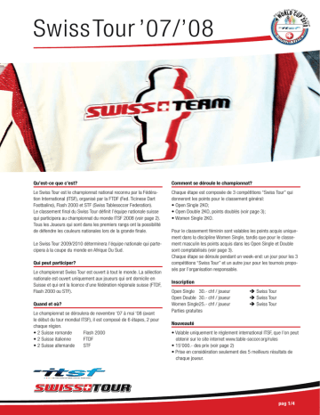 Swiss Tour ’07/’08 Qu’est-ce que c’est? Comment se déroule le championnat? Le Swiss Tour est le championnat national reconnu par la Fédération International (ITSF), organisé par la FTDF (Fed. Ticinese Dart Footbalino), Flash 2000 et STF (Swiss Tablesoccer Federation). Le classement final du Swiss Tour définit l’équipe nationale suisse qui participera au championnat du monde ITSF 2008 (voir page 2). Tous les Joueurs qui sont dans les premiers rangs ont la possibilité de défendre les couleurs nationales lors de la grande finale. Chaque étape est composée de 3 compétitions “Swiss Tour” qui donneront les points pour le classement général: • Open Single 2KO; • Open Double 2KO, points doublés (voir page 3); • Women Single 2KO. Le Swiss Tour 2009/2010 déterminera l’équipe nationale qui partecipera à la coupe du monde en Afrique Du Sud. Qui peut participer? Le championnat Swiss Tour est ouvert à tout le monde. La sélection nationale est ouvert uniquement aux joueurs qui ont domicile en Suisse et qui ont la licence d’une fédération régionale suisse (FTDF, Flash 2000 ou STF). Quand et où? Le championnat se déroulera de novembre ‘07 à mai ‘08 (avant le début du tour mondial ITSF), il est composé de 6 étapes, 2 pour chaque région. • 2 Suisse romande Flash 2000 • 2 Suisse italienne FTDF • 2 Suisse allemande STF Pour le classement féminin sont valables les points acquis uniquement dans la discipline Women Single, tandis que pour le classement masculin les points acquis dans les Open Single et Double sont comptabilisés (voir page 3). Chaque étape se déroule pendant un week-end: un jour pour les 3 compétitions “Swiss Tour” et un autre jour pour les tournois proposés par l’organisation responsable. Inscription Open Single 30.- chf / joueur Open Double 30.- chf / joueur Women Single25.- chf / joueur Parties gratuites Ë Swiss Tour Ë Swiss Tour Ë Swiss Tour Nouveauté • Valable uniquement le réglement international ITSF, que l’on peut obtenir sur le site internet www.table-soccer.org/rules • 15’000.- des prix (voir page 2) • Prise en considération seulement des 5 meilleurs résultats de chaque joueur. FOR FOR ITSF ITSF WORLD WORLD CHAMPIONSHIP CHAMPIONSHIP 2008 2008 pag 1/4 Jackpot chf. Classement final après 6 étapes Open (la somma Single+Double) 1° rank 1’500.- Swiss Team + Finale ITSF - Single 2° rank 1’500.- Swiss Team + Finale ITSF - Double 3° rank 1’500.- Swiss Team + Finale ITSF - Double 4° rank 1’500.- Swiss Team + Finale ITSF - Wild Card 5° rank 1’500.- Swiss Team + Finale ITSF - Wild Card 6° rank 1’500.- Swiss Team 7° rank 1’000.- 1° réserve 8° rank 750.- 2° réserve 9° rank 600.- 3° réserve 10°rank 500.- ... 11°rank 400.- 12°rank 300.- 13°rank 200.- 14°rank 150.- 15°rank 100.- Women 1° rank 1’000.- Swiss Team + Finale ITSF - Single/Double 2° rank 1’000.- Swiss Team + Finale ITSF - Double 3° rank 1° réserve + Finale ITSF - Wild Card 4° rank 2° réserve + Finale ITSF - Wild Card En cas d’absence d’un joueur qualifié, il sera ramplacé par la réserve. Tous les joueurs classés après la 6ème place sont considérés comme réserves. C’est le joueur le mieux classé qui a droit de remplacer un joueur qualifié. Les meilleurs joueurs Senior et Junior du Swiss Tour ont aussi le droit d’aller à la finale du championnat du monde. FOR FOR ITSF ITSF WORLD WORLD CHAMPIONSHIP CHAMPIONSHIP 2008 2008 pag 2/4 Scores Les points sont attribués uniquement selon la table ci-dessous. Les points des tournois Open Double sont doublés. Open Single Open Double Open Women Rank Points Rank Pointsi Rank Points 1° 100 + Nr. teams 1° 200 + Nr. teams 1° 100 + Nr. teams 2° 90 + Nr. teams 2° 180 + Nr. teams 2° 90 + Nr. teams 3° 80 + Nr. teams 3° 160 + Nr. teams 3° 80 + Nr. teams 4° 70 + Nr. teams 4° 140 + Nr. teams 4° 70 + Nr. teams 5°/ 6° 60 + Nr. teams 5°/ 6° 120 + Nr. teams 5°/ 6° 60 + Nr. teams 7°/ 8° 50 + Nr. teams 7°/ 8° 100 + Nr. teams 7°/ 8° 50 + Nr. teams 9°/ 12° 40 + Nr. teams 9°/ 12° 80 + Nr. teams 9°/ 12° 40 + Nr. teams 13°/16° 39 + Nr. teams 13°/16° 78 + Nr. teams 13°/16° 39 + Nr. teams 17°/24° 38 + Nr. teams 17°/24° 76 + Nr. teams 17°/24° 38 + Nr. teams 25°/31° 37 + Nr. teams 25°/31° 74 + Nr. teams 25°/31° 37 + Nr. teams ... + Nr. teams ... + Nr. teams ... + Nr. teams ... ... ... Exemple: la première place d’un tournoi Open Double avec 50 teams obtient 250 points (200 points + le nbre de teams) par joueur. Swiss Team 2007 9. Eaubonne, Francia 4. Borgloon, Belgio 3. Giubiasco, Svizzera 4. Tulln, Austria Swiss Tour Champion 2007 David Baldassari Jean-Yves Perrin Fabio Di Santo Noemi Berkeczy Elena Causetti Gilles Perrin Laurent Granger Mirko Ramser Gilles Perrin Jean-Yves Perrin Mirko Ramser FOR FOR ITSF ITSF WORLD WORLD CHAMPIONSHIP CHAMPIONSHIP 2008 2008 pag 3/4 Programme å 17-18 Novembre STF - Luzern è 16-17 Février STF - Herisau Lieu S3 Pub, Dorfstrasse 54, 6142 Gettnau Table 7 - Garlando Swiss Deluxe Lieu Walke 43 Sektor A3 2. Obergeschoss, 9100 Herisau 6 - Garlando Deluxe Samedi 13.30 Open Double Inscr. 20.- + 5.-/joueur (parties gratuites) prix 1° 40% - 2° 30% - 3° 10% Qualifications système suisse Ë playoff 2KO Dimanche 10.00 Open Single Swiss Tour 12.00 Women Single Swiss Tour 13.00 Open Double Swiss Tour ç 8-9 Décembre FTDF - Ticino Lieu Valtennis, 6710 Biasca Table Table Samedi 13.00 1° Challenger 2008 - Open double Inscr. 50.- / team Prix: % Challenger programme Qualifications système suisse Ë playoff 2KO Dimanche 10.00 Open Single Swiss Tour 12.00 Women Single Swiss Tour 13.00 Open Double Swiss Tour ê 15-16 Mars FTDF - Ticino 10 - New Roberto Sport Lieu Valtennis, 6710 Biasca Samedi 10.00 Open Double Inscr. 20.- + 5.-/joueur (parties gratuites) prix 1° 40% - 2° 30% - 3° 10% Qualifications teams qualifiés Ë playoff 2KO teams non qualifiés Ë petit finale 2KO Table 10 - New Roberto Sport 