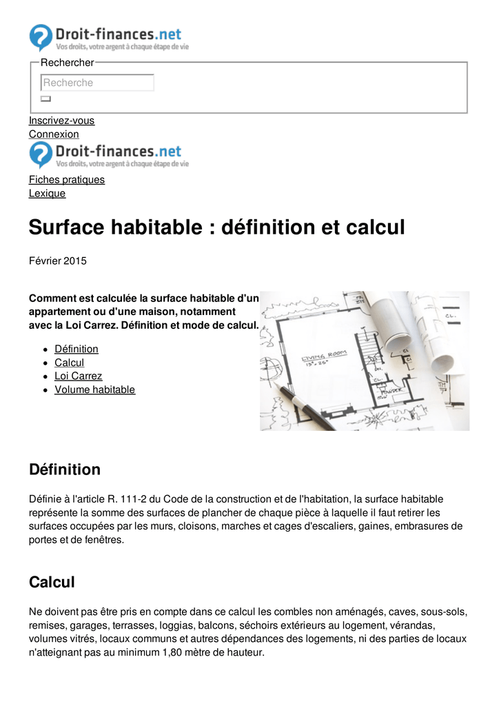 Rechercher Recherche Inscrivez-vous Connexion Fiches pratiques Lexique Surface habitable : définition et calcul Février 2015 Comment est calculée la surface habitable d'un appartement ou d'une maison, notamment avec la Loi Carrez. Définition et mode de calcul. Définition Calcul Loi Carrez Volume habitable Définition Définie à l'article R. 111-2 du Code de la construction et de l'habitation, la surface habitable représente la somme des surfaces de plancher de chaque pièce à laquelle il faut retirer les surfaces occupées par les murs, cloisons, marches et cages d'escaliers, gaines, embrasures de portes et de fenêtres. Calcul Ne doivent pas être pris en compte dans ce calcul les combles non aménagés, caves, sous-sols, remises, garages, terrasses, loggias, balcons, séchoirs extérieurs au logement, vérandas, volumes vitrés, locaux communs et autres dépendances des logements, ni des parties de locaux n'atteignant pas au minimum 1,80 mètre de hauteur. Pour procéder avec précision au calcul de votre surface habitable, il est conseillé de faire appel à l'intervention d'un géomètre. Loi Carrez En dehors de la Loi Carrez, qui oblige à mentionner la surface habitable dans les avants-contrats de vente de lots de copropriété, cette notion est également utile dans le cadre des dispositifs fiscaux d'aides aux investissements locatifs (Scellier, Borloo, etc.) qui comportent souvent un plafond de loyer au mètre carré. Volume habitable La surface habitable ne doit pas être confondue avec le volume habitable. Mais leurs règles de calcul sont liées, puisque le volume habitable se calcule en multipliant la surface habitable par les hauteurs sous plafond. La surface habitable est exprimée en m2, tandis que le volume habitable est calculé en m3. Voir aussi Surface hors oeuvre Surface utile Réalisé en collaboration avec des professionnels du droit et de la finance, sous la direction d'Eric Roig, diplômé d'HEC Ce document intitulé « Surface habitable : définition et calcul » issu de Droit-Finances (droitfinances.commentcamarche.net) est soumis au droit d'auteur. Toute reproduction ou représentation totale ou partielle de ce site par quelque procédé que ce soit, sans autorisation expresse, est interdite. Les articles les plus lus Calcul de l'impôt 2015 Chômage : les délais de carence Calculer les droits de succession La rupture conventionnelle Le barème kilométrique 2015 Smic : taux horaire et montant mensuel Comment faire une donation Le certificat de non-gage Dossier à la une Guide pratique des Donations & Successions Transmission du patrimoine : tout ce qu'il faut savoir Nos conseils sur Barème des pensions alimentaires Palmarès de l'assurance-vie Formalités et décès Les indemnités de licenciement Le barème kilométrique 2015 La donation-partage Faire une donation Permis : barème des retraits de points CESU, mode d'emploi Le congé d'adoption Créer une association Rédiger un testament Créer sa société Accre et création d'entreprise Notre lexique juridique Dictionnaire du droit : tous les mots-clés de A à Z. En pratique L'assurance-vie Contrat de location Décès : les formalités Divorce : la procédure Donation au dernier vivant Entrepreneur individuel Extrait Kbis : commande en ligne Le contrat d'avenir Le certificat de non-gage Le licenciement économique Le solde de tout compte Micro entreprise Pacs : formalités et obligations Pajemploi : garde d'enfant Prime à la naissance Récupération des points du permis Préavis et location Rupture conventionnelle Salaire brut et salaire net SCI : tous les avantages Le statut de la Sarl Tous nos modèles de lettres Location, justice, banque, assurances, vacances, formalités, consommation, ...