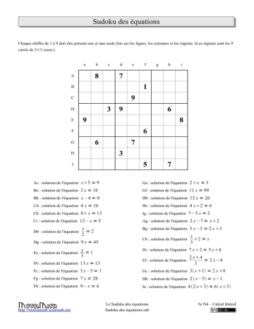 Sudoku des équations Chaque chiffre de 1 à 9 doit être présent une et une seule fois sur les lignes, les colonnes et les régions. (Les régions sont les 9 carrés de 3×3 cases.) a b c 8 A d e g h i 7 1 B 9 C 3 D E f 9 6 9 8 6 F 6 G 7 3 H 5 I 7 Ac : solution de l'équation x5 = 9 Ga : solution de l'équation 2x = 3 Be : solution de l'équation 3 x = 18 Gf : solution de l'équation Bh : solution de l'équation x – 4 = 0 Cd : solution de l'équation 4 x = 16 Ch : solution de l'équation 8 x = 13 Ci : solution de l'équation Db : solution de l'équation 12− x = 5 x =2 2 Dg : solution de l'équation 9 x = 45 Ee : solution de l'équation Fb : solution de l'équation x =1 3 13 x = 13 Fc : solution de l'équation 3 x – 5 = 1 Fg : solution de l'équation 7 x = 28 Fh : solution de l'équation 9− x = 6 http://mutuamath.sesamath.net 11 x = 99 Hb : solution de l'équation 13 x = 26 He : solution de l'équation 4 x2 = 6 Ig : solution de l'équation 7−5 x = 2 Ag : solution de l'équation 2 x −7 = x2 Bg : solution de l'équation 5 x−3 = 2 x 3 Cb : solution de l'équation x 2 = x 3 Di : solution de l'équation 7 x2 = 5 x4 Ef : solution de l'équation 2 x4 = 2 x−4 3 Gc : solution de l'équation 3 x 1 = 2 x 8 Hh : solution de l'équation 2 x−5 = x−1 Ia : solution de l'équation Le Sudoku des équations Sudoku des équations.odt 4 2 x3 = 6 x3 5e N4 – Calcul littéral Sudoku des équations Chaque chiffre de 1 à 9 doit être présent une et une seule fois sur les lignes, les colonnes et les régions. (Les régions sont les 9 carrés de 3×3 cases.) a b c d e f 1 C 3 5 4 5 F 7 5 6 9 3 H 4 I Ae : solution de l'équation x3 = 5 3 x = 21 Bf : solution de l'équation x – 8 = 0 Cd : solution de l'équation 8 7 D Bb : solution de l'équation i 9 B G h 3 A E g 4 x = 28 Cg : solution de l'équation 8 x = 13 Gc : solution de l'équation 2x = 8 Gh: solution de l'équation 11 x = 44 Hd : solution de l'équation 6 x = 36 Hf : solution de l'équation 4 x2 = 30 Ie : solution de l'équation 7−5 x = 2 Db : solution de l'équation 12− x = 8 Ac : solution de l'équation Dd : solution de l'équation x =1 2 Ch : solution de l'équation 5 x−3 = 2 x 3 Di : solution de l'équation 5 x = 45 De : solution de l'équation 2 x −7 = x−2 x 2 = x 3 Ec : solution de l'équation 13 x = 26 Ed: solution de l'équation Ee : solution de l'équation x =3 3 Fb : solution de l'équation 2 x6 = 2 x −10 3 Gi : solution de l'équation 3 x 1 = 2 x 5 He : solution de l'équation 2 x−1 = x2 Ei : solution de l'équation 3 x – 5 = 4 Fa : solution de l'équation 7 x = 21 Fg : solution de l'équation 9− x = 7 http://mutuamath.sesamath.net Ib : solution de l'équation Le Sudoku des équations Sudoku des équations.odt 7 x2 = 6 x10 4 2 x−3 = 7 x−1 5e N4 – Calcul littéral Scénario d'usage Phase Rôle du professeur collective Distribution des grilles. (Les voisins ont des grilles différentes.) Rappel du principe du Sudoku, explications sur la manière dont la grille est repérée et résolution des premières équations à titre d'exemple. 5' S'assure que tous les élèves entrent dans l'activité et Compléter la grille. dépannent ceux qui sont coincés. Les élèves ayant terminés sont invités à aider leur voisin. 20' Affichage de la grille correction 5' individuelle en groupe http://mutuamath.sesamath.net Tâche de l'élève Correction de sa grille Le Sudoku des équations Sudoku des équations.odt durée 5e N4 – Calcul littéral Projet MutuaMath : http://mutuamath.sesamath.net Copyright (c) 2009 Auteur original : Noël Debarle. Ce document est sous licence Creative commons : http://creativecommons.org/licenses/by-sa/2.0/fr/ Vous êtes libre de reproduire, distribuer, communiquer cette création au public, de modifier cette création à condition de citer le nom de l'auteur original et l'adresse du site Mutuamath. Si vous modifiez, transformez ou adaptez cette création, vous n'avez le droit de distribuer la création qui en résulte que sous un contrat identique à celui-ci. Côté professeur Fiche Mutuamath : http://mutuamath.sesamath.net/node/261 Fiche d'identification : Objectifs : Initiation à la résolution d'équations. Prérequis : Savoir ce que signifie « tester une égalité ». Base du calcul littéral. Intentions : Cet exercice a essentiellement pour but d'entrainer les élèves à tester des égalités et à résoudre des équations simples rapidement. Il est présenté dans le cadre du sudoku de manière à ce que son caractère répétitif soit moins rébarbatif et pour permettre à l'élève de s'auto-corriger. L'activité en détail : Les équations sont choisies de manière à ce que les calculs soient simples. Il n'y a pas de calculs avec des nombres relatifs et les calculs fractionnaires amènent toujours à un nombre entier. Les équations sont données en deux séries. Dans la première série, il n'y a qu'un membre à calculer pour tester l'égalité. Les équations peuvent se résoudre simplement de tête. Les résultats de la première série suffisent pour compléter le sudoku. La deuxième série (avec second membre à calculer) peut donc être utilisée seulement pour ou pour se débloquer dans le « remplissage » du sudoku. Les prolongements : Un exercice du même genre avec des nombres allant de -4 à 4 de manière à utiliser des calculs sur les nombres relatifs est proposé ici : http://mutuamath.sesamath.net/node/271 http://mutuamath.sesamath.net Le Sudoku des équations Sudoku des équations.odt 5e N4 – Calcul littéral Correction http://mutuamath.sesamath.net a b c d e f g h i A 2 8 4 7 5 3 9 1 6 B 5 7 9 8 6 1 2 4 3 C 6 3 1 4 9 2 8 5 7 D 8 4 3 9 2 7 5 6 1 E 9 5 6 1 3 4 7 2 8 F 7 1 2 5 8 6 4 3 9 G 1 6 5 2 7 9 3 8 4 H 4 2 7 3 1 8 6 9 5 I 3 9 8 6 4 5 1 7 2 a b c d e f g h i A 6 8 5 1 2 4 3 9 7 B 2 7 3 9 5 8 6 1 4 C 4 1 9 7 6 3 5 2 8 D 1 4 7 2 3 6 8 5 9 E 5 6 2 8 9 1 4 7 3 F 3 9 8 4 7 5 2 6 1 G 7 3 6 5 8 9 1 4 2 H 8 2 1 6 4 7 9 3 5 I 9 5 4 3 1 2 7 8 6 Le Sudoku 