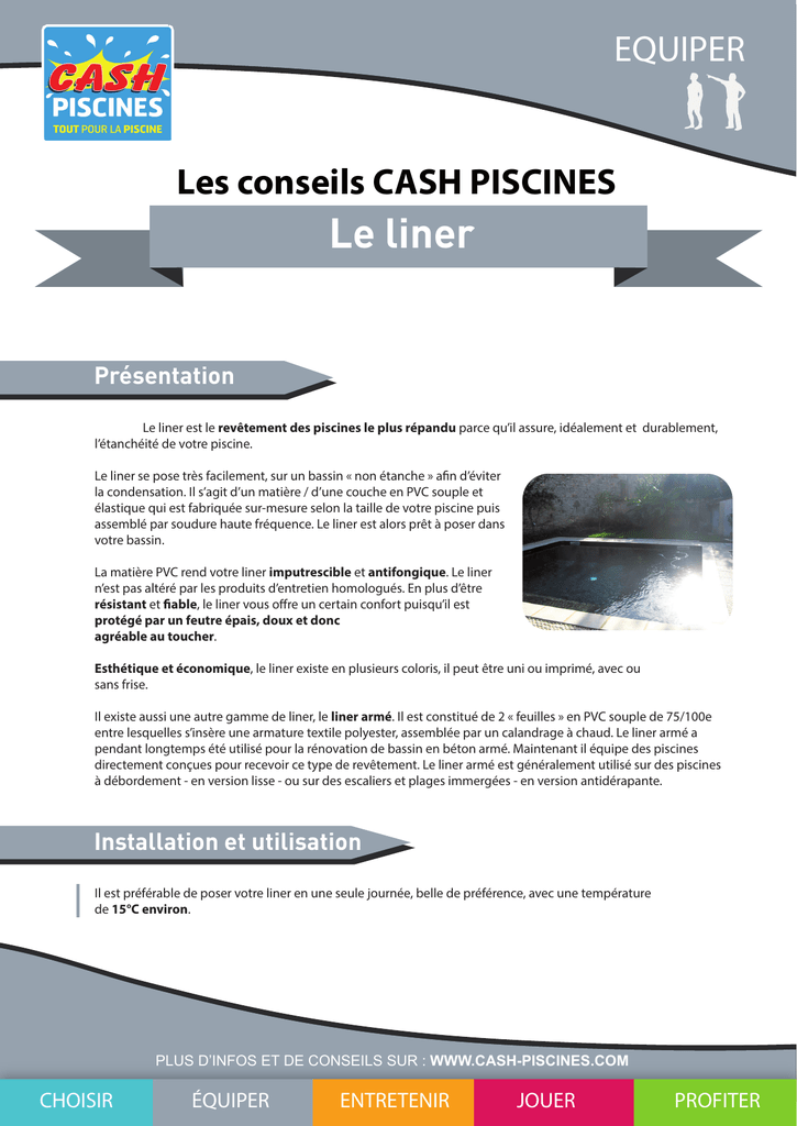 EQUIPER Les conseils CASH PISCINES Le liner Présentation Le liner est le revêtement des piscines le plus répandu parce qu’il assure, idéalement et durablement, l’étanchéité de votre piscine. Le liner se pose très facilement, sur un bassin « non étanche » afin d’éviter la condensation. Il s’agit d’un matière / d’une couche en PVC souple et élastique qui est fabriquée sur-mesure selon la taille de votre piscine puis assemblé par soudure haute fréquence. Le liner est alors prêt à poser dans votre bassin. La matière PVC rend votre liner imputrescible et antifongique. Le liner n’est pas altéré par les produits d’entretien homologués. En plus d’être résistant et fiable, le liner vous offre un certain confort puisqu’il est protégé par un feutre épais, doux et donc agréable au toucher. Esthétique et économique, le liner existe en plusieurs coloris, il peut être uni ou imprimé, avec ou sans frise. Il existe aussi une autre gamme de liner, le liner armé. Il est constitué de 2 « feuilles » en PVC souple de 75/100e entre lesquelles s’insère une armature textile polyester, assemblée par un calandrage à chaud. Le liner armé a pendant longtemps été utilisé pour la rénovation de bassin en béton armé. Maintenant il équipe des piscines directement conçues pour recevoir ce type de revêtement. Le liner armé est généralement utilisé sur des piscines à débordement - en version lisse - ou sur des escaliers et plages immergées - en version antidérapante. Installation et utilisation Il est préférable de poser votre liner en une seule journée, belle de préférence, avec une température de 15°C environ. PLUS D’INFOS ET DE CONSEILS SUR : WWW.CASH-PISCINES.COM CHOISIR ÉQUIPER ENTRETENIR JOUER PROFITER EQUIPER Les étapes pour la pose de votre liner « classique » : • dérouler le liner au fond du bassin et le laisser pendant 30 mn à 1h pour le rendre plus malléable • commencer la pose par les angles du petit bain qui sont le plus souvent repérés sur le liner. Pour accrocher le liner, il suffit d’emboîter bien à fond le profil mâle dans le profil femelle • avancer ensuite progressivement en faisant le tour de la piscine. S’assurer que les angles soient bien placés (c’est très important), et que la forme du liner se prête bien à la forme de la piscine, le petit bain et le grand bain • une fois terminé l’accrochage du liner, il faut mettre en service votre aspirateur qui fera le vide d’air entre la paroi de la piscine et le liner, lequel au bout de quelques minutes viendra se plaquer sur les parois • il faudra le laisser en fonctionnement tout le temps du remplissage sans jamais l’arrêter même si le remplissage est interrompu Pour le liner armé, il n’est pas livré aux côtes de votre bassin mais en rouleau de 25 m de long avant d’être découpé en lés sur le chantier. La pose du liner armé, qui demande un peu d’expérience et de savoir-faire, permet de s’adapter à toutes les formes de piscine y compris les plus complexes. Le liner armé permet généralement la rénovation ou la réalisation de nombreuses piscines publiques. Le liner armé est adapté à tous types et supports de piscine : béton armé, agglos maçonnés ou blocs polystyrène, panneaux industrialisés ; ou sur d’anciens revêtements carrelage, enduit, peinture, polyester... Selon la qualité et le niveau d’usure de la surface de contact, le fond et les parois du bassin peuvent être recouverts au préalable d’un feutre de protection pour absorber les petites aspérités et augmenter le confort (voir Fiche conseils sur la mousse de protection - sous couche liner). Dans tous les cas, le support ne doit jamais être totalement étanche afin de permettre l’élimination de la condensation. Recommandations et précautions Le liner armé est plus adapté aux piscines chauffées. Ce qui justifie son application sur des piscines d’intérieur, des bassins de rééducation ou de remise en forme. PLUS D’INFOS ET DE CONSEILS SUR : WWW.CASH-PISCINES.COM CHOISIR ÉQUIPER ENTRETENIR JOUER PROFITER