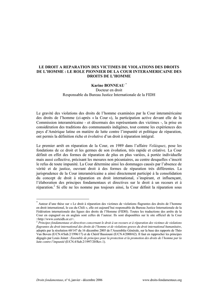 LE DROIT A REPARATION DES VICTIMES DE VIOLATIONS DES DROITS DE L’HOMME : LE ROLE PIONNIER DE LA COUR INTERAMERICAINE DES DROITS DE L’HOMME Karine BONNEAU * Docteur en droit Responsable du Bureau Justice Internationale de la FIDH Le gravité des violations des droits de l’homme examinées par la Cour interaméricaine des droits de l’homme (ci-après « la Cour »), la participation active devant elle de la Commission interaméricaine - et désormais des représentants des victimes -, la prise en considération des traditions des communautés indigènes, tout comme les expériences des pays d’Amérique latine en matière de lutte contre l’impunité et politique de réparation, ont permis la définition riche et évolutive d’un droit à réparation intégral. Le premier arrêt en réparation de la Cour, en 1989 dans l’affaire Velázquez, pose les fondations de ce droit et les germes de son évolution, très rapide et créative. La Cour définit en effet des formes de réparation de plus en plus variées, à portée individuelle mais aussi collective, précisant les mesures non pécuniaires, au centre desquelles s’inscrit le refus de toute impunité. La Cour détermine ainsi les dommages causés par l’absence de vérité et de justice, ouvrant droit à des formes de réparation très différentes. La jurisprudence de la Cour interaméricaine a ainsi directement participé à la consolidation du concept de droit à réparation en droit international, s’inspirant, et influençant, l’élaboration des principes fondamentaux et directives sur le droit à un recours et à réparation.2 Si elle ne les nomme pas toujours ainsi, la Cour définit la réparation sous * Auteur d’une thèse sur « Le droit à réparation des victimes de violations flagrantes des droits de l’homme en droit international, le cas du Chili », elle est aujourd’hui responsable du Bureau Justice Internationale de la Fédération internationale des ligues des droits de l’Homme (FIDH). Toutes les traductions des arrêts de la Cour en espagnol ou en anglais sont celles de l’auteur. Ils sont disponibles sur le site officiel de la Cour <http://www.corteidh.or.cr>. 2 Principes fondamentaux et directives concernant le droit à un recours et à réparation des victimes de violations flagrantes du droit international des droits de l’homme et de violations graves du droit international humanitaire, adoptés par la résolution 60/147 du 16 décembre 2005 de l’Assemblée Générale, sur la base des rapports de Théo Van Boven (E/CN.4/Sub.2/1996/17) et de Chérif Bassiouni (E/CN.4/2000/62). Il faut en rapprocher les principes dégagés par Louis Joinet : Ensemble de principes pour la protection et la promotion des droits de l’homme par la lutte contre l’impunité (E/CN.4/Sub.2/1997/20/Rev.1). Droits fondamentaux, n° 6, janvier - décembre 2006 www.droits-fondamentaux.org 2 (prov.) Karine BONNEAU toutes ses formes : la restitution, l’indemnisation, la réadaptation ou réhabilitation, la satisfaction et les garanties de non renouvellement. OBSERVATIONS PRELIMINAIRES : FONDEMENT JURIDIQUE, CONCEPT ET PROCEDURE DU DROIT A REPARATION Avant d’examiner les différentes formes de réparation définies par la Cour, il importe d’étudier les fondements de ce droit et ses procédures, y compris de mise en œuvre, devant la Cour. Leur définition vise avant tout l’effectivité du droit à réparation des victimes3. A. - Fondement juridique La Cour tire sa compétence de l’art. 63.1 de la Convention. : « Lorsqu'elle reconnaît qu'un droit ou une liberté protégés par la présente convention ont été violés, la cour ordonnera que soit garantie à la partie lésée la jouissance du droit ou de la liberté enfreints. Elle ordonnera également, le cas échéant, la réparation des conséquences de la mesure ou de la situation à laquelle a donné lieu la violation de ces droits et le paiement d'une juste indemnité de la partie lésée ». L’obligation de réparation est ainsi entendue au sens large et non seulement en terme pécuniaire. En référence à l’affaire de l’usine de Chorzów, et à la sentence arbitrale de Max Huber dans l’affaire des biens britanniques au Maroc espagnol, la Cour affirme le caractère automatique et la valeur coutumière du droit à réparation en droit international : « L’article 63-1 codifie une règle de droit international coutumier, l’un des principes fondamentaux du droit international contemporain relatif à la responsabilité des États. Tout fait illicite imputable à un État engage sa responsabilité internationale pour violation d’une règle internationale et entraîne l’obligation consécutive de réparation et de faire cesser les conséquences de la violation ».4 L’obligation de réparation doit être définie en droit international : « tous les aspects (portée, nature, modalités et identification des bénéficiaires) sont définis en droit international, [elle] ne peut être modifiée par l’État qui invoquerait les dispositions de son 3 Pour la problématique de la réparation dans le cadre du droit international public, cf. le colloque du Mans de la SFDI sur La responsabilité dans le système international, Paris, Pedone, 1991, notamment Gérard CohenJonathan, « responsabilité pour atteinte aux droits de l’homme » et Emmanuel Decaux, « responsabilité et réparation ». 4 Arrêts Velásquez c. Honduras (réparation), Série C n° 7, 21 juillet 1989, § 25 ; El Amparo c. Venezuela (réparation), Série C n° 28, 14 septembre 1996, § 14 ; Cantoral Hermani c. Pérou, Série C n° 167, 17 juillet 2007, § 156. Droits fondamentaux, n° 6, janvier - décembre 2006 www.droits-fondamentaux.org Le droit à réparation des victimes de violations des droits de l’homme […] 3 (prov.) droit interne ».5 Obligation indépendante, l’obligation de réparation résulte aussi de l’obligation des États de respecter et de garantir 