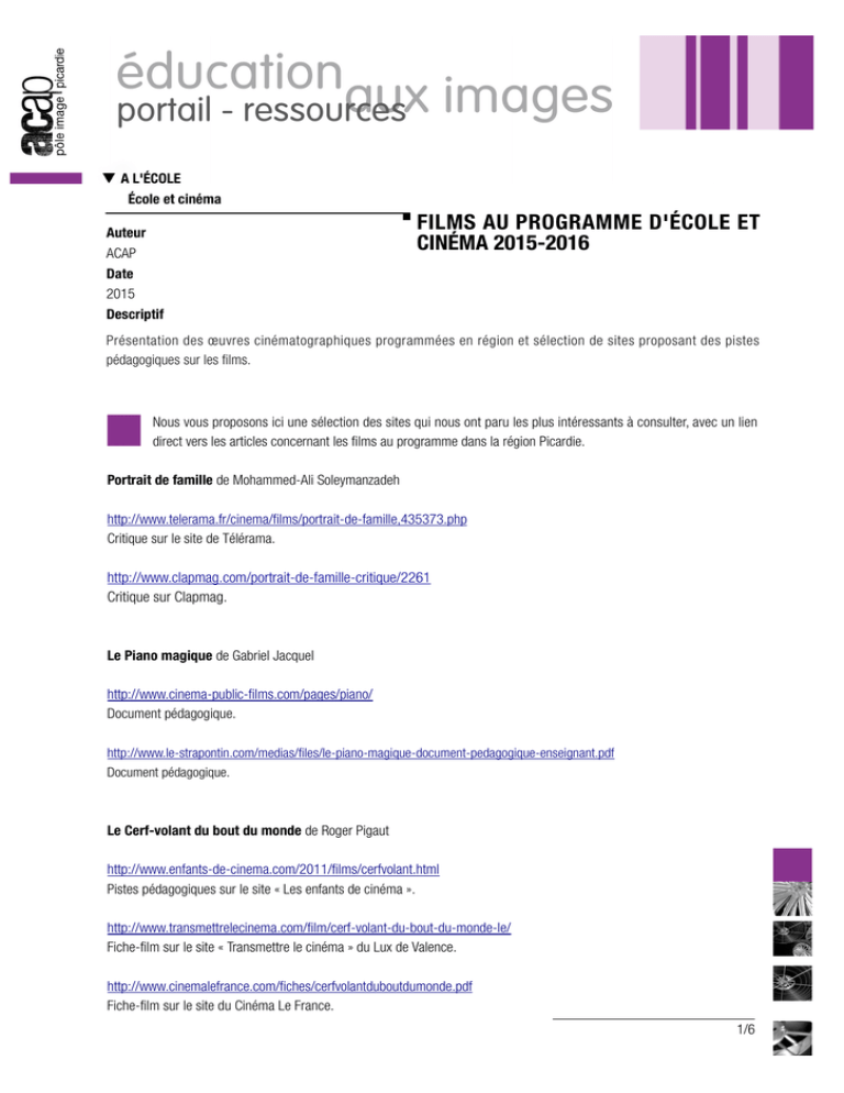 A L'ÉCOLE École et cinéma Auteur ACAP Date 2015 Descriptif FILMS AU PROGRAMME D'ÉCOLE ET CINÉMA 2015-2016 Présentation des œuvres cinématographiques programmées en région et sélection de sites proposant des pistes pédagogiques sur les films. Nous vous proposons ici une sélection des sites qui nous ont paru les plus intéressants à consulter, avec un lien direct vers les articles concernant les films au programme dans la région Picardie. Portrait de famille de Mohammed-Ali Soleymanzadeh http://www.telerama.fr/cinema/films/portrait-de-famille,435373.php Critique sur le site de Télérama. http://www.clapmag.com/portrait-de-famille-critique/2261 Critique sur Clapmag. Le Piano magique de Gabriel Jacquel http://www.cinema-public-films.com/pages/piano/ Document pédagogique. http://www.le-strapontin.com/medias/files/le-piano-magique-document-pedagogique-enseignant.pdf Document pédagogique. Le Cerf-volant du bout du monde de Roger Pigaut http://www.enfants-de-cinema.com/2011/films/cerfvolant.html Pistes pédagogiques sur le site « Les enfants de cinéma ». http://www.transmettrelecinema.com/film/cerf-volant-du-bout-du-monde-le/ Fiche-film sur le site « Transmettre le cinéma » du Lux de Valence. http://www.cinemalefrance.com/fiches/cerfvolantduboutdumonde.pdf Fiche-film sur le site du Cinéma Le France. 1/6 http://www.lesamisducinema.net/ecole-cinema/cerf-volant/ Dossiers pédagogiques sur le site « Les amis du cinéma ». http://www.ac-versailles.fr/public/upload/docs/application/pdf/2012-10/le_cerf-volant_du_bout_du_monde.pdf Pistes pédagogiques sur le site de l'Académie de Versailles. Le Cheval venu de la mer de Mike Newell http://www.enfants-de-cinema.com/2011/films/cheval.html Pistes pédagogiques sur le site « Les enfants de cinéma ». http://www.transmettrelecinema.com/film/cheval-venu-de-la-mer-le/ Fiche-film sur le site « Transmettre le cinéma » du Lux de Valence. http://www.cinemalefrance.com/fiches/Chevalvenudelamer.pdf Fiche-film sur le site du Cinéma Le France. http://www2.ac-lyon.fr/enseigne/arts-culture/IMG/pdf/Dossier_Le_cheval_venu_de_la_mer-2.pdf Pistes pédagogiques sur le site de l'Académie de Lyon. http://www.ac-versailles.fr/public/upload/docs/application/pdf/2012-10/le_cheval_venu_de_la_mer.pdf Pistes pédagogiques sur le site de l'Académie de Versailles. La Prisonnière du désert de John Ford http://www.enfants-de-cinema.com/2011/films/prisonniere-desert.html Pistes pédagogiques sur le site « Les enfants de cinéma ». http://www.transmettrelecinema.com/film/prisonniere-du-desert-la/ Fiche-film sur le site « Transmettre le cinéma » du Lux de Valence. http://www.cinemalefrance.com/fiches/prisonieredudesert.pdf Fiche-film sur le site du Cinéma Le France. http://www.cineclubdecaen.com/realisat/ford/prisonnieredudesert.htm Pistes pédagogiques sur le site du Ciné-club de Caen. http://www.crdp-strasbourg.fr/main2/ecole_elementaire/cinema/documents/livret_prisonniere_%20desert.pdf Livret pédagogique sur le site du CRDP de Strasbourg. http://www2.ac-lyon.fr/enseigne/arts-culture/IMG/pdf/La_prisonniere_du_desert.pdf Pistes pédagogiques sur le site de l'Académie de Lyon. 2/6 Une Vie de chat de Alain Gagnol et Jean-Loup Felicioli http://www.enfants-de-cinema.com/2011/films/une-vie-de-chat.html Pistes pédagogiques sur le site « Les enfants de cinéma ». http://www.transmettrelecinema.com/film/une-vie-de-chat/ Fiche-film sur le site « Transmettre le cinéma » du Lux de Valence. http://www.cnc.fr/web/fr/ecole-et-cinema1/-/ressources/5297212 Dossier pédagogique sur le site du Centre national du cinéma et de l'image animée. http://uneviedechat.crdp-lyon.fr/ Site d'accompagnement pédagogique du film. http://www.les-ecrans.org/wp-content/uploads/2013/02/Dossier-p%C3%A9dagogique-Une-vie-de-chat.pdf Dossier pédagogique. http://ww2.ac-poitiers.fr/ia86-pedagogie/IMG/pdf/dossier_pedagogique_une_vie_de_chat.pdf Dossier pédagogique sur le site de l'Académie de Poitiers. http://www.cinehorloge.fr/IMG/pdf/1016-10013-1-vie_de_chat.pdf Fiche pédagogique. Les pionniers du cinéma – Programme de courts-métrages http://www.enfants-de-cinema.com/2011/films/pionniers-cinema.html Pistes pédagogiques sur le site « Les enfants de cinéma ». http://www.transmettrelecinema.com/film/les-pionniers-du-cinema/ Fiche-film sur le site « Transmettre le cinéma » du Lux de Valence. http://www.cnc.fr/web/fr/ecole-et-cinema1/-/ressources/5306955 Dossier pédagogique sur le site du Centre national du cinéma et de l'image animée. http://ww2.ac-poitiers.fr/ia86-pedagogie/IMG/pdf/les_pionniers_du_cinema.pdf Pistes pédagogiques. http://ressources.acap-cinema.com/files/form_films_e&c_2014:a.dubois:2.pdf Synthèse d’une formation sur le Portail-ressources de l’Acap - Pôle Image Picardie. Jour de fête de Jacques Tati http://www.enfants-de-cinema.com/2011/films/jour-de-fete.html Pistes pédagogiques sur le site « Les enfants de cinéma ». 3/6 http://www.transmettrelecinema.com/film/jour-de-fete/ Fiche-film sur le site « Transmettre le cinéma » du Lux de Valence. http://www.cinemalefrance.com/fiches/Jourdefete.pdf Fiche-film sur le site du Cinéma Le France. http://www.ac-clermont.fr/ia03/pedagogie/ressources/AP/ecole-cinema/Fiche-pedagogique-jour_de_fete.pdf Fiche pédagogique sur le site de l'Académie de Clermont-Ferrand. http://ia89.ac-dijon.fr/docs/av/ec08-09/jour_de_fete.pdf Fiche pédagogique sur le site de l'Académie de Dijon. http://lewebpedagogique.com/educationimage42/files/2011/01/DocJourdeFete.pdf Pistes d'exploitation pédagogique. http://ww2.ac-poitiers.fr/ia16-pedagogie/IMG/pdf/jour_de_fete_dossier_pedagogique.pdf Dossier pédagogique. Ponyo sur la falaise d'Hayao Miyazaki http://www.enfants-de-cinema.com/2011/films/ponyo.html Pistes pédagogiques sur le site « Les enfants de cinéma ». http://www.transmettrelecinema.com/film/ponyo-sur-la-falaise/ Fiche-film sur le site « Transmettre le cinéma » du Lux de Valence. http://www.cinem