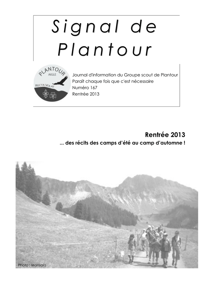 Signal de Plantour Journal d'information du Groupe scout de Plantour Paraît chaque fois que c'est nécessaire Numéro 167 Rentrée 2013 Rentrée 2013 ... des récits des camps d’été au camp d’automne ! Photo : Mansala Sommaire Impressum Mémo ..............................................................................2! Edito du CG ....................................................................3! Ce numéro a été rédigé, mis en page et imprimé par le Groupe de Plantour. Camp de groupe .........................................................4! Camp 1ère branche, …..................................................6! Ronde des Hirondelles et Meute Chikaï......................7! Délai de rédaction du no 168 : 27 octobre Camp 2ème branche......................................................7! Troupes Okazou et Plantour .........................................9! Camp 3ème branche....................................................10! Camp 4ème branche....................................................11! Agenda.........................................................................16! Mémo Responsable du Groupe et présidente du comité Florence Dondénaz (Ibis) Av. de Belmont 37 1009 Pully 079 726 43 55 [email protected] Amicale des Anciens de Plantour Responsable des lutins Aloys Christinat (Noctule) Champillon 1863 Le Sépey 024 499 11 36 – 079 584 06 25 [email protected] Responsable des éclaireuses Bastien Cheseaux (Vison) Rte d’Evian 32 1860 Aigle 024 466 35 83 – 079 363 68 85 [email protected] Responsable des PiCo's Romain Oguey (Loutre) Ch. des Charmettes 11 1860 Aigle 024 466 57 20 – 077 443 68 07 [email protected] Responsable des louveteaux Aloys Christinat (Noctule) Champillon 1863 Le Sépey 024 499 11 36 – 079 584 06 25 [email protected] Responsable des éclaireurs Bastien Cheseaux (Vison) Rte d’Evian 32 1860 Aigle 024 466 35 83 – 079 363 68 85 [email protected] Personne de contact du Clan: Killian Anex (Tortue) Rue des Maisons-Neuves 14 1853 Yvorne 024 466 48 41 – 077 455 96 24 [email protected] Caissier Sylvain Oguey (Lynx) Ch. des Charmettes 11 1860 Aigle 024 466 57 20 Compte: CCP 18-2023-6 Economat Angela Des Boscs Ch. de Verchiez 2 1860 Aigle 024 466 10 05 [email protected] Représentant des parents Jean-François Begon Ch. du Raisin 3 1867 Ollon 024 499 13 29 Fondation Immobilière, FIP Case postale 224 1860 Aigle Compte: BCV CO H 5084.25.91 Rédaction du Signal de Plantour Marc Butticaz (Pika) Ch. des Pommiers 2 A 1860 Aigle 079 298 47 76 [email protected] Mise en page du Signal Christine Oguey (Musaraigne) Ch. des Charmettes 11 1860 Aigle 024 466 57 20 [email protected] Site Internet : www.plantour.ch Page 2 P.a. Christian Cart (Hérisson) Rue Principale 62A 1905 Dorénaz 079 429 22 13 [email protected] Edito du CG Et voilà, après de belles journées ensoleillées, quelques orages épars, des aventures incroyables vécues en camp et quelques coups de soleil, l’été touche à sa fin. Serezvous comme la cigale, fort dépourvue quand la bise fut venue ? Nous pensons pouvoir vous assurer que ce ne sera pas le cas au vu du programme qui vous attend ! Tout d’abord, après les camps d’été, nous avons pu vivre les changements d’unité lors de la journée des passages du samedi 24 août ! C’était aussi l’occasion de remercier plusieurs responsables ayant quitté leur unité après un long et fidèle engagement pour le groupe ! Alors profitons encore de cet édito pour adresser à nouveau un grand, énorme, « M-E-R-C-I mercimercimerci !!! M-E-R-C-I mercimercimerci !!! M-E-R-C-I mercimercimerci !!! M !!! » à Albatros, Pélican et Briard pour leur entrain, leur motivation et leur travail passionné tout au long des années ! Nous nous réjouissons déjà de retrouver Briard dans la maîtrise du Poste et nous accueillons également avec beaucoup de plaisir Margay (Michaël Naef) dans la maîtrise première branche ! Bienvenue à lui, nous nous réjouissons de son énergie pour notre maîtrise ! Après ces changements de fin d’été, la deuxième branche poursuivra l’année scolaire par Gondwana, un grand jeu de rôle mettant en scène plusieurs peuples s’affrontant dans des quêtes diverses, qui aura lieu du samedi 14 au lundi 16 septembre. Les personnes inscrites trouveront les informations utiles dans la circulaire jointe. N’oublions pas l’événement qui réunira tout le groupe de Plantour du 23 au 27 octobre à la Forclaz (VD) : le camp de groupe où vous aurez l’occasion de découvrir des activités aussi variées que les chefs qui vous les auront concoctées ! Les indications nécessaires pour cet événement vous sont communiquées en page 4. Vite, vite ! Il est encore possible de s’inscrire et nous avons besoin de remplir le chalet pour ce camp extraordinaire ! Sans omettre toutes les activités que vous vivrez dans vos unités, pour lesquelles nous vous laissons découvrir les thèmes alléchants dans les pages de vos unités ! En espérant que vous aurez passé un bon été et au plaisir de vous retrouver en pleine forme prochainement ! Bonne Poignée de Main Gauche, La maîtrise de groupe, Choucas, Pika et Ibis Page 3 Camp de groupe : Des loups-garous aux Ormonts ? Chères citoyennes et citoyens des hameaux des Echenards, d’Exergillod, de Cergnat, du Pont de la Tine, des Voëttes et du Rosex-d’en-Bas... Il y a urgence ! Lors de mon dernier courrier, je vous ai averti de phénomènes étranges ayant lieu durant les nuits de pleine lune. Certains de nos citoyens ont bel et bien disparu ou ont depuis adopté un comportement bien étrange... Le mot est sur toutes les lèvres de la vallée des Ormonts... des loups-garous !! Oui, je crois que cette fois il n’y a plus aucun doute. Plusieurs témoignages concordent. Autant mon ami Jean-Do de Genève que notre postière Marie Pernet (dite Redzi) ont vu des signes inquiétants... Et notre médecin Jean-Pas’ Tille a examiné plusieurs citoyens p