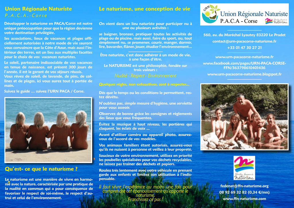 Union Régionale Naturiste Le naturisme, une conception de vie P.A.C.A.-Corse Développer le naturisme en PACA/Corse est notre unique préoccupation pour que la région devienne votre destination privilégiée. Ses associations, lieux de vacances et plages officiellement autorisées à notre mode de vie sauront vous convaincre que la Côte d’Azur, mais aussi l’intérieur des terres, est un lieu aux multiples facettes pour le choix de vos vacances naturistes. Le soleil, partenaire indissociable de vos vacances en tenue de naissance, est présent 300 jours de l’année, il est le garant de vos séjours réussis. Vous rêvez de soleil, de lavande, de pins, de collines et de plages, ici vous aurez tout à portée de main. Suivez le guide … suivez l’URN PACA / Corse. On vient dans un lieu naturiste pour participer nu à une ou plusieurs activités : se baigner, bronzer, pratiquer toutes les activités de plage ou de piscine, mais aussi, faire du sport, ou, tout simplement nu, se promener, courir, manger, dormir, lire, bavarder, flâner, jouer, étudier l’environnement... 560, av. du Maréchal Lyautey 83220 Le Pradet Être naturiste, c’est donc adhérer à un mode de vie, à une façon d’être. www.urn-pacacorse-naturisme.fr Le NATURISME est une philosophie, fondée sur trois valeurs : Nudité - Respect - Environnement [email protected] +33 01 47 30 27 21 www.facebook.com/pages/URN-PACA-CORSEFFN/363798610401436 www.urn-pacacorse-naturisme.blogspot.fr Quelques règles, non exhaustives, sont à respecter... Dès que le temps ou les conditions le permettent, restez dévêtu. N’oubliez pas, simple mesure d’hygiène, une serviette pour vous asseoir. Observez de bonne grâce les consignes et règlements des lieux que vous fréquentez. Évitez la musique à haut niveau, les portières qui claquent, les éclats de voix ... Avant d’utiliser caméra ou appareil photo, assurezvous de l’accord de vos modèles. Vos animaux familiers étant autorisés, assurez-vous qu’ils ne nuisent à personne et veillez à leur propreté. Qu’est- ce que le naturisme ? Le naturisme est une manière de vivre en harmonie avec la nature, caractérisée par une pratique de la nudité en commun qui a pour conséquence de favoriser le respect de soi-même, le respect d’autrui et celui de l’environnement. Soucieux de votre environnement, utilisez en priorité les poubelles spécialisées pour vos déchets recyclables, ne laissez pas traîner des déchets et papiers. Roulez très lentement avec votre véhicule en prenant garde aux enfants et limitez son utilisation à l’indispensable. Il faut vivre l’expérience au moins une fois pour comprendre cet épanouissement qu’apporte le naturisme. Franchissez ce pas ! [email protected] 08 92 69 32 82 (0,34 €/mn) www.ffn-naturisme.com Clubs adhérents 1 Amicale de la Plage Naturiste des Vieux Salins de Hyères (APNVSH) 37 A, les Villas de Costebelle , 380 route de l’Almanarre - 83400 HYERES. Contact : François Camacho Tél : 06 63 61 29 66 E-mail : [email protected] Web : www.salinsnat.net 2 Amoureux du Levant Naturiste (ALN) En Nadal - 31290 MAUREMONT. Contact : Elizabeth Varet Tél : 06 70 36 17 64 E-mail : [email protected] Web : www.aln.fr 3 Association des Amis de l’Île du Levant (ADIL) 203 bis, rue Saint-Martin - 75003 PARIS. Contact : José Carlos Vazquez Tél : 01 42 77 74 29 E-mail : [email protected] Web : www.adil-levant.fr 4 Association du Jas du Sarraire 1, rue Jean Alexis - 13100 AIX EN PROVENCE. Contact : Pierre Rieux Tél : 04 42 57 40 67 E-mail : [email protected] 5 Association Naturiste Phocéenne (ANP) Résidence Ganay Pugette, Bat E, 16, av. Mistral - 13009 MARSEILLE. Contact : Bruno Saurez Tél : 04 91 74 26 31 - 06 12 81 05 22 E-mail : [email protected] Web : www.naturistes-phoceens.fr 6 Camargue Soleil Maison de la Vie Associative - BP 60213 - 13635 ARLES. Contact : Anne-Marie Blanchet Tél : 06 31 48 22 91 E-mail : [email protected] Web : www.camarguesoleil.e-monsite.com Plages naturistes D Domaine d’Enriou CAMARGUE 04500 SAINT - LAURENT DU VERDON. Contact : Daniel Garnier et Sylvie Barrois Tél : 04 92 74 41 02 Fax : 04 92 74 01 20 E-mail : [email protected] Web : www.domainedenriou.com GPS : 43°42’38 N - 6°3’28 E ou 43.71064/6.05791 PLAGE DE PIÉMANSON. Gérée par Camargue Soleil Arrêté municipal du 23 juin 1982 GPS : 43°20’41 N - 4°47’52 E MARTIGUES PLAGE DE BONNIEU. Gérée par l’association des Naturistes de Martigues Arrêté municipal du 22 juin 1975 GPS : 43°20’39 N - 5°1’13 E E Domaine des Lauzons 04300 FORCALQUIER. Contact : Guy-Claude Loreille Tél : 04 92 73 00 60 Fax : 04 92 73 04 31 E-mail : [email protected] Web : www.camping-lauzons.com GPS : 43°58’20.99 - 5°44’15.35 ou 43.9725/5.7376 ENSUÈS LA REDONNE PLAGE DES ANTHÉNORS. Tolérance GPS : 43°19’50 N - 5°12’25 E F Messidor 13610 LE PUY SAINTE - RÉPARADE. Contact : Sabine Lion Tél : 04 42 61 90 28 Fax : 04 42 50 07 08 E-mail : [email protected] Web : www.messidor.fr GPS : 43°38’38.76 - 5°27’30.24 ou 43.6441/5.4584 LA VESSE CASSIS POINTE DE BON VOYAGE. Tolérance et mixité avec des textiles GPS : 43°12’11 N - 5°30’53 E G Origan village 06260 PUGET - THÉNIERS. Contact : Michel Authiat Tél : 04 93 05 06 00 Fax : 04 93 05 09 34 E-mail : [email protected] Web : www.origan-village.com GPS : 43°57’27.0 - 6°51’34.92 ou 43.9575/6.8597 CASSIS PLAGE DE L’ARÈNE. Tolérance GPS : 43°12’30 N - 5° 32’ 55 E LA SEYNE - SUR - MER (Fabrégas) PLAGE DU JONQUET AU CAP SICIÉ. Arrêté municipal du 22 août 1972 GPS : 43°03’33 N - 5°51’52 E H Riva Bella 20270 ALÉRIA. Contact : Marie-Claire Gaddoni Tél : 04 95 38 81 10 Fax : 04 95 38 91 29 E-mail : [email protected] Web : www.rivabella-corsica.com GPS : 42°9’37.79 - 9°33’6.83 ou 42.1605/9.5519 LA SEYNE - SUR - MER (Fabrégas) PLAGE DU BŒUF. (voisine de la plage du Jonquet) Tolérance GPS : 43°03’41 N - 5°52’00 E I Le Youkali 83400 ÎLE DU 