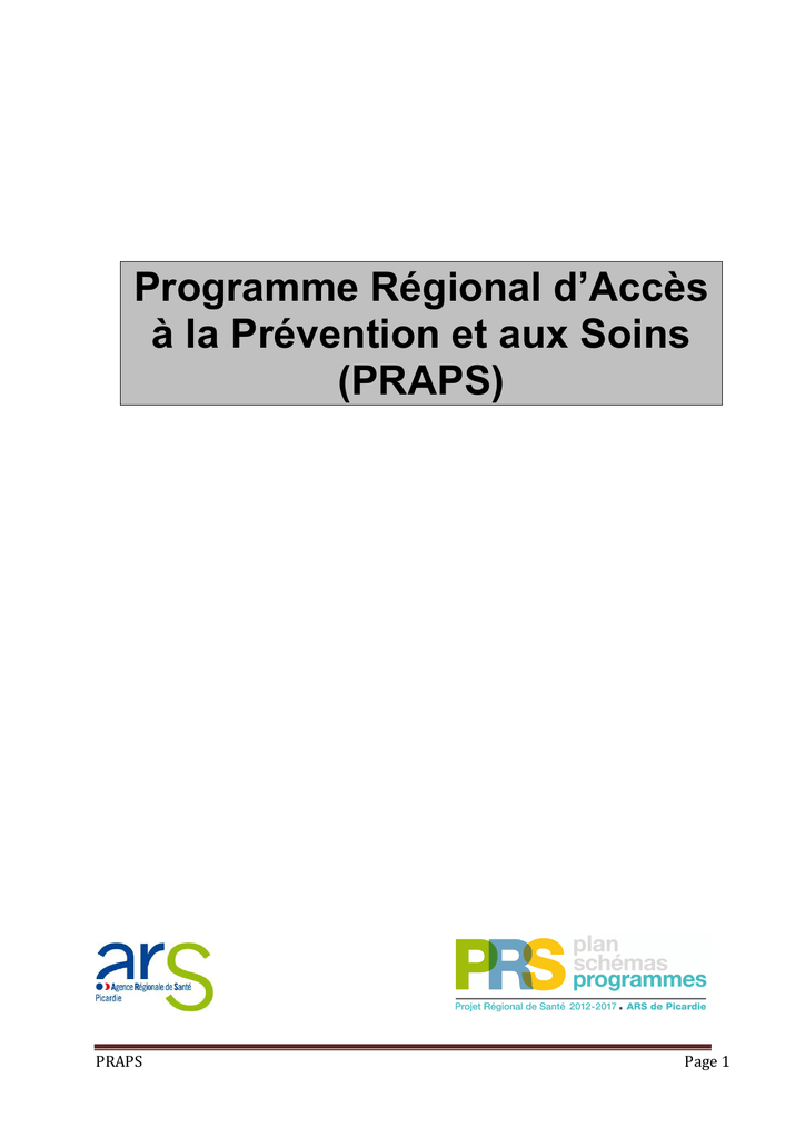 Programme Régional d’Accès à la Prévention et aux Soins (PRAPS) PRAPS Page 1 SOMMAIRE I. 1. 2. 3. II. III. CONTEXTE ............................................................................................................................................... 3 HISTORIQUE ................................................................................................................................................. 4 CADRAGE NATIONAL ...................................................................................................................................... 5 CADRAGE REGIONAL....................................................................................................................................... 6 Les axes du Plan Stratégique Régional de Santé (PSRS) de Picardie .............................................................. 6 Les priorités du Schéma Régional de Prévention (SRP 2012-2017)................................................................ 6 Les objectifs du Schéma Régional de l’Offre de Soins (SROS 2012-2017) ...................................................... 7 Les objectifs du Schéma Régional de l’Offre Sociale et Médico-Sociale (SROMS 2012-2017) ....................... 7 Le diagnostic territorial : contexte socio économique, déterminants de santé ............................................. 9 BILAN DES PRAPS II ET III ....................................................................................................................... 16 1. BILAN DU PRAPS II (2004-2008) ................................................................................................................. 17 2. BILAN DU PRAPS III (2009-2011) ................................................................................................................ 18 LES OBJECTIFS DU PRAPS-PRS ............................................................................................................... 23 FACILITER L’ACCES AUX DROITS POUR EVITER LA RENONCIATION AUX SOINS ............................................................. 25 Favoriser l’information des usagers et des opérateurs sur l’accès aux droits pour améliorer la couverture maladie CMU, CMU-C, ACS .......................................................................................................................... 25 Développer des partenariats ....................................................................................................................... 27 Renforcer la qualité du service vers le public fragile par l’Assurance Maladie ............................................ 28 Agir sur les refus de soins et les modalités de prise en charge .................................................................... 28 2. FACILITER L’ACCES A LA PREVENTION, LA PROMOTION ET L’EDUCATION A LA SANTE ................................................... 29 Améliorer la connaissance ........................................................................................................................... 29 Favoriser les démarches communautaires .................................................................................................. 30 Décliner la transversalité PRAPS à travers les objectifs du SRP .................................................................. 30 Favoriser l’accessibilité et la mobilité des personnes en situation de précarité aux différentes offres proposées et structures ............................................................................................................................... 41 3. FACILITER L’ACCES AUX SOINS ......................................................................................................................... 42 Améliorer l’articulation des soins de premiers recours ................................................................................ 42 Promouvoir le recours aux PASS généralistes et spécialisées ...................................................................... 44 Favoriser l’accès aux droits et aux soins des personnes détenues ............................................................... 45 4. FACILITER L’ACCES AUX ACCOMPAGNEMENTS MEDICO-SOCIAUX ............................................................................ 46 Améliorer le parcours de vie des personnes en situation de précarité vieillissantes et/ou handicapées et faciliter l’accès aux prises en charge médico-sociales ................................................................................. 46 Faciliter le maintien et l’accès des personnes à des logements dignes y compris dans des situations d’urgence ..................................................................................................................................................... 48 Améliorer le repérage, l’orientation et la prise en charge des personnes en situation de précarité souffrant d’addictions ................................................................................................................................................. 48 Améliorer le repérage, l’orientation et la prise en charge des personnes fragilisées en souffrance psychique ..................................................................................................................................................................... 50 5. ADAPTER LES PRATIQUES PROFESSIONNELLES AUX BESOINS DES PERSONNES EN SITUATION DE PRECARITE – RENFORCER LES COMPETENCES DES ACTEURS LOCAUX ........................................................................................................................ 51 1. IV. 1. 2. 3. V. MODALITES D’ELABORATION, DE PILOTAGE, DE SUIVI ET D’EVALUATION ............................................ 52 ELABORATION DU PRAPS-PRS ...................................................................................................................... 53 PILOTAGE DU PRAPS-PRS ...........