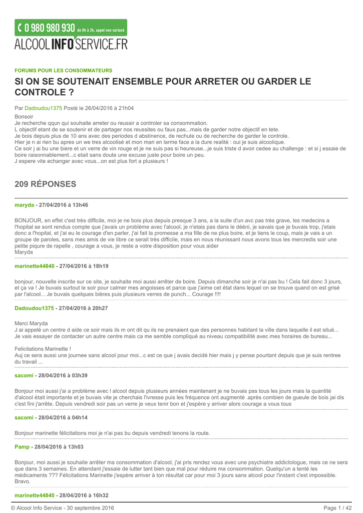 FORUMS POUR LES CONSOMMATEURS SI ON SE SOUTENAIT ENSEMBLE POUR ARRETER OU GARDER LE CONTROLE ? Par Dadoudou1375 Posté le 26/04/2016 à 21h04 Bonsoir Je recherche qqun qui souhaite arreter ou reussir a controler sa consommation. L objectif etant de se soutenir et de partager nos reussites ou faux pas...mais de garder notre objectif en tete. Je bois depuis plus de 10 ans avec des periodes d abstinence, de rechute ou de recherche de garder le controle. Hier je n ai rien bu apres un we tres alcoolisé et mon mari en larme face a la dure realité : oui je suis alcoolique. Ce soir j ai bu une biere et un verre de vin rouge et je ne suis pas si heureuse...je suis triste d avoir cedee au challenge : et si j essaie de boire raisonnablement...c etait sans doute une excuse juste pour boire un peu. J espere vite echanger avec vous...on est plus fort a plusieurs ! 209 RÉPONSES maryda - 27/04/2016 à 13h46 BONJOUR, en effet c'est très difficile, moi je ne bois plus depuis presque 3 ans, a la suite d'un avc pas très grave, les medecins a l'hopital se sont rendus compte que j'avais un problème avec l'alcool, je n'etais pas dans le dééni, je savais que je buvais trop, j'etais donc a l'hopital, et j'ai eu le courage d'en parler, j'ai fait la promesse a ma fille de ne plus boire, et je tiens le coup, mais je vais a un groupe de paroles, sans mes amis de vie libre ce serait très difficile, mais en nous réunissant nous avons tous les mercredis soir une petite piqure de rapelle , courage a vous, je reste a votre disposition pour vous aider Maryda marinette44840 - 27/04/2016 à 18h19 bonjour, nouvelle inscrite sur ce site, je souhaite moi aussi arrêter de boire. Depuis dimanche soir je n'ai pas bu ! Cela fait donc 3 jours, et ça va ! Je buvais surtout le soir pour calmer mes angoisses et parce que j'aime cet état dans lequel on se trouve quand on est grisé par l'alcool... Je buvais quelques bières puis plusieurs verres de punch... Courage !!!! Dadoudou1375 - 27/04/2016 à 20h27 Merci Maryda J ai appelé un centre d aide ce soir mais ils m ont dit qu ils ne prenaient que des personnes habitant la ville dans laquelle il est situé... Je vais essayer de contacter un autre centre mais ca me semble compliqué au niveau compatibilité avec mes horaires de bureau... Felicitations Marinette ! Auj ce sera aussi une journee sans alcool pour moi...c est ce que j avais decidé hier mais j y pense pourtant depuis que je suis rentree du travail ... sacomi - 28/04/2016 à 03h39 Bonjour moi aussi j'ai a problème avec l alcool depuis plusieurs années maintenant je ne buvais pas tous les jours mais la quantité d'alcool était importante et je buvais vite je cherchais l'ivresse puis les fréquence ont augmenté .après combien de gueule de bois jai dis c'est fini j'arrête. Depuis vendredi soir pas un verre je veux tenir bon et j'espère y arriver alors courage a vous tous sacomi - 28/04/2016 à 04h14 Bonjour marinette félicitations moi je n'ai pas bu depuis vendredi tenons la route. Pamp - 28/04/2016 à 13h03 Bonjour, moi aussi je souhaite arrêter ma consommation d'alcool, j'ai pris rendez vous avec une psychiatre addictologue, mais ce ne sera que dans 3 semaines. En attendant j'essaie de lutter tant bien que mal pour réduire ma consommation. Quelqu'un a tenté les médicaments ??? Félicitations Marinette j'espère arriver à ton résultat car pour moi 3 jours sans alcool pour l'instant c'est impossible. Bravo. marinette44840 - 28/04/2016 à 16h32 © Alcool Info Service - 30 septembre 2016 Page 1 / 42 je trouve ça chouette d'avoir des gens à qui parler et qui comprennent ce que vous ressentez ! J'en suis à mon 4ème jour sans alcool... je ne suis pas sans y penser, mais ça va, je gère plutôt bien je trouve ! J'ai acheté plein de boissons sans alcool pour quand j'ai soif parce que je n'aime pas l'eau. Je suis soutenue par mon mari, ma fille de 15 ans et mon meilleur ami, lui même alcoolique abstinent. C'est très utile d'être accompagnée, mais pas jugée. Et vous les filles, où en êtes vous ? Pamp, je n'ai jamais tenté les médicaments, ça me fait peur et je suis déjà en traitement assez lourd contre la dépression, donc je pense que ça ne ferait pas bon ménage... Courage pour ces trois semaines, essaie au moins de ralentir ta consommation. Merci Sacomi pour ton soutien. Et toi Dadoudou ? Comment ça se passe ? Dadoudou1375 - 28/04/2016 à 19h37 Je suis un peu contrariée ce soir du coup c est dur Par contre j appréhende l arrivée du we car c est le we que je bois le plus. Mais j ai quand meme hate d etre en we apres cette semaine chargée coté boulot sacomi - 29/04/2016 à 06h18 Bonjour a vous tous encore une journée sans alcool donc ça fera une semaine je n'y pense pas trop.La motivation est toujours la avoir lu tous ces témoignages sur ce site je pense m'a ouvert les yeux et ma fait prendre conscience qu'il fallait que j'arrête. Bon courage marinette dadoudou tenez bon. Pamp lâche rien tu verras les effets bénéfiques que ca procure physiquement et surtout mentalement maryda - 29/04/2016 à 10h02 coucou et bonjour a toutes celles qui essaient d'arrêter de boire, c'est vrai qu'a plusieurs c'est mieux... et toi marinette si tu as le soutien de ta famille et tes amis c'est genial, car les proches comptent beaucoup, et souvent ne comprennent pas notre addiction, quand aux medicaments il n'y a qu'un medecin qui pourra vous les donner, couragea toutes, et n'oubliez pas les groupes de paroles, si vous en avez autour de vous... wilcox - 29/04/2016 à 13h07 hello ca fait du bien de voir que je suis pa seul dans cette galère bon courage sacomi,dadoudou1375 j'essaye d'arreter, etant un tres gros consomateur (une bouteille de vodka ou1 a 2 bouteilles de vin). suis juste sur anxyo on prescrit mais pas encore pris selincro, suis a mon 2 jour sans boire et j'avais reduit de moitié la semaine derniere. je flippe du week end (c surtout la le + dur). suis motivé, je pense au calorie que cela 