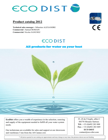 Product catalog 2012 Technical sales manager : Sébastien ALEXANDRE Commercial : Samuel ROMAIN Commercial: Nicolas SANCHEZ All products for water on your boat EcoDist offers you a wealth of experience in the selection, sourcing and supply of the equipment needed to fulfill all your water system needs. Our technicians are available for sales and support at our showroom and warehouse 5 mn from the A8 Cannes exit. 35, ZI de l'Argile, allée C 06370 Mouans Sartoux Tèl : +33 (0)492 283 888 Fax : +33 (0)492 283 889 ECO DIST [email protected] * All prices quoted in our catalog are approximate and may change at any time, the pictures shown are not binding 1 Circuit diagram of water Sommaire : CHAPTER 1 : WATERMAKER / CONSUMABLE 1-14 WATERMAKER TECNICOMAR ° WATERMAKER HRO ° OTHER WATERMAKER ° FILTERS ° MEMBRANES ° OIL ° POTABILIZER CHAPTER 2 : FILTRATION SYSTEMP 15-20 FILTRATION SYSTEM ° HIGH FLOW FILTER ° SEA WATER FILTER CHAPTER 3 : WATER TREATEMENT SYSTEM 21-26 WATER SOFTNER ° UVC GENERATOR ° ANTI SCAL SYSTEMP ° WATER TREATMENT CENTRAL ° POTABILIZER CHAPTER 4 : SEWAGE CENTRAL OF TREATMENT 27-36 ECOMAR ° STP FACET ° WAVEBRITE ° WAVESTREAM ° OIL SEPARATOR FACT CHAPTER 5 : TOILETS 37-46 TOILETS TECMA ° TECMA SPARE PARTS ° TOILETS SEALAND ° SEALAND SPARE PARTS ° TOILETS SFA ° TOILETS JETS ° OTHER TOILETS CHAPTER 6 : TANK AND PLUMBING 47-62 WATER TANK ° WASTE TANK ° CUSTOM TANK ° PIPE ° DECK FITTING ° VENTS ° PLUMBING ° ANTI-ODOR FILTER ° FITTING ° SEALING SYSTEM CHAPTER 7 : PUMPS BLACK WATER PUMP ° OIL/WATER PUMP ° CILRCULATION PUMP ° WATER PRESSURE SYSTEM ° BILGE PUMP ° WASHING PUMP ° DISCHARGE PUMP FILTERS AND TANK FOR PUMP 63-74 CHAPTER 8 : CLEANING PRODUCT 75-82 TANK MAINTENANCE ° BILGE MAINTENANCE ° FUEL TREATMENT ° WC TREATMENT ° ABSORBENT CHAPTER 9 : COMFORT 83-88 BOILER ° FRIDGE ° TRAVEL BOX REFREGERATOR ° FREEZER ° WINE CELLAR ° ICE MAKER CHAPTER 10 : POLUTION CONTROL AND ANTI FIRE 89-96 BOOM ° SKIMMER ° ANALYSES SYSTEMP ° ATEX EQUIPEMENT ° ANTI-FIRE TOOL CHAPTER 11 : STEAM CLEANING STEAMBIO 2000 ° STEAMBIO 3000 ° STEAMBIO CAR WASH ° VAPBIO 97-102 CHAPITRE 1 : WATERMAKER CONSUMBALE TECNICOMAR HRO OTHER WATERMAKER CARTDRIGES MEMBRANE OIL POTABILIZER [email protected] +33(0)492 283 888 1 WATERMAKER TECNICOMAR o Sailor Sailor MD 600 Sailor compact 1500+touch+sceen display Sailor Compact is a fully automatic Reverse Osmosis watermaker mounted in a compact stainless steel frame, can easily fit in small spaces available aboard sailing and motorboats. Also available as Slim configuration -with separate components- and MD -L frame-. Standard automatic pressure regulation. Low noise operation. No operator requested. The electronic control panel allows the simple control of all functions. The watermaker can also work in manual mode. Model Production per hour(L) Voltage, Frequency Dimension (cm) SAILOR COMPACT 200 35 230V-1.5Kw * SAILOR COMPACT 400 SAILOR COMPACT 600 SAILOR COMPACT 1000 SAILOR COMPACT 1500 SAILOR MD 200 SAILOR MD 400 SAILOR MD 600 SAILOR MD 1000 SAILOR MD 1500 70 100 160 220 35 70 100 160 220 230V-1.5Kw * 230V-1.8Kw * 230V-1.8Kw * 230V-1.8Kw * 230V-1.5Kw * 230V-1.5Kw * 230V-1.8Kw * 230V-1.8Kw * 230V-1.8Kw * Weight (kg) Reference 75 x 52 x 36 49 AR21160 75 x 52 x 36 75 x 52 x 36 117 x 52 x 36 117 x 52 x 36 68 x 31 x 60 68 x 31 x 60 68 x 31 x 60 117 x 31 x 60 117 x 31 x 60 52 55 64 68 48 50 52 62 66 AR21161 AR21162 AR21163 AR21164 AR21165 AR21166 AR21167 AR21168 AR21169 * other voltage available on demand 2 [email protected] +33(0)492 283 888 [email protected] +33(0)492 283 888 3 o SW Sailor Compact is a fully automatic Reverse Osmosis watermaker mounted in a compact stainless steel frame, can easily fit in small spaces available aboard sailing and motorboats. Also available as Slim configuration -with separate components- and MD -L frame-. Standard automatic pressure regulation. Low noise operation. No operator requested. The electronic control panel allows the simple control of all functions. The watermaker can also work in manual mode. Prod (l/H) Model 600 800 1000 1500 2000 3000 4000 6000 10000 STDC SY 3000 STDC SY 4500 STDC SY 6000 STDC SY 9000 STDC SY 12000 SW8-72 SW8-100 SW8-150 SW8-250 Voltage/ Puissance d’utilisation 400V AC – 5.5Kw * 400V AC – 5.5Kw * 400V AC – 7.5Kw * 400V AC – 11Kw * 400V AC – 11Kw * 400V AC – 15Kw * 400V AC – 22Kw * 400V AC – 22Kw * 400V AC – 45Kw * Dimension (mm) Poids (kg) Référence 1500 x 750 x 720 1500 x 750 x 720 1500 x 750 x 720 1930 x 980 x 1040 1930 x 980 x 1040 2890 x 950 x 1380 4000 x 950 x 1380 4930 x 950 x 1380 5950 x 950 x 1380 160 180 210 300 360 720 800 1200 1800 Nous contacter Nous contacter Nous contacter Nous contacter Nous contacter Nous contacter Nous contacter Nous contacter Nous contacter * other voltage available on demand o Oasi (less power consumption 80%) Oasis is a reverse osmosis desalination plant with low power consumption: thanks to its energy recovery allows energy savings of up to 80% compared to conventional desalination plants. It can be powered by batteries, solar or wind power. Oasis is available in a compact stainless steel and Slim modular version, and is ideal for all sailing and motor boats. It has carbon fiber vessels certified by TÜV. The electronic management allows control of all functions with absolute simplicity: LCD display shows the quality of water produced, temperature, and hourly production. The pressure setting is automatic. On request, the system can be supplied with remote control and an activated charcoal filter. Model Prod (l/H) OASI 30 OASI 60 OASI 90 Supply/installed power Weight (kg) ( mod. Compact) Conso. (amps) Code 35 12/24 DC -0.2Kw 42 14 (12V) / 8 (24V) AR21170 60 90 12/24 DC 0.55Kw 12/24 DC 0.55Kw 46 50 38 (12V) / 20 (24V) 42 (12V) / 22 (24V) AR21171 AR21172 Also available on modular system 4 [email protected] +33(0)492 283 888 o Basic Essential 400 is very easy to use, reliable and resistant. The watermaker is mou