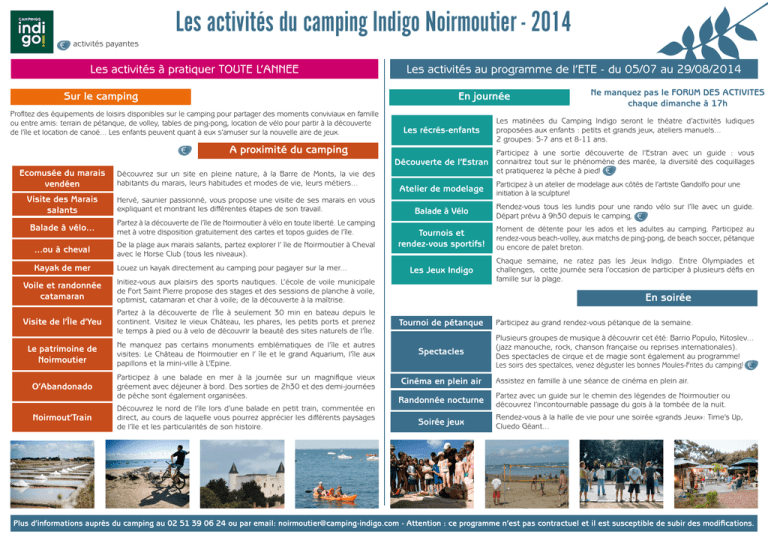 Les activités du camping Indigo Noirmoutier - 2014 € activités payantes Les activités à pratiquer TOUTE L’ANNEE Sur le camping Les activités au programme de l’ETE - du 05/07 au 29/08/2014 En journée Profitez des équipements de loisirs disponibles sur le camping pour partager des moments conviviaux en famille ou entre amis: terrain de pétanque, de volley, tables de ping-pong, location de vélo pour partir à la découverte de l’île et location de canoë... Les enfants peuvent quant à eux s’amuser sur la nouvelle aire de jeux. € Les récrés-enfants A proximité du camping Ne manquez pas le FORUM DES ACTIVITES chaque dimanche à 17h Les matinées du Camping Indigo seront le théatre d’activités ludiques proposées aux enfants : petits et grands jeux, ateliers manuels... 2 groupes: 5-7 ans et 8-11 ans. Participez à une sortie découverte de l’Estran avec un guide : vous Découverte de l’Estran connaitrez tout sur le phénomène des marée, la diversité des coquillages Ecomusée du marais vendéen Découvrez sur un site en pleine nature, à la Barre de Monts, la vie des habitants du marais, leurs habitudes et modes de vie, leurs métiers... Visite des Marais salants Hervé, saunier passionné, vous propose une visite de ses marais en vous expliquant et montrant les différentes étapes de son travail. Balade à vélo... Partez à la découverte de l’île de Noirmoutier à vélo en toute liberté. Le camping met à votre disposition gratuitement des cartes et topos guides de l’île. ...ou à cheval De la plage aux marais salants, partez explorer l’ île de Noirmoutier à Cheval avec le Horse Club (tous les niveaux). Kayak de mer Louez un kayak directement au camping pour pagayer sur la mer... et pratiquerez la pêche à pied! Atelier de modelage € Participez à un atelier de modelage aux côtés de l’artiste Gandolfo pour une initiation à la sculpture! Balade à Vélo Rendez-vous tous les lundis pour une rando vélo sur l’île avec un guide. Départ prévu à 9h30 depuis le camping. € Tournois et rendez-vous sportifs! Moment de détente pour les ados et les adultes au camping. Participez au rendez-vous beach-volley, aux matchs de ping-pong, de beach soccer, pétanque ou encore de palet breton. Les Jeux Indigo Chaque semaine, ne ratez pas les Jeux Indigo. Entre Olympiades et challenges, cette journée sera l’occasion de participer à plusieurs défis en famille sur la plage. Voile et randonnée catamaran Initiez-vous aux plaisirs des sports nautiques. L’école de voile municipale de Fort Saint Pierre propose des stages et des sessions de planche à voile, optimist, catamaran et char à voile; de la découverte à la maîtrise. Visite de l’Île d’Yeu Partez à la découverte de l’Île à seulement 30 min en bateau depuis le continent. Visitez le vieux Château, les phares, les petits ports et prenez le temps à pied ou à velo de découvrir la beauté des sites naturels de l’Île. Tournoi de pétanque Le patrimoine de Noirmoutier Ne manquez pas certains monuments emblématiques de l’île et autres visites: Le Château de Noirmoutier en l’ île et le grand Aquarium, l’île aux papillons et la mini-ville à L’Epine. Spectacles O’Abandonado Participez à une balade en mer à la journée sur un magnifique vieux gréement avec déjeuner à bord. Des sorties de 2h30 et des demi-journées de pêche sont également organisées. Noirmout’Train Découvrez le nord de l’ïle lors d’une balade en petit train, commentée en direct, au cours de laquelle vous pourrez apprécier les différents paysages de l’île et les particularités de son histoire. En soirée Cinéma en plein air Randonnée nocturne Soirée jeux Participez au grand rendez-vous pétanque de la semaine. Plusieurs groupes de musique à découvrir cet été: Barrio Populo, Kitoslev... (jazz manouche, rock, chanson française ou reprises internationales). Des spectacles de cirque et de magie sont également au programme! Les soirs des spectalces, venez déguster les bonnes Moules-Frites du camping! € Assistez en famille à une séance de cinéma en plein air. Partez avec un guide sur le chemin des légendes de Noirmoutier ou découvrez l’incontournable passage du gois à la tombée de la nuit. Rendez-vous à la halle de vie pour une soirée «grands Jeux»: Time’s Up, Cluedo Géant... Plus d’informations auprès du camping au 02 51 39 06 24 ou par email: [email protected] - Attention : ce programme n’est pas contractuel et il est susceptible de subir des modifications.