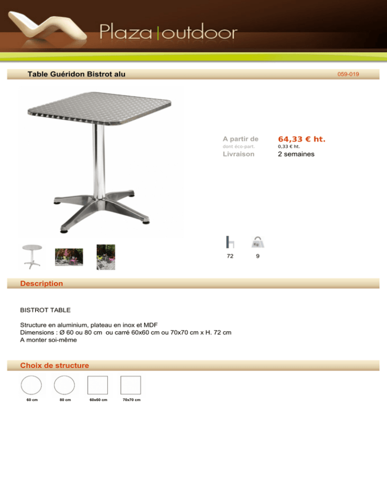 Table Guéridon Bistrot alu 64,33 € ht. Description Choix de structure