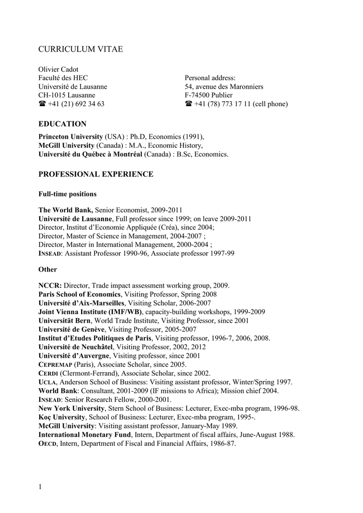 CURRICULUM VITAE Olivier Cadot Faculté des HEC Université de Lausanne CH-1015 Lausanne +41 (21) 692 34 63 Personal address: 54, avenue des Maronniers F-74500 Publier +41 (78) 773 17 11 (cell phone) EDUCATION Princeton University (USA) : Ph.D, Economics (1991), McGill University (Canada) : M.A., Economic History, Université du Québec à Montréal (Canada) : B.Sc, Economics. PROFESSIONAL EXPERIENCE Full-time positions The World Bank, Senior Economist, 2009-2011 Université de Lausanne, Full professor since 1999; on leave 2009-2011 Director, Institut d’Economie Appliquée (Créa), since 2004; Director, Master of Science in Management, 2004-2007 ; Director, Master in International Management, 2000-2004 ; INSEAD: Assistant Professor 1990-96, Associate professor 1997-99 Other NCCR: Director, Trade impact assessment working group, 2009. Paris School of Economics, Visiting Professor, Spring 2008 Université d’Aix-Marseilles, Visiting Scholar, 2006-2007 Joint Vienna Institute (IMF/WB), capacity-building workshops, 1999-2009 Universität Bern, World Trade Institute, Visiting Professor, since 2001 Université de Genève, Visiting Professor, 2005-2007 Institut d’Etudes Politiques de Paris, Visiting professor, 1996-7, 2006, 2008. Université de Neuchâtel, Visiting Professor, 2002, 2012 Université d’Auvergne, Visiting professor, since 2001 CEPREMAP (Paris), Associate Scholar, since 2005. CERDI (Clermont-Ferrand), Associate Scholar, since 2002. UCLA, Anderson School of Business: Visiting assistant professor, Winter/Spring 1997. World Bank: Consultant, 2001-2009 (IF missions to Africa); Mission chief 2004. INSEAD: Senior Research Fellow, 2000-2001. New York University, Stern School of Business: Lecturer, Exec-mba program, 1996-98. Koç University, School of Business: Lecturer, Exec-mba program, 1995-. McGill University: Visiting assistant professor, January-May 1989. International Monetary Fund, Intern, Department of fiscal affairs, June-August 1988. OECD, Intern, Department of Fiscal and Financial Affairs, 1986-87. 1 DISTINCTIONS Senior Fellow, FERDI, 2012FPD Academy best paper prize, The World Bank, 2010 Research Fellow, CEPR, since 1999. Elected Best Teacher, HEC Lausanne, 2004. Three times nominated for INSEAD’s Outstanding Teacher Award. Reader's Digest prize for Excellence in Teaching, Princeton University, 1988. Princeton University fellowship, 1985-89 Sloan Foundation dissertation fellowship, summers 1986, 1987, 1989. Newcomen Society Prize, best paper in economic history, 1982. Great distinction, McGill University, 1982. Listed in the Who’s Who in France since 2000 and in the Who’s Who in the World since 2007. PUBLICATIONS “Export Diversification: A Survey”; with Céline Carrère and Vanessa Strauss-Kahn; forthcoming, Journal of Economic Surveys. “Applied Trade Policy Analysis”, with Soamiely Andriamananjara and Jean-Marie Grether; forthcoming in Arvid Lukauskas, Robert M. Stern, and Gianni Zanini, eds., Handbook of Trade Policy for Development, Oxford University Press, 2011. “Trade Diversification: Drivers and Impacts”; with Céline Carrère and Vanessa Strauss-Kahn; in Marion Jansen, Ralf Peters and Jose Manuel Salazar-Xirinachs, eds., Trade and employment: From myths to facts; Geneva: ILO, 2011. “Export Diversification: What’s Behind the Hump?”, with Céline Carrère and Vanessa StraussKahn, CEPR discussion paper 6590; Review of Economics & Statistics 93, 2011, 590-605. “Sunk Costs in Agriculture”, with Laure Dutoit and Marcelo Olarreaga; in Guido Porto and Bernard Hoekman, eds., Adjustment costs and adjustment impact of trade policy; Washington: The World Bank, 2010. “Non-Tariff Measures: Impact, Regulation, and Trade Facilitation”; with Sebastian Saez and Maryla Maliszewska; forthcoming in Gerard McLinden, ed., Modernizing Border Management; Washington, The World Bank, 2010. “Endowments, Specialization, and Policy”, with Yuliya Shakurova; Review of International Economics 18, 2010, 913-923. “Understanding the Barriers to Entry Effects of Rules of Origin in Preferential Trading Arrangements with an Application to Asian FTAs”, with Jaime de Melo and Alberto PortugalPerez; in Miroslav N. Jovanović, ed., International Handbook on the Economics of Integration, Volume I, Edward Elgar, 2010, pp 187-204. “The Elimination of Madagascar’s Vanilla Marketing Board, Ten Years On”; with Laure Dutoit and Jaime de Melo, CEPR DP 5548; Journal of African Economies 18, 2009, 388-430 2 “Préférences et règles d’origine: Perspectives des APE pour l’Afrique de l’Ouest et Centrale”; with Calvin Djiofack and Jaime de Melo, Revue d’Economie du Développement 2008/3, 5-48. “Does Regionalism Reduce Trade-Policy Volatility?”, with Marcelo Olarreaga and Jeanne Tschopp, in K. Anderson E. Valenzuela and D. Sandri, eds., Fifty years of distortions to the world’s agricultural prices; Washington: The World Bank:2008. “Why OECD Countries should Reform their Rules of Origin”, with Jaime de Melo; World Bank Research Observer 23, 2007, 77-105. “Rules of Origin for Preferential Trading Arrangements: Implications for the ASEAN Free Trade Area of EU and US Experience”; with Jaime de Melo and Alberto Portugal-Pérez, Journal of Economic Integration 22, 2007, 288-319. “Tariff Evasion and Customs Corruption: Does PSI Help?”, with Jose Anson and Marcelo Olarreaga, Contributions to Economic Analysis and Policy 5, 2006. “Product-Specific Rules of Origin in US and EU Preferential Trading Agreements: An Assessment”; with Céline Carrère, Jaime de Melo and Bolormaa Tumurchudur; World Trade Review 5, 2006, 199-224. “How Much Market Access in FTAs? Textiles in Nafta”, with Céline Carrère, Jaime de Melo and Alberto Portugal; World Bank Economic Review 19, 2006, 379-406. “Contribution to Productivity or Pork Barrel? The Two Faces of Infrastructure Investment”, with Lars-Hendrik Röller and Andreas Stephan, Journal of Public Economics 90