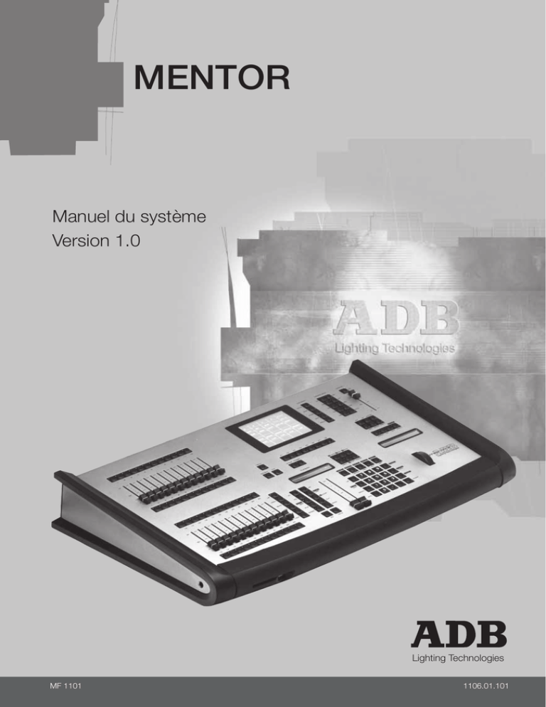 MENTOR MENTOR Manuel du système Version 1.0 Lighting Technologies MF 1101 Lighting Technologies Page 1 Révision : 001 1106.01.101 MENTOR Page 2 Révision : 001 MENTOR Sommaire Lighting Technologies 1 Introduction 1.1Livraison et déballage 1.2 Préparation du positionnement du pupitre 1.3Installation du pupitre 1.4Alimentation électrique 1.5Raccordement électrique 2 La gamme MENTOR 2.1MENTOR 2.1.1Caractéristiques techniques 2.1.2Panneau avant 2.1.3Panneau arrière 2.2EXTENSION MENTOR 2.2.1Caractéristiques techniques 2.2.2Panneau arrière 2.2.3Adressage d’une EXTENSION 2.2.4Interconnections entre le MENTOR et les CHASSIS D’EXTENSION 2.2.5EXTENSION utilisant l’alimentation électrique du MENTOR 2.2.6EXTENSION utilisant son alimentation électrique 230 V intégrée 5 5 5 5 6 6 7 7 7 7 8 10 10 10 11 12 12 12 3 Logiciel ISIS® 3.1Obtention de mises à jour via Internet 3.1.1ISIS+ Pages 3.1.2Principaux téléchargements 3.2Installation et mise à jour d’ISIS® 3.2.1Mise à jour d’ISIS® avec un périphérique CD-ROM externe 3.2.2Mise à jour de ISIS® avec une clé USB 3.3Configuration 14 14 14 15 15 15 16 17 4 Sources d’information supplémentaires 18 Page 3 Révision : 001 MENTOR Page 4 Révision : 001 MENTOR 1. Introduction 1.1 Livraison et déballage Dès que vous recevrez votre équipement, ouvrez les boîtes et vérifiez les articles reçus. Si vous découvrez des dommages quelconques, veuillez entrer immédiatement en relation avec le transporteur et faire toutes réclamations nécessaires pour les problèmes découverts. Vous pouvez être assurés que lorsque l’équipement a quitté notre usine, il était en parfait état. Vérifiez que l’équipement qui vous a été fourni correspond à la feuille d’expédition et que cela correspond à votre commande. Vous trouverez les références de votre pupitre sur une étiquette d’identification fixée au panneau arrière. S’il y a une différence quelconque entre la commande et la livraison, veuillez contacter immédiatement votre fournisseur qui résoudra la situation à votre entière satisfaction. Conditions de stockage permises: Température Humidité relative : -10 à + 50° C : taux de variation: 20 °C/heure : 20 à 80 % sans condensation. 1.2 Préparation du positionnement du pupitre La surface sur laquelle le pupitre doit être positionné doit être régulière, de niveau et solide. Assurez-vous qu’il y ait un dégagement suffisant autour du pupitre pour : • Ouvrir le pupitre. • Accéder aux connexions arrière. • Permettre une circulation d’air autour des orifices de ventilation pour éviter la surchauffe du pupitre. 1.3 Installation du pupitre Le pupitre MENTOR est un pupitre d’éclairage professionnel à mémoire. C’est un équipement de Classe I, conçu et fabriqué conformément à la norme EN 60950. CET EQUIPEMENT DOIT ETRE MIS A LA TERRE. Il n’est pas nécessaire de prendre des dispositions spéciales pour l’installation de l’équipement. La pièce dans laquelle l’équipement sera installé doit être propre, sans poussière, avec une température comprise entre 5 °C et 35 °C et une humidité relative de 20 à 80 % sans condensation. Il n’est pas conseillé de consommer des aliments ou boissons au-dessus du pupitre, afin d’éviter tout renversement accidentel dans l’équipement et la destruction de certaines fonctions. Le pupitre d’éclairage et l’écran doivent être installés sur une table ou une console. Comme tout équipement qui comprend des microprocesseurs et utilise une technologie semblable, ce pupitre est sensible aux influences de l’électricité statique et il est possible que ces influences affectent le fonctionnement dans certaines circonstances. Dans ce cas, il sera nécessaire de placer des tapis antistatiques sur le sol et éventuellement d’humidifier l’atmosphère. A chaque fois que l’on utilisera un tapis, celui-ci doit être de type antistatique. Afin d’éviter de perdre du temps et peut-être d’endommager l’équipement, l’installateur est invité à suivre scrupuleusement les instructions dans les schémas indiqués et sur le panneau arrière du pupitre à base ISIS®. Lighting Technologies Page 5 Révision : 001 MENTOR Avant de mettre le pupitre ou un quelconque de ses périphériques sous tension, vérifiez que les tensions sont dans les limites définies dans le paragraphe des CARACTERISTIQUES TECHNIQUES. NB : Toutes les connexions doivent être effectuées hors tension, sinon le fonctionnement peut être affecté et cela peut même endommager l’équipement dans certaines conditions. 1.4 Alimentation électrique Comme tout équipement utilisé dans les systèmes informatiques, votre système est sensible aux caractéristiques du réseau secteur et en particulier aux variations et pics de tension. Par conséquent, nous vous conseillons d’utiliser un conditionneur de ligne approprié sur cet équipement. Veuillez nous consulter en cas d’hésitation à ce propos. La ligne doit être protégée par des fusibles ou des disjoncteurs et doit être équipée d’un raccordement à la terre pour la sécurité personnelle. Avis important pour les câbles électriques Les câbles électriques et connecteurs constituent une partie importante de votre équipement et contribuent à sa sécurité. Utilisez toujours le connecteur pour établir ou interrompre la connexion ; ne tirez jamais sur le câble. N’endommagez jamais le câble ou les connecteurs de quelque façon que ce soit ; ne pincez pas ni n’attachez ensemble les câbles d’alimentation ou de signalisation, vérifiez-les à chaque installation et à intervalles réguliers sur une installation permanente. 1.5 Raccordement électrique Pour éviter le risque d’électrocution, ne pas ouvrir le pupitre. L’accès aux parties internes n’est pas nécessaire pour l’utilisation normale. Il ne se trouve aucune pièce QUE l’utilisateur PUISSE CHANGER à l’intérieur. Pou