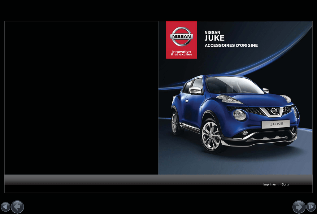 NISSAN JUKE ACCESSOIRES D’ORIGINE Imprimer | Sortir NISSAN JUKE DESIGN STUDIO CREATIVE LINE Detroit Red London White San Diego Yellow Tokyo Black Nouveau NISSAN JUKE : Osez vous différencier. Faites de votre JUKE un véhicule unique grâce au nouveau programme de personnalisation NISSAN Design Studio. Un large choix de coloris vous est proposé afin de personnaliser l’intérieur et l’extérieur de votre véhicule selon vos envies. Deux options s’offrent à vous : l’option CREATIVE LINE, disponible à la commande de votre véhicule, vous permettra de le personnaliser dans les coloris suivants : Jaune, Rouge, Blanc et Noir. L’option EXCLUSIVE LINE, quant à elle, vous offrira davantage de coloris et de possibilités de personnalisation. EXCLUSIVE LINE Tokyo Matte Black Yokohama Purple ACCESSOIRES DE PERSONNALISATION 1 Oppama Orange Zama Blue Nashville Carbon Atsugi Grey 2 3 PACK EXTÉRIEUR 4 3 4 Renforcez le style de votre NISSAN JUKE grâce au Pack EXTÉRIEUR composé des coques de rétroviseur, des habillages de boucliers avant et arrière et des cerclages de phares. 1- Coques de rétroviseur, San Diego Yellow (242) 2- Cerclages de phares, San Diego Yellow (241) 3- Habillages de boucliers avant et arrière, San Diego Yellow (239) 4- Jantes alliage léger 18" XENA avec inserts San Diego Yellow (235)* Sur la page de couverture : JUKE Ink Blue personnalisé avec les accessoires suivants : coques de rétroviseur chromées (139), poignées de porte chromées (136), habillages de boucliers avant chromés (138), baguettes latérales chromées (140), bouclier « Suburban avant » (259) et jantes alliage 18" Atsugi Grey Diamond Cut (58) . *Il est conseillé de vous rendre chez votre concessionnaire après une période de 3 ans afin que celui-ci procède à l’inspection de vos jantes. Imprimer | Sortir PACK STYLE ACCESSOIRES DE PERSONNALISATION Accentuez l’élégance de votre JUKE en l’équipant de la baguette de coffre et des baguettes latérales. CREATIVE LINE EXCLUSIVE LINE PACK DYNAMIQUE** Beijing Chrome Detroit Red London White Dynamisez le look de votre Juke en l’équipant du becquet de toit et des poignées de porte. Tokyo Matte Black San Diego Yellow Yokohama Purple 1- Poignées de porte, Tokyo Black (93) 2- Becquet de toit, Tokyo Black (99) 3- Jantes alliage 18" KAMI Tokyo Black Oppama Orange Tokyo Black (89) 2 Zama Blue Nashville Carbon 1 1 2 Atsugi Grey 1 3 2 1 3 PACK EXTÉRIEUR PACK EXTÉRIEUR + PACK STYLE PACK EXTÉRIEUR + PACK DYNAMIQUE PACK EXTÉRIEUR + PACK DYNAMIQUE + PACK STYLE 2 1- Baguette de coffre, London Wh White hitie (11) 2- Baguettes latérales, London White e (19) 3- Jantes alliage léger 18" XENA avec inserts London White (10)* *Il est conseillé de vous rendre chez votre concessionnaire après une période de 3 ans afin que celui-ci procède à l’inspection de vos jantes. ** Pack DYNAMIQUE non disponible dans les coloris Nashville Carbon et Beijing Chrome Imprimer | Sortir Grâce au large choix de coloris disponibles, vous pourrez façonner votre JUKE à votre image PACK EXTÉRIEUR ACCESSOIRES DE PERSONNALISATION UNE SOURCE D’INSPIRATION La première personne à avoir personnalisé son NISSAN JUKE est Shiro Nakamura, Senior Vice-Président en charge du Design : «Grâce aux différentes possibilités de personnalisation, nos clients peuvent laisser libre cours à leur imagination». PACK EXTÉRIEUR + PACK STYLE PACK EXTÉRIEUR + PACK DYNAMIQUE + PACK STYLE Imprimer | Sortir EXCLUSIVE LINE CREATIVE LINE 1 ACCESSOIRES DE PERSONNALISATION 2 10 11 4 6 5 3 12 Créez votre propre univers grâce aux différentes finitions intérieures de couleur. 1- Casquette d’instrumentation avec surpiqûres San Diego Yellow (249) 2- Finitions intérieures San Diego Yellow (246) 3- Tapis de sol velours avec logo et surpiqûres San Diego Yellow (250) 4- Console centrale et inserts de portes San Diego Yellow (232) 5- Accoudoir central avant en cuir avec surpiqûres San Diego Yellow (248) 6- Tapis de sol velours avec logo et surpiqûres de couleur (50, 25, 250, 80, 167, 131, 192) 7- Accoudoir central avant en cuir avec surpiqûres Detroit Red (48) 8- Coque de rétroviseur intérieure Detroit Red (47) 9- Tapis de sol velours avec logo et surpiqûres Detroit Red (50) 10- Accoudoir central avant en cuir avec surpiqûres Detroit Red (48) 11- Accoudoir central avant en cuir avec surpiqûres London White (23) 12- Accoudoir central avant en cuir avec surpiqûres San Diego Yellow (248) 13- Accoudoir central avant en cuir avec surpiqûres Tokyo Black (104) PACK LOUNGE Optimisez votre confort intérieur grâce au PACK LOUNGE composé de l’accoudoir central en cuir et du tapis de sol velours surpiqué dans la couleur de votre choix. 13 7 8 9 Imprimer | Sortir JANTES ALLIAGE Les jantes alliage d’origine NISSAN ont été spécialement conçues pour votre véhicule. Un large choix de couleurs vous est également proposé afin de répondre à vos besoins. Jantes alliage 16" NISEKO (254) Tokyo Black Atsugi Grey Jantes alliage 18" NISMO (253) Jantes alliage 17" ATO Detroit Red (35) London White (10) San Diego Yellow (235) Yokohama Purple (152) Oppama Orange (116) Zama Blue (177) Tokyo Black (91) Jantes alliage 18" KAMI Detroit Red Diamond Cut (33) London White (08) Yokohama Purple diamond cut (150) Oppama Orange diamond cut (114) San Diego Yellow Diamond Cut (233) Tokyo Black (88) Tokyo Matte Black Diamond Cut (199) Zama Blue Diamond Cut (175) Atsugi Grey Diamond Cut (57) EXCLUSIVE LINE San Diego Yellow Jantes alliage 16" Silver (255) CREATIVE LINE Jantes alliage 18" avec inserts de couleur* Oppama Orange ACCESSOIRES DE PERSONNALISATION Atsugi Grey (60) Black (89) Silver (63) Atsugi Grey (58) Silver (64) Detroit Red London White Écrous antivol Yokohama Purple Zama Blue *Il est conseillé de vous rendre chez votre concessionnaire après une période de 3 ans afin que celui-ci procède à l’inspection de vos jantes. Imprimer | Sortir (256) ÉNERGIE ET FORCE Renforcez le côté P