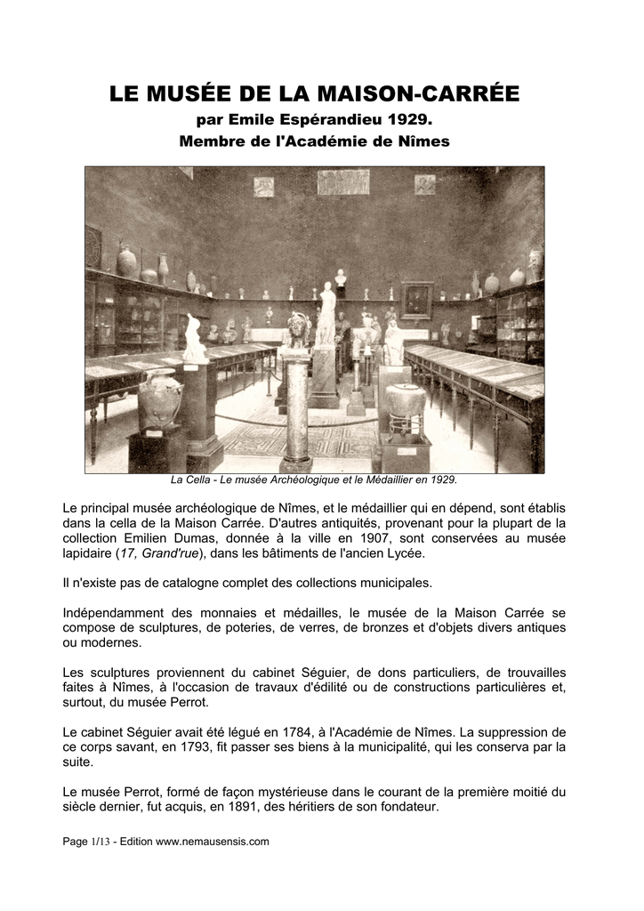LE MUSÉE DE LA MAISON-CARRÉE par Emile Espérandieu 1929. Membre de l'Académie de Nîmes La Cella - Le musée Archéologique et le Médaillier en 1929. Le principal musée archéologique de Nîmes, et le médaillier qui en dépend, sont établis dans la cella de la Maison Carrée. D'autres antiquités, provenant pour la plupart de la collection Emilien Dumas, donnée à la ville en 1907, sont conservées au musée lapidaire (17, Grand'rue), dans les bâtiments de l'ancien Lycée. Il n'existe pas de catalogne complet des collections municipales. Indépendamment des monnaies et médailles, le musée de la Maison Carrée se compose de sculptures, de poteries, de verres, de bronzes et d'objets divers antiques ou modernes. Les sculptures proviennent du cabinet Séguier, de dons particuliers, de trouvailles faites à Nîmes, à l'occasion de travaux d'édilité ou de constructions particulières et, surtout, du musée Perrot. Le cabinet Séguier avait été légué en 1784, à l'Académie de Nîmes. La suppression de ce corps savant, en 1793, fit passer ses biens à la municipalité, qui les conserva par la suite. Le musée Perrot, formé de façon mystérieuse dans le courant de la première moitié du siècle dernier, fut acquis, en 1891, des héritiers de son fondateur. Page 1/13 - Edition www.nemausensis.com Presque toutes les poteries conservées à la Maison Carrée paraissent de provenance locale. On manque toutefois de renseignements sur les circonstances de leur découverte et sur leurs divers possesseurs. Il semblerait que la plupart aient fait partie de l'ancien fonds de la ville et lui soient venues de l'Académie de Nîmes, héritière de Séguier. Le musée Perrot n'en contenait qu'une cinquantaine, dont sept provenaient de Pompéi. Comme pour les poteries, toutes indications concernant les verres font défaut. A de rares exceptions, c'est l'ancien fonds de la ville, c'est-à-dire la collection Séguier, qui les afournis. Le musée Perrot ne contenait pas d'autres verres que « huit lacrymatoires et divers fragments ». Quelques bronzes et autres petites antiquités de métal, d'os, ou d'autre matière proviennent de dons ou du musée Perrot, notamment « cinq statues romaines ou gauloises de 0m05 à 0m11 de haut » qu'il n'est pas possible d'identifier. Mais, dans l'ensemble, c'est encore par Séguier que les collections de ces bronzes et de ces petites antiquités ont été formées. Les objets modernes sont surtout des poids, des sceaux et des médailles. Beaucoup de ces objets, notamment la plupart des poids, furent également réunis par Séguier. La collection de sceaux a été donnée par Germer-nurand. Les médailles proviennent de dons individuels. Le médaillier actuel n'existe que depuis trois quarts de siècle. Avant la Révolution, l'Académie de Nîmes possédait a peu près 6.000 pièces qui lui avaient été léguées par Séguier. Elles étaient placées sur 120 tablettes contenues dans un grand bahut. Quand les collections réunies par ce savant passèrent à la ville, le médaillier qui en faisait partie fut transporté à la Bibliothèque municipale de nouvelle création, où il resta après la reconstitution de l'Académie en 1801. Sa valeur, estimée 30.000 francs, était considérable pour l'époque. II s'était d'ailleurs accru, le 30 germinal an V, (19 avril 1797) de 119 monnaies d'or, 877 d'argent et 2.210 de bronze, confisquées aux Chartreux de Villeneuve, par l'administration centrale du département. Une série de détournements, commis entre les années 1845 et 1848, détruisit presque entièrement ce médaillier. Quelques pièces (267) furent retrouvées chez des marchands ; mais plus de 7.000, notamment toutes celles d'or, au nombre de 146, furent perdues. À partir de 1850, on se préoccupa de la formation d'un nouveau médaillier. Des trouvailles heureuses faites dans le Gard et des achats de petites collections réunirent assez vite prés de 4.000 pièces, la plupart de chois, qui furent placées dans l'ancien bahut de Séguier. En 1894, la libéralité d'un particulier les tira de leur retraite. Un ancien négociant de Manduel, A.-C. Goudard, possédait une collection de 4.610 pièces dont 1.176 de l'époque romaine. Il la donna à la ville, et les pièces du médaillier municipal, jusque-là déposées à l'hôtel de ville, furent alors transportées à la Maison Carrée. Page 2/13 - Edition www.nemausensis.com En 1923, un nouveau don, fait au nom de son mari décédé par Mme la vicomtesse de Plantin de Villeperdrix, a porté à prés de 12.000 pièces l'importance du médaillier. Dans le présent Memorandum, qui peut servir de Guide sommaire des collections, les objets figurés du musée de la Maison Carrée sont placés dans l'ordre où ils se présentent au visiteur qui fait le tour de la salle en commençant par la droite. Sauf indication contraire, les statues décrites sont de marbre. Près de la porte, un premier meuble est rempli de poteries romaines de toutes formes, de terre rose commune. Sur la plus basse étagère sont des urnes funéraires, quelquesunes pourvues de leur couvercle. Les pots, les coupes et les bouteilles des autres étagères proviennent aussi de sépultures. Il était autrefois d'usage de brûler les morts et de placer auprès de leurs cendres des vases de terre ou de verre destinés à leur servir dans une autre vie, et parfois même des objets, bijoux ou autres, qui leur avaient été familiers. Quelques bouteilles, très petites, ne peuvent avoir contenu que des onguents ou des parfums. On en reverra de semblables en verre. A la partie supérieure du meuble est une lampe de terre, notablement restaurée, à 24 becs. Dans l'angle de la salle, un fragment de bas-relief trouvé à Nîmes, au commencement du siècle dernier (hauteur, 0m,70), représente un homme sous un cheval. L'oeuvre est de style grec et paraît détachée d'un groupe figurant le combat d'un centaure contre un Grec aux noces de Pirithoos, ro