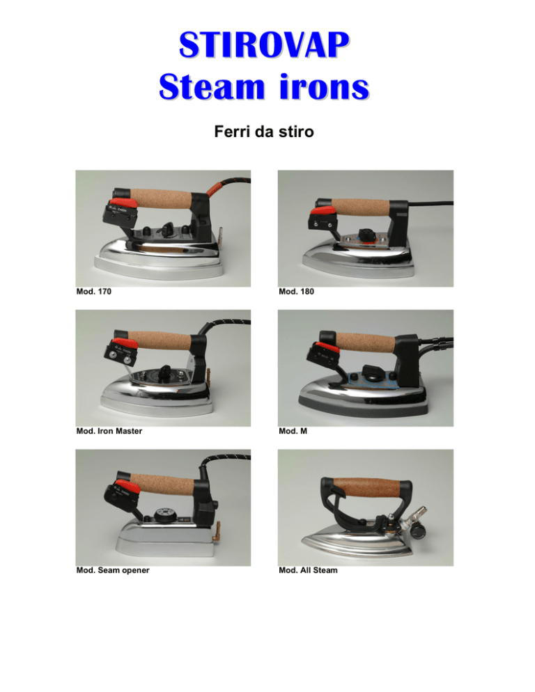 STIROVA P Ste a m i rons Ferri da stiro Mod. 170 Mod. 180 Mod. Iron Master Mod. M Mod. Seam opener Mod. All Steam MOD. 170 : Ironing steam iron for industrial use having the following main features: high flow ironing plate in aluminium, ergonomic cork handle, outer armoured heater 800W and safety thermic fuse preventing, in case of failure, dangerous temperatures. It is available in different versions of weight from 1,8 – 2,0 – 2,3 Kg. Available as dry iron too ( without steam ). MOD. 180 : Ironing steam iron for industrial use having the following main features: high flow ironing plate in aluminium, ergonomic cork handle, outer armoured heater 850W cast into the ironing plate and safety thermic fuse preventing, in case of failure, dangerous temperatures. It is available in different versions of weight from 1,5 – 1,7 – 1,9 Kg. Available as dry iron too ( without steam ). MOD. Iron Master : Ironing steam iron for industrial use having the following main features: high flow ironing plate in aluminium, ergonomic cork handle, outer armored heater 800W and safety thermic fuse preventing, in case of failure, dangerous temperatures. It is available in different versions of weight from 2,0 – 3,0. MOD. M : Ironing steam iron for industrial use having the following main features: very high flow ironing plate in bronze and very good distribution of thermal energy on the whole surface of the iron , ergonomic cork handle, outer armored heater and safety thermic fuse preventing, in case of failure, dangerous temperatures. It is available in different versions of weight from 3,4 – 4,6 Kg. MOD. Seam opener : Ironing steam iron for industrial use 1,2 Kg. made especially for opening seams having the following main features: high flow ironing plate in aluminium, ergonomic cork handle, outer armored heater 600W cast into the ironing plate and safety thermic fuse preventing, in case of failure, dangerous temperatures. MOD. All Steam : Ironing iron for industrial use 1,3 Kg. heated with steam, this allows the ironing plate to work with lower temperatures to avoid, working with certain clothes, “ to polish “ the clothes and more, without heater, there is an important power saving. The main features are: high flow ironing plate in aluminium, ergonomic cork handle. MOD. 170 : Fer à repasser à vapeur pour l’usage industriel dont les caracteristiques les plus importantes sont: plaque repassante en aluminium haute fluidité, poignée ergonomique en liege, resistance cuirassée 800W à l’exterieur et fusible thermique de sureté qui empeche, en cas de panne, d’atteindre temperatures dangereuses. Il est disponible avec differentes versions de poids à partir de 1,8 – 2,0 – 2,3 Kg. Aussi disponible dans la version à sec ( sans vapeur ). MOD. 180 : Fer à repasser à vapeur pour l’usage industriel dont les caracteristiques les plus importantes sont: plaque repassante en aluminium haute fluidité, poignée ergonomique en liege, resistance cuirassée 850W fondue à l’interieur de la plaque repassante et fusible thermique de sureté qui empeche , en cas de panne, d’atteindre temperatures dangereuses. Il est disponible avec differentes versions de poids à partir de 1,5 – 1,7 – 1,9 Kg. Aussi disponible dans la version à sec ( sans vapeur ). MOD. Iron Master : Fer à repasser à vapeur pour l’usage industriel dont les caracteristiques les plus importantes sont: plaque repassante en aluminium haute fluidité, poignée ergonomique en liege, resistance cuirassée 800W à l’exterieur et fusible thermique de sureté qui empeche , en cas de panne, d’atteindre temperatures dangereuses. Il est disponible avec differentes versions de poids à partir de 2,0 – 3,0 Kg. MOD. M : Fer à repasser à vapeur pour l’usage industriel dont les caracteristiques les plus importantes sont: plaque repassante en bronze à garantie de très haute fluidité et de bonne distribution de la chaleur sur tout le plateau du fer, poignée ergonomique en liege, resistance cuirassée à l’exterieur et fusible thermique de sureté qui empeche , en cas de panne, d’atteindre temperatures dangereuses. Il est disponible avec differentes versions de poids à partir de 3,4 – 4,6 Kg. MOD. Seam opener : Fer à repasser à vapeur pour l’usage industriel 1,2 Kg. fabriqué à dessein pour l’ouverture des coutures dont les caracteristiques les plus importantes sont : plaque repassante en aluminium haute fluidité, poignée ergonomique en liege, resistance cuirassée 600W fondue à l’interieur de la plaque repassante et fusible thermique de sureté qui empeche , en cas de panne, d’atteindre temperatures dangereuses. MOD. All Steam : Fer à repasser pour l’usage industriel 1,3 Kg. chauffé à vapeur, cette caracteristique donne à la plaque repassante la possibilité de travailler avec temperature plus basse et donc d’empecher, en travaillant sur certains tissues, de donner le “ Lustre “ au tissue, en plus sans la resistance il y a une economie d’energie. Les caracteristiques les plus importantes sont: plaque repassante en aluminium haute fluidité, poignée ergonomique en liege. Mod. 170 Mod. 180 220 Voltage V Voltage V Power W Puissance W Weight kg Poids kg Mod. M 200 215 235 116 118 120 MOD. Iron Master 120 Mod. 170 MOD. 170 MOD. 180 MOD. Iron Master MOD. M MOD. Seam Open MOD. All Steam 230 230 230 230 230 - 800 850 800 800 600 - 1,8 -2 -2,3 1,5-1,7-1,9 2-3 3,4 – 4,6 1,2 1,3 I dati contenuti in questo catalogo sono indicative e possono essere variati in qualsiasi momento senza preavviso. Les details techniques contenus dans ce catalogue sont indicatifs et peuvent etre changes sans aucun préavis de notre part.