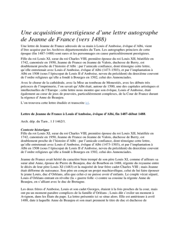 Lettre de Jeanne de France à Louis d'Amboise, évêque d’Albi, fin 1487-début 1488.