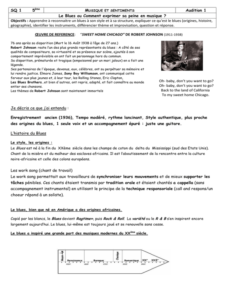 SQ 1 5ème MUSIQUE ET SENTIMENTS Audition 1 Le Blues ou Comment exprimer sa peine en musique ? Objectifs : Apprendre à reconnaitre un blues à son style et à sa structure, expliquer ce qu‘est le blues (origines, histoire, géographie), identifier les instruments, différencier thème et improvisation, question et réponse. ŒUVRE DE REFERENCE: “SWEET HOME CHICAGO” DE ROBERT JOHNSON (1911-1938) 76 ans après sa disparition (Mort le 16 Août 1938 à l’âge de 27 ans.) Robert Johnson reste l’un des plus grands représentants du blues : A côté de ses qualités de compositeurs, sa virtuosité et sa présence sur scène, ajoutés à son comportement imprévisible en ont fait un personnage hors du commun. Sa disparition, prématurée et tragique (empoisonné par un mari jaloux) en a fait une légende. Ses partenaires de l'époque, devenus, eux, célèbres, ont su perpétuer sa mémoire et lui rendre justice. Elmore James, Sony Boy Williamson, ont communiqué cette ferveur aux plus jeunes et, à leur tour, les Rolling Stones, Eric Clapton, Les Blues Brothers…et bien d'autres, ont repris, adapté, et fait connaître au monde entier ses chansons. Les thèmes de Robert Johnson sont maintenant immortels Oh- baby, don't you want to go? Oh- baby, don't you want to go? Back to the land of California To my sweet home Chicago. Je décris ce que j’ai entendu : Enregistrement ancien (1936), Tempo modéré, rythme lancinant, Style authentique, plus proche des origines du blues, 1 seule voix et un accompagnement épuré : juste une guitare. L’histoire du Blues Le style, les origines : Le Blues est né à la fin du XXème siècle dans les champs de coton du delta du Mississippi (sud des Etats Unis). Chant de la misère et du malheur des esclaves africains. Il est l’aboutissement de la rencontre entre la culture noire-africaine et celle des colons européens. Les work song (chant de travail) Le work song permettait aux travailleurs de synchroniser leurs mouvements et de mieux supporter les tâches pénibles. Ces chants étaient transmis par tradition orale et étaient chantés a cappella (sans accompagnement instrumental) en utilisant le principe de la technique responsoriale (call and respons/un choeur répond à un soliste). Le blues, bien que né en Amérique a des origines africaines. Copié par les blancs, le Blues devient Ragtime», puis Rock & Roll. La variété ou le R & B s’en inspirent encore largement aujourd’hui. Le blues, lui-même est toujours joué et se renouvelle sans cesse. Le blues a inspiré une grande part des musiques modernes du XX ème siècle. A quoi reconnait-on un blues ? Entrainez-vous à écouter du blues et à retrouver les points soulignés ci-dessous. Cela vous sera utile pour l’évaluation écrite ! Au rythme Le blues est souvent synonyme de tempo medium voire lent. A l’harmonie Le blues est constitué de peu d’accords. Il est souvent articulé autour de 3 accords, parfois même d’un seul (on parle alors de blues linéaire) A la mélodie La mélodie d'une gamme blues traditionnelle est une gamme pentatonique (5 notes) à laquelle on ajoute une (ou deux) « blue note » c’est cette note qui donne le côté triste de la mélodie. Aux répétitions des paroles C’est ce qu’on appelle la forme poétique du blues, comme dans la chanson SWEET HOME CHICAGO Robert Johnson que nous avons écouté en cours. C’est ce qu’on appelle une forme AAB : Oh- baby, don't you want to go? (A) Oh- baby, don't you want to go? (A) Back to the land of California to my sweet home Chicago. (B) Aux instruments Bien que le blues puisse être interprété sur tout type d'instruments, certains sont traditionnellement plus utilisés que d'autres - La guitare L’harmonica La voix Le piano La batterie La wash board ((planche à lessiver, utilisée comme instrument de percussion, frappée par les doigts coiffés de dés à coudre) Au Timbre Au sens large, le timbre est la « couleur » du son : même s'ils jouent les mêmes notes, une guitare ou un saxophone se distinguent par leur timbre. Les bluesmen ont beaucoup exploré le timbre : des voix fortes et graves, rocailleuses (comme enrouées) SQ 1 5ème MUSIQUE ET SENTIMENTS Le Blues ou Comment exprimer sa peine en musique ? Audition 2 Œuvres périphériques : autres styles, autres pays Œuvre périphérique 1 : Adios nonino d’Astor Piazzolla (1921-1992) Je décris ce que j’ai entendu : Piano, violoncelle, violon, bandonéon, flûte traversière, contrebasse. Genre : Tango Epoque : XXème siècle Le Tango : DANSE de couple et genre musical né à la fin du XIXe siècle en originaire de la communauté noire d'Amérique latine issue de l'esclavage. Argentine. Le terme tango est C'est une danse d'improvisation, les pas ne sont pas prévus à l'avance. le tango intègre souvent le bandonéon au sein de l’orchestre le tango incarne les traits essentiels de l'Argentine, où il est né : la nostalgie, la rancœur et le tragique. Cette musique latine est à la fois rythme, danse et paroles. Son histoire est faite d'emprunts, de métissages et de recompositions. Œuvre périphérique 2 : Lacrimosa - Requiem en ré mineur (KV 626) de Wolfgang Amadeus Mozart (1756-1791) Je décris ce que j’ai entendu : Dans le Lacrimosa on retrouve seulement un chœur à quatre voix et un orchestre symphonique réduit. La sonorité de l'orchestre doit beaucoup aux timbres souples et graves des cors de basset et des cordes. L'orchestration, sobre, renforce la gravité et la transparence de l'œuvre, et crée une atmosphère sombre et austère. Genre : Requiem (Messe) Epoque : C AUTO EVALUATION Je sais…. Reconnaitre un blues à son style et à sa structure Expliquer ce qu’est le blues (origines historiques et géographiques) Identifier les instruments utilisés traditionnellement dans le blues Ce qu’est une grille et un accord Différencier section mélodique et section rythmique, Thème et improvisation, questions et réponses Identi