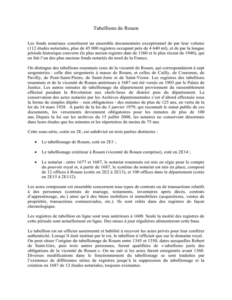 Tabellions de Rouen Les fonds notariaux constituent un ensemble documentaire exceptionnel de par leur volume (112 études notariales, plus de 45 000 registres occupant près de 4 640 ml), et de par la longue période historique couverte (le plus ancien registre date de 1360 et le plus récent de 1940), qui en fait l’un des plus anciens fonds notariés du nord de la France. On distingue des tabellions rouennais ceux de la vicomté de Rouen, qui correspondaient à sept sergenteries : celle dite sergenterie à masse de Rouen, et celles de Cailly, de Couronne, de Pavilly, de Pont-Saint-Pierre, de Saint-Joire et de Saint-Victor. Les registres des tabellions rouennais et de la vicomté de Rouen antérieurs à 1687 ont été versés en 1903 par le Palais de Justice. Les autres minutes de tabellionage du département proviennent du rassemblement effectué pendant la Révolution aux chefs-lieux de district puis du département. La conservation des actes notariés par les Archives départementales s’est d’abord effectuée sous la forme de simples dépôts – non obligatoires - des minutes de plus de 125 ans, en vertu de la loi du 14 mars 1928. A partir de la loi du 3 janvier 1979, qui reconnaît le statut public de ces documents, les versements deviennent obligatoires pour les minutes de plus de 100 ans. Depuis la loi sur les archives du 15 juillet 2008, les notaires ne conservent désormais dans leurs études que les minutes et les répertoires de moins de 75 ans. Cette sous-série, cotée en 2E, est subdivisé en trois parties distinctes : Le tabellionage de Rouen, coté en 2E1 ; Le tabellionage extérieur à Rouen (vicomté de Rouen comprise), coté en 2E14 ; Le notariat : entre 1677 et 1687, le notariat rouennais est mis en régie pour le compte du pouvoir royal et, à partir de 1687, le système du notariat est mis en place, composé de 12 offices à Rouen (cotés en 2E2 à 2E13), et 100 offices dans le département (cotés en 2E15 à 2E112). Les actes composant cet ensemble concernent tous types de contrats ou de transactions relatifs à des personnes (contrats de mariage, testaments, inventaires après décès, contrats d’apprentissage, etc.) ainsi qu’à des biens mobiliers et immobiliers (acquisitions, ventes de propriétés, transactions commerciales, etc.). Ils sont reliés dans des registres de façon chronologique. Les registres de tabellion en ligne sont tous antérieurs à 1600. Seule la moitié des registres de cette période sont actuellement en ligne. Des mises à jour régulières alimenteront cette base. Le tabellion est un officier assermenté et habilité à recevoir les actes privés pour leur conférer authenticité. Lorsqu’il était institué par le roi, le tabellion n’officiait que sur le domaine royal. On peut situer l’origine du tabellionage de Rouen entre 1345 et 1350, dates auxquelles Robert de Saint-Gire, puis trois autres personnes, furent qualifiées de « tabellions jurés des obligations de la vicomté de Rouen ». On ne sait si les actes furent enregistrés avant 1360. Diverses modifications dans le fonctionnement du tabellionage se sont traduites par l’existence de différentes séries de registres jusqu’à la suppression du tabellionage et la création en 1687 de 12 études notariales, toujours existantes. Dans cette sous-série, cotée 2E1, on trouve plusieurs typologies de documents : les registres en parchemin, les « meubles 1ère série » et les « héritages 1ère série », les « meubles 2ème série » et les « héritages 2ème série », les « meubles et héritages » et enfin les registres classés par nom de tabellion. Les tabellions transcrivaient sur plusieurs registres les actes, selon leur nature (voir la rubrique « Aide » du champ de saisie « Typologie »). La difficulté que présentent les recherches dans le tabellionage tient au fait que certaines catégories d’actes peuvent, selon leur sujet ou l’évolution de la règlementation, passer d’une série à une autre. Les registres de tabellion en ligne sont tous antérieurs à 1600. Seule la moitié des registres de cette période sont actuellement en ligne. Des mises à jour régulières alimenteront cette base. Rubriques « Aide » : - Typologie du document : Registres en parchemin, parfois appelés cartulaires : transcriptions d’actes rédigées sur des feuilles volantes qui n’ont pas été conservées. Les actes en matière immobilière n’y étaient pas enregistrés, du moins à partir du XVIe siècle. L’instauration, par l’ordonnance d’Henri III en 1581, du contrôle des actes pour les modifications de la propriété immobilière, fut sans doute, par les garanties qu’elle donnait, l’une des causes de la suppression des transcrits sur parchemin du tabellionage. Meubles : apparus au milieu du XVIe siècle, ces registres comprennent tous les actes de vente de marchandises et autres transactions commerciales, en particulier maritimes, les procurations, les reconnaissances et quittances de dettes, les baux à ferme, les loyers, les baux à dîme, les tutelles, les testaments, etc. Héritages : registres comprenant les actes relatifs aux biens « propres » ou biens patrimoniaux d’une personne, c’est-à-dire essentiellement les biens immobiliers qui se transmettent par succession et qui ne peuvent en aucun cas, en Normandie, être transmis par testament ou par donation à cause de mort. On y trouve des ventes et transactions diverses sur les terres et les maisons, contrats de mariage, lots et partages, actes de successions, contrats de fiefs, les rentes hypothèques, rentes foncières, les décrets, etc. Il faut noter que les contrats de mariage et les lots et partages se trouvent toujours dans les héritages « 2ème série ». Registres classés par nom de tabellion : après 1650, les tabellions rouennais prennent l’habitude de conserver individuellement leurs minutes, ce qui explique l’apparition de cette pratique, jugée illégale par 