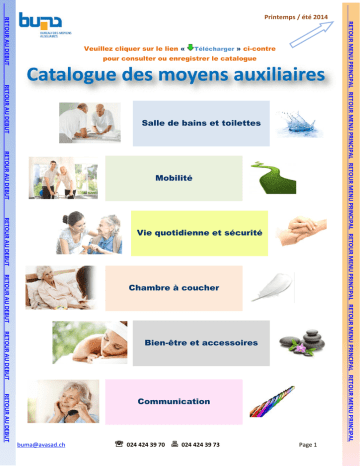 Veuillez cliquer sur le lien « Télécharger » ci-contre pour consulter ou enregistrer le catalogue RETOUR AU DEBUT Salle de bains et toilettes RETOUR AU DEBUT Mobilité RETOUR AU DEBUT Vie quotidienne et sécurité RETOUR AU DEBUT Chambre à coucher RETOUR AU DEBUT RETOUR AU DEBUT RETOUR MENU PRINCIPAL RETOUR MENU PRINCIPAL RETOUR MENU PRINCIPAL RETOUR MENU PRINCIPAL RETOUR MENU PRINCIPAL RETOUR MENU PRINCIPAL RETOUR AU DEBUT Printemps / été 2014 Bien-être et accessoires Communication [email protected] 024 424 39 70 024 424 39 73 Page 1 RETOUR AU DEBUT RETOUR AU DEBUT RETOUR AU DEBUT [email protected] RETOUR AU DEBUT En Chamard 55B, 1442 Montagny-p/-Yverdon RETOUR AU DEBUT Page 2 024 424 39 73 RETOUR AU DEBUT [email protected] 024 424 39 70 RETOUR MENU PRINCIPAL RETOUR MENU PRINCIPAL RETOUR MENU PRINCIPAL RETOUR MENU PRINCIPAL RETOUR MENU PRINCIPAL RETOUR MENU PRINCIPAL RETOUR AU DEBUT 024 424 39 70 024 424 39 73 Douche et toilette Page 5 WC Page 6 Chaises percées Page 7 Barres d’appui Page 7 Rollators et scooter Page 8-9 RETOUR AU DEBUT Cadres de marche Page 9 Fauteuils roulants Page 10 Cannes Page 11 Seuils Page 12 Aides aux activités journalières Page 12-13 Aides aux transferts Page 14-15 Lit et accessoires Page 15-16 Coussins Page 17-18 Coffres à clés Page 18 Chaises de travail Page 19 Entrainement et bien-être Page 19 Aides à la communication Page 20 RETOUR AU DEBUT RETOUR AU DEBUT RETOUR AU DEBUT [email protected] 024 424 39 70 024 424 39 73 Page 3 RETOUR MENU PRINCIPAL RETOUR MENU PRINCIPAL RETOUR MENU PRINCIPAL RETOUR MENU PRINCIPAL RETOUR MENU PRINCIPAL RETOUR MENU PRINCIPAL 4 RETOUR AU DEBUT Page RETOUR AU DEBUT RETOUR AU DEBUT Baignoire Vente Loc. Prix TTC 05.04.0869.0.FRE 05.04.0874.0.FRE RETOUR AU DEBUT 05.04.0869.0.ALT 05.04.0866.0.SAV RETOUR AU DEBUT 05.04.0884.0.DER Planche de bain FRESH 69 cm Planche de bain FRESH 74 cm Planche de bain ALTON 69 cm (en métal, max 190 Kg) Planche de bain Savanah 66 cm (5 lattes) Planche de bain à fixer au mur (longueur 84 cm) 68.74.- 170.- 100.230.- RETOUR AU DEBUT RETOUR AU DEBUT 05.04.0245.0 Siège de bain pivotant B&B 300.- 05.06.0140.0 Siège de douche Siesta 129.- 05.04.0120.0.ELE LIFT de bain AQUATEC 950.- 05.04.0260.0. Tabouret de bain ECO 05.04.0610. Marche pied PRIMA BATH STEP 05.04.1000.0 78.- Bande anti-glisse STRIPS 20 pces 8.- (facile à coller au fond de la baignoire) RETOUR AU DEBUT 99.00.0001.0.MAUX Planche de bain BB 80 cm 99.00.0001.0.MAUX Banc de transfert Vermeiren Kate RETOUR AU DEBUT [email protected] 112.- 024 424 39 70 024 424 39 73 80.- 150.- Page 4 85.- RETOUR MENU PRINCIPAL RETOUR MENU PRINCIPAL RETOUR MENU PRINCIPAL RETOUR MENU PRINCIPAL RETOUR MENU PRINCIPAL RETOUR MENU PRINCIPAL RETOUR AU DEBUT Baignoire Prix TTC RETOUR AU DEBUT RETOUR AU DEBUT RETOUR AU DEBUT RETOUR AU DEBUT 05.06.0102 Tabouret de douche Cadiz 90.- 20.- 05.06.1560.0.EDG Tabouret de douche EDGE 100.- 25.- 05.06.0185.0.RON Tabouret de douche rond ETAC 100.- 05.06.0180.0 Tabouret de douche rond DELPHI 05.06.0196.0 Tabouret de douche SWIFT 05.06.0194.0 Accoudoirs pour tabouret de douche SWIFT (la paire) 05.06.0197.0. Tabouret de douche SWIFT + accoudoirs + dossier 210.- 05.06.0104. Siège de douche en U + dossier 178.- 05.06.0150.0. Siège de douche mural AQUATEC 200.- 05.06.0160.0 79.- 110.- 50.- Siège de douche mural PROMED (sans pieds) RETOUR AU DEBUT RETOUR AU DEBUT 05.06.0101.3.HAU Chaise haute assis-debout pour la toilette au lavabo, avec accoudoirs 05.06.0120.0.ROU Chaise de douche à roulettes 05.06.0121.0.SCE Bassin pour chaise ETAC [email protected] 024 424 39 70 ETAC (+ fixation) 024 424 39 73 190.- 225.- 25.- 650.- 60.- 119.- 10.- Page 5 RETOUR MENU PRINCIPAL RETOUR MENU PRINCIPAL RETOUR MENU PRINCIPAL RETOUR MENU PRINCIPAL RETOUR MENU PRINCIPAL RETOUR MENU PRINCIPAL RETOUR AU DEBUT Douche et toilette Prix TTC RETOUR AU DEBUT 05.11.0506.0.MOB Rehausse WC Mobilex 5 cm 60.- 05.11.0516.0.MOB Rehausse WC Mobilex 10 cm 65.- 05.11.0504.0.MOB Rehausse WC Mobilex 10 cm 85.- avec couvercle 05.11.0503.0.MOB Rehausse WC Mobilex 5 cm avec couvercle 85.- RETOUR AU DEBUT 05.11.0520. Rehausse WC ASHBY 15 cm 05.11.0556.0.TSE Rehausse WC Hi-LOO TSE, (Réglable 8-12-16 cm) 150.- 05.11.0550 05.11.0555 Rehausse WC Hi-LOO Fix II 6 cm Rehausse WC Hi-LOO Fix II 10 cm 125.145.- 05.11.0550.0 RETOUR AU DEBUT 05.11.0555.0 Rehausse WC Hi-LOO Fix II 6 cm avec accoudoirs Rehausse WC Hi-LOO Fix II 10 cm avec accoudoirs 80.- 310.310.- RETOUR AU DEBUT RETOUR AU DEBUT 05.11.0511.0 REHOSOFT en mousse 11 cm 05.13.0100.0. Bidet amovible 05.11.0008. Cadre WC sur pieds avec accoudoirs 190.- 20.- 05.11.0560. Réhausse WC avec cadre et accoudoirs 300.- 30.- 99.00.0001.0.MAUX Réhausse WC avec cadre et accoudoirs ETAC 132.- RETOUR AU DEBUT [email protected] 024 424 39 70 100.- 43.- 024 424 39 73 Page 6 RETOUR MENU PRINCIPAL RETOUR MENU PRINCIPAL RETOUR MENU PRINCIPAL RETOUR MENU PRINCIPAL RETOUR MENU PRINCIPAL RETOUR MENU PRINCIPAL RETOUR AU DEBUT WC Prix TTC RETOUR AU DEBUT 05.10.0230.0.CAN Chaise percée réglable CANDY 270.- 30.- 05.10.0245.0.ROU Chaise percée sur roulettes TSU 330.- 40.- Barres d’appui RETOUR AU DEBUT 05.09.0700.0.310 05.09.0700.0.410 05.09.0700.0.610 05.09.0700.0.810 RETOUR AU DEBUT RETOUR AU DEBUT cm cm cm cm 40.40.50.56.- Barre d'appui en "L" 107.- 05.09.0750.0.55 Barre d’appui relevable 55 cm 130.- 05.09.0750.0.76 Barre d’appui relevable 76 cm 141.- 05.04.0650.0 Poignée BALNEA H160 89.- 05.09.0800.0 Barre ANIMO GARANT 119.- 05.09.0710.0 05.04.0600.0.MOB RETOUR AU DEBUT 05.04.0610.0.MOB 05.04.0620.0.MOB Barre Barre Barre Barre d’appui d’appui d’appui d’appui 31 41 61 81 Prix TTC Poignée à ventouses MOBELI 35 cm Poignée à ventouses MOBELI 11 cm Poignée à ventouses MOBELI télescopique 44-56,5 cm 206.139.252.- D'autres poignées ventouses sont disponibles sur demande ! RETOUR AU DEBUT Les barres de marque NORMBAU en différents formats et dimensions sont également disponibles sur demande ! [email protected] 024 42