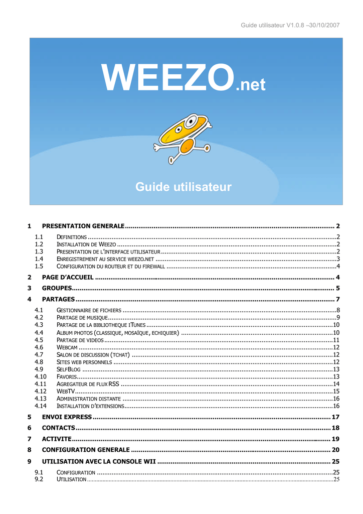 Guide utilisateur V1.0.8 –30/10/2007 WEEZO.net Guide utilisateur 1 PRESENTATION GENERALE.............................................................................................................. 2 1.1 1.2 1.3 1.4 1.5 DEFINITIONS ........................................................................................................................................2 INSTALLATION DE WEEZO ........................................................................................................................2 PRESENTATION DE L’INTERFACE UTILISATEUR ................................................................................................2 ENREGISTREMENT AU SERVICE WEEZO.NET ...................................................................................................3 CONFIGURATION DU ROUTEUR ET DU FIREWALL .............................................................................................4 2 PAGE D’ACCUEIL .............................................................................................................................. 4 3 GROUPES.......................................................................................................................................... 5 4 PARTAGES ........................................................................................................................................ 7 4.1 4.2 4.3 4.4 4.5 4.6 4.7 4.8 4.9 4.10 4.11 4.12 4.13 4.14 GESTIONNAIRE DE FICHIERS .....................................................................................................................8 PARTAGE DE MUSIQUE .............................................................................................................................9 PARTAGE DE LA BIBLIOTHEQUE ITUNES ......................................................................................................10 ALBUM PHOTOS (CLASSIQUE, MOSAÏQUE , ECHIQUIER) ...................................................................................10 PARTAGE DE VIDEOS .............................................................................................................................11 WEBCAM ...........................................................................................................................................12 SALON DE DISCUSSION (TCHAT) ..............................................................................................................12 SITES WEB PERSONNELS ........................................................................................................................12 SELF BLOG .........................................................................................................................................13 FAVORIS............................................................................................................................................13 AGREGATEUR DE FLUX RSS ....................................................................................................................14 WEBTV.............................................................................................................................................15 ADMINISTRATION DISTANTE ...................................................................................................................16 INSTALLATION D ’EXTENSIONS ..................................................................................................................16 5 ENVOI EXPRESS ............................................................................................................................. 17 6 CONTACTS...................................................................................................................................... 18 7 ACTIVITE........................................................................................................................................ 19 8 CONFIGURATION GENERALE ......................................................................................................... 20 9 UTILISATION AVEC LA CONSOLE WII ........................................................................................... 25 9.1 9.2 CONFIGURATION .................................................................................................................................25 UTILISATION ................................................................................................................................................................25 Guide utilisateur V1.0.8 –30/10/2007 1 Présentation générale 1.1 Définitions Poste Weezo : Site Weezo : Serveur : Visiteur : le « Poste Weezo » représente dans le présent document l’ordinateur sur lequel est installé Weezo. le site Weezo est le site web hébergé sur votre ordinateur et généré dynamiquement par Weezo. le site weezo est généré à l’aide d’un serveur Apache qui assure l’interface entre le navigateur du client et l’application Weezo. Ce serveur tourne en parallèle de Weezo de manière transparente. Vous n’avez à aucun moment besoin d’intervenir sur celui-ci. on appelle « visiteur » une personne qui vient se connecter à votre site Weezo. 1.2 Installation de Weezo 1.2.1 Installation à partir de la version zip Décompactez le fichier weezo.zip dans un répertoire… c’est tout. Vous devez posséder les droits d’écriture dans ce répertoire. Il est en particulier déconseillé aux utilisateurs de Vista d’installer la version zip de weezo dans le répertoire « program files », dans lequel Weezo ne pourra sauvegarder ses paramètres ultérieurement. 1.2.2 Installation à l’aide de l’assistant d’installation L’assistant permet de choisir de façon interactive les options d’installation : Dossier de destination : il s’agit du répertoire dans lequel sera installé Weezo Sélection du menu démarrer : permet de mettre un lien vers Weezo dans le menu démarrer Icônes supplémentaires : permet de placer un lien vers Wee